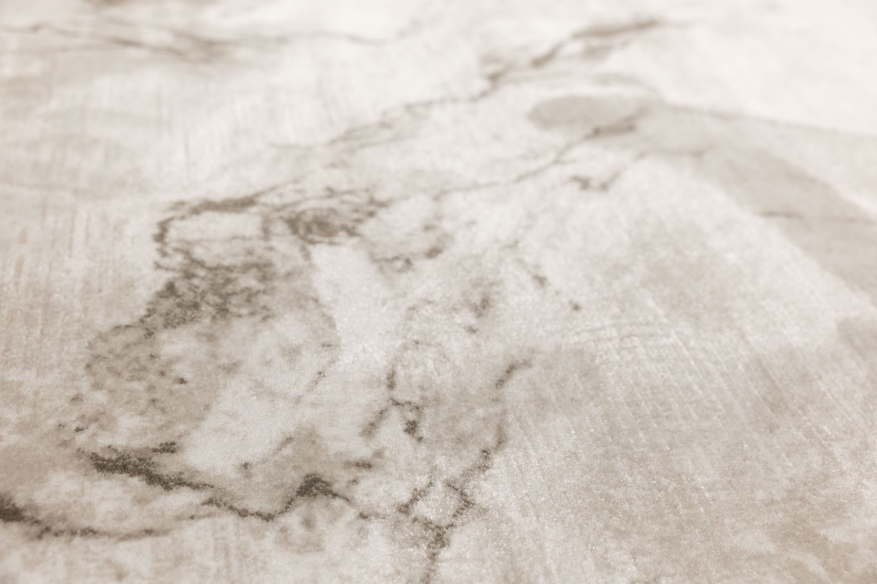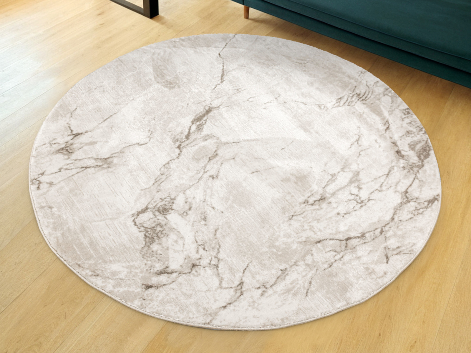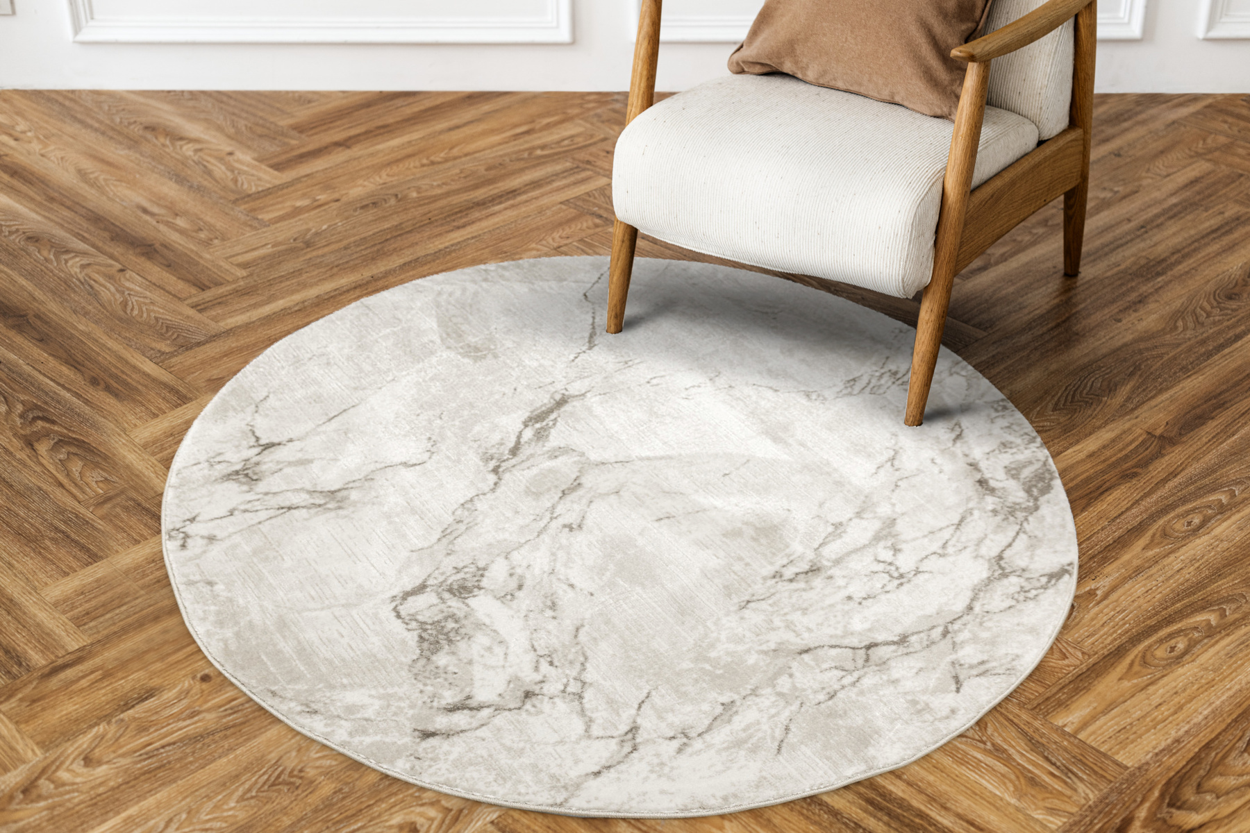 - Okrągły luksusowy dywan Nantes o mięciutkim, lekko lśniącym, dwupoziomowym runie z przecieranym wzorem imitującym taflę marmuru, w odcieniach szarości zmieszanej z beżem z akcentami kremu, ze spodem wykończonym bawełną.