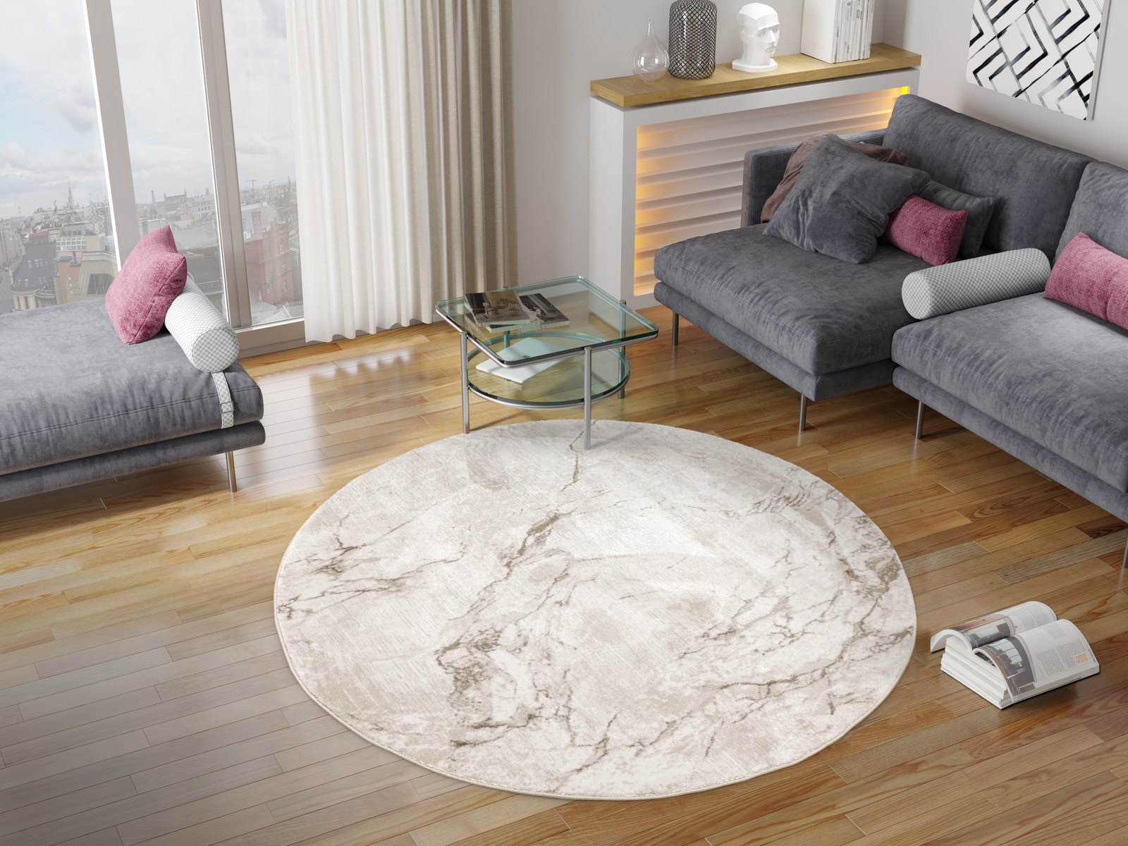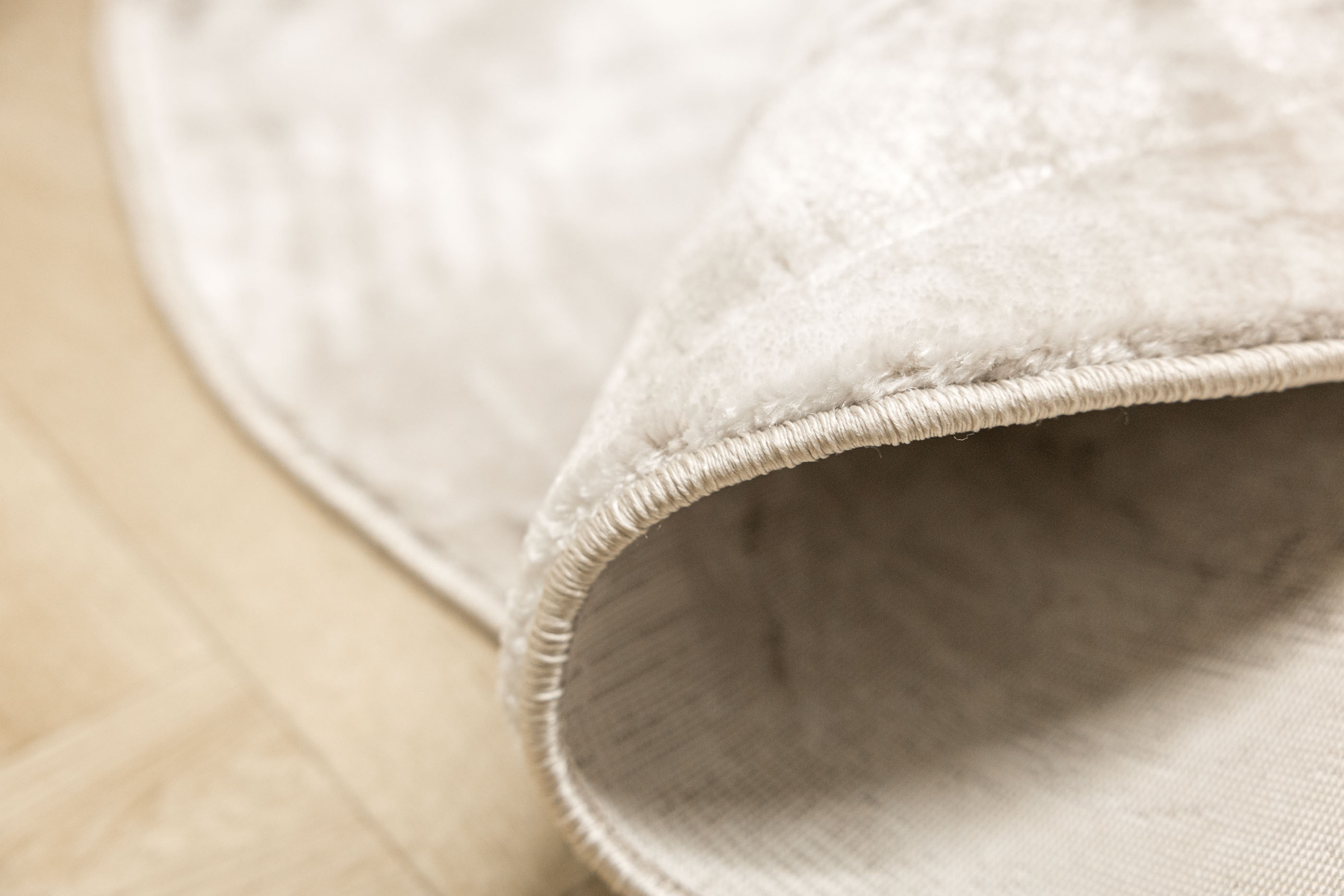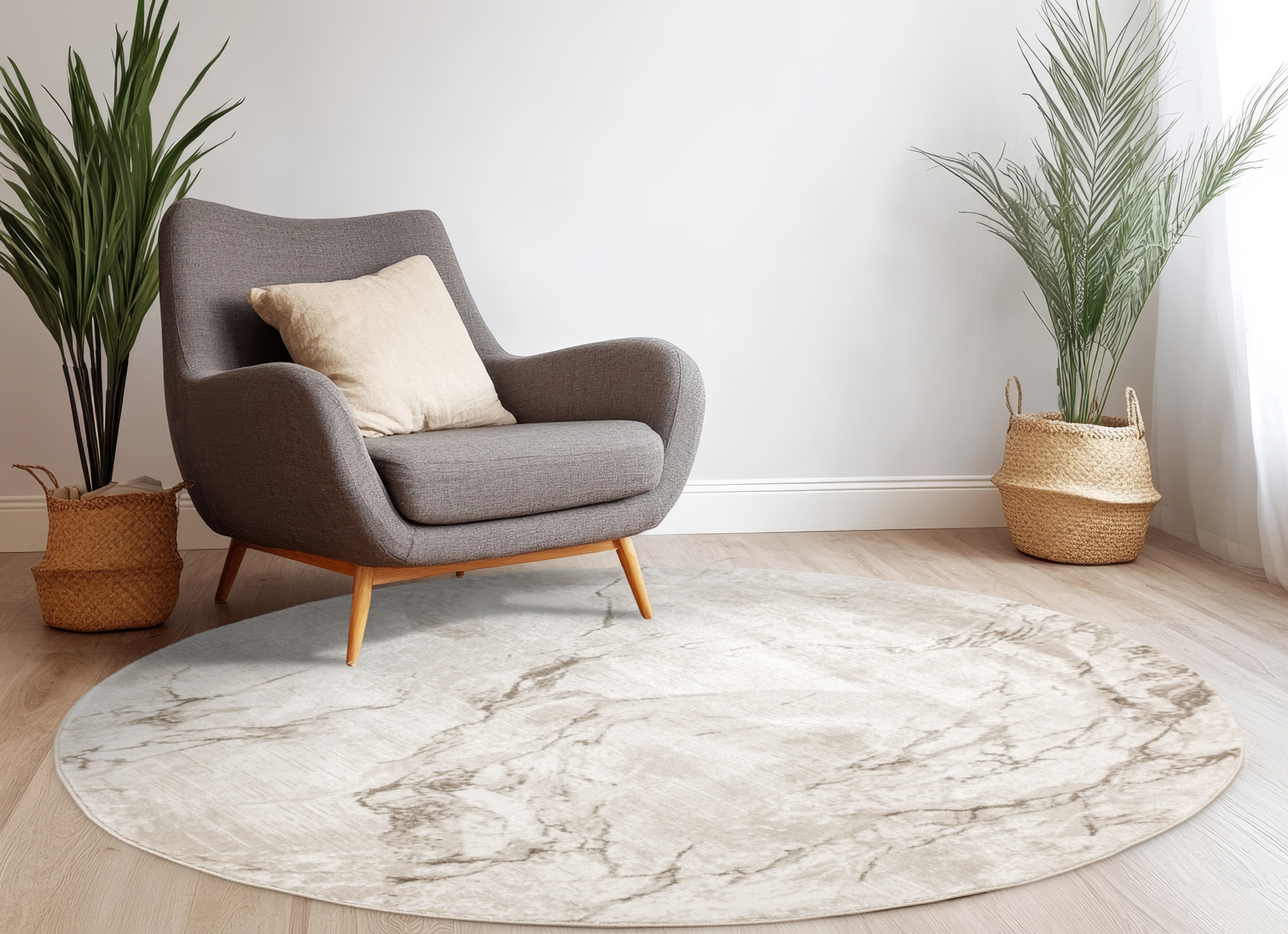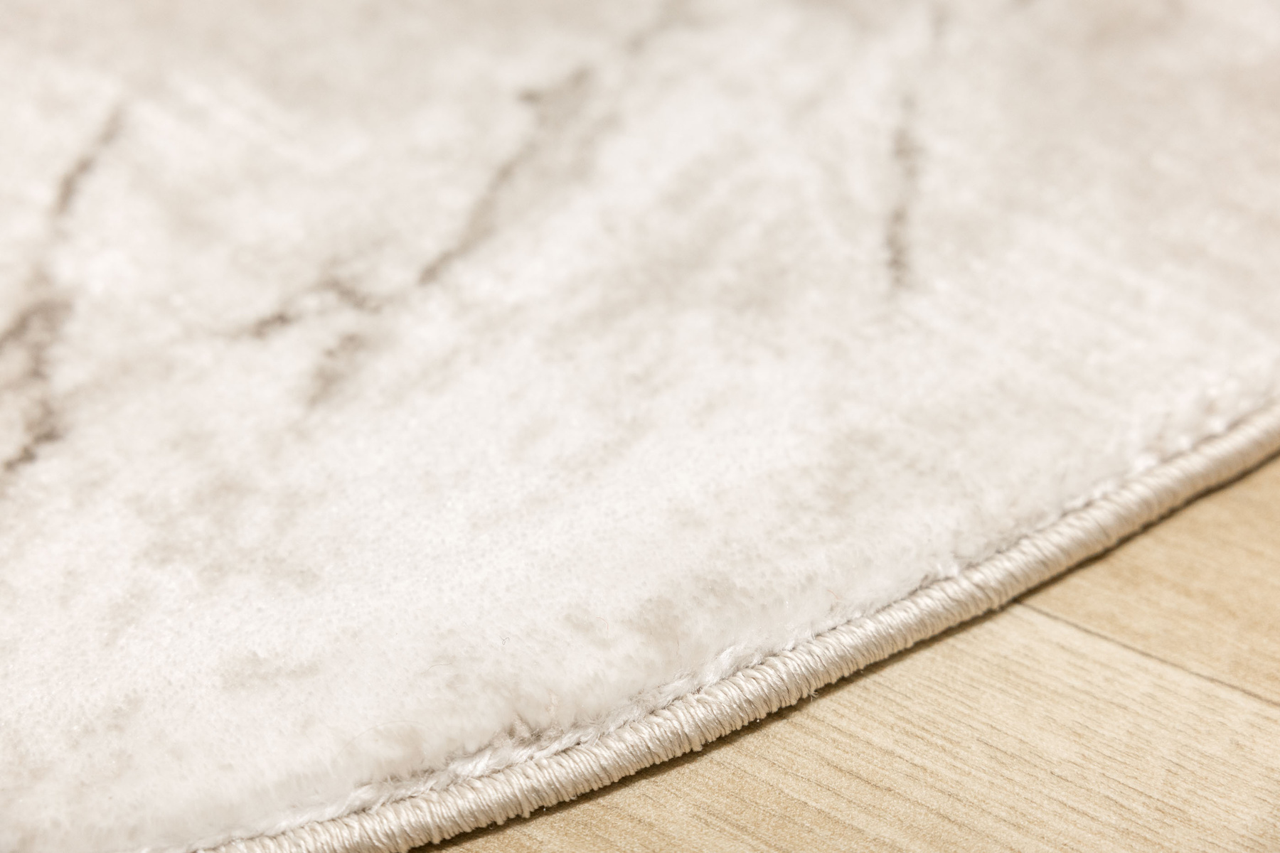 - Okrągły luksusowy dywan Nantes o mięciutkim, lekko lśniącym, dwupoziomowym runie z przecieranym wzorem imitującym taflę marmuru, w odcieniach szarości zmieszanej z beżem z akcentami kremu, ze spodem wykończonym bawełną.