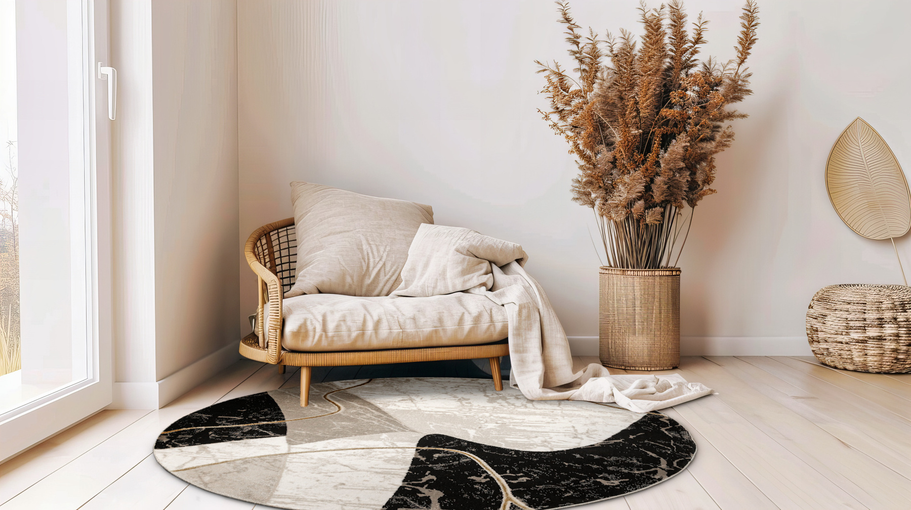 Dywan okrągły Kashmir to wyjątkowy dodatek do aranżacji wnętrz, łączący w sobie nowoczesność i elegancję.