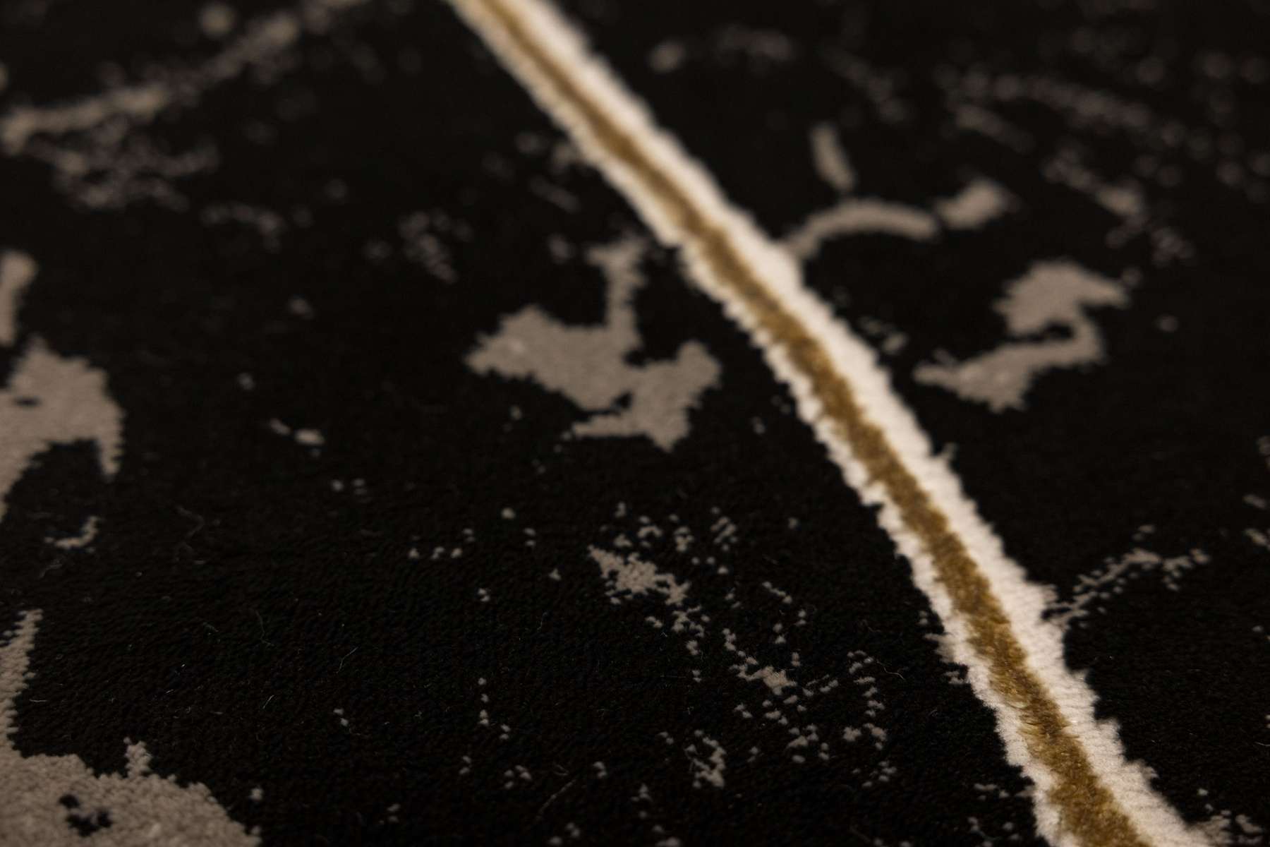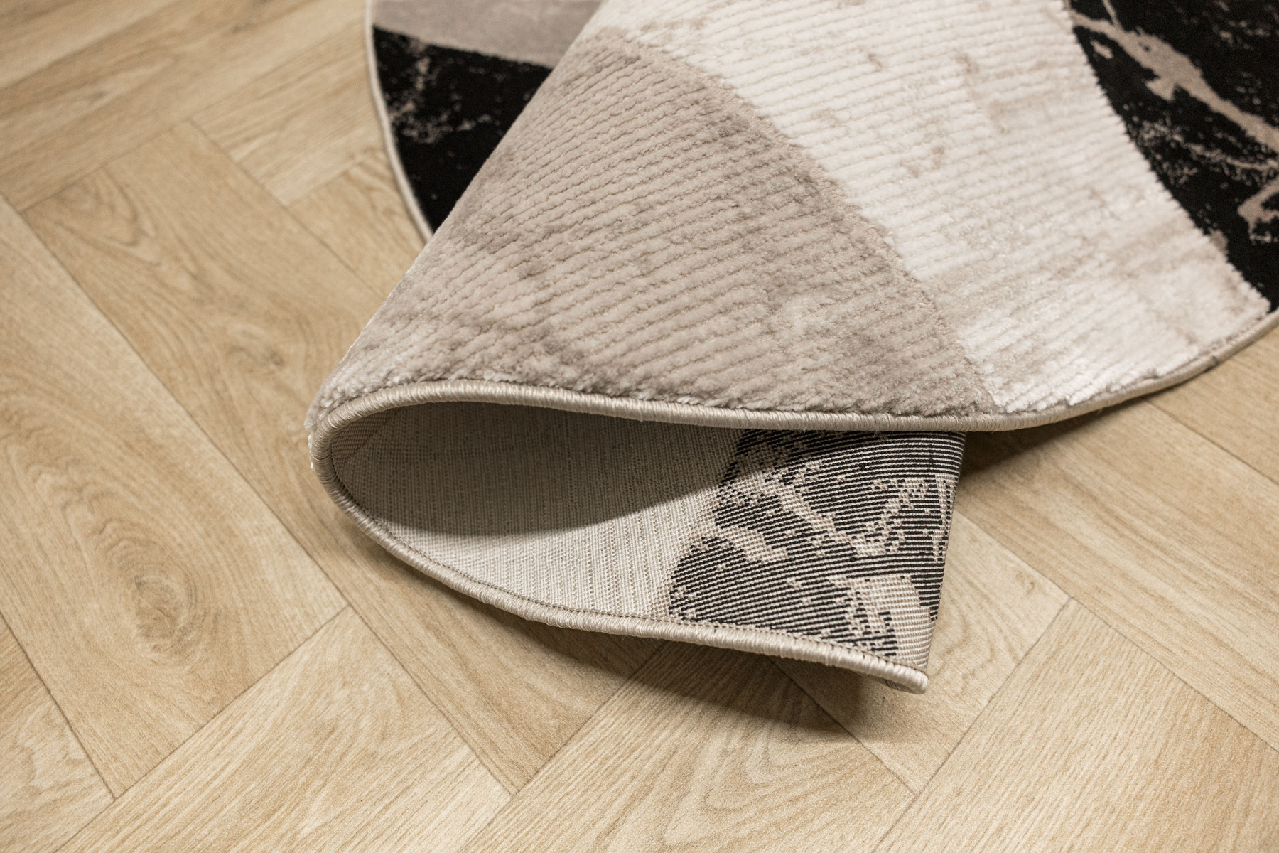 • Okrągły luksusowy dywan Kashmir o mięciutkim, lekko lśniącym, dwupoziomowym runie z przecieranym wzorem imitującym taflę marmuru, w odcieniach szarości zmieszanej z beżem z akcentami kremu, czerni i złota, ze spodem wykończonym bawełną.
