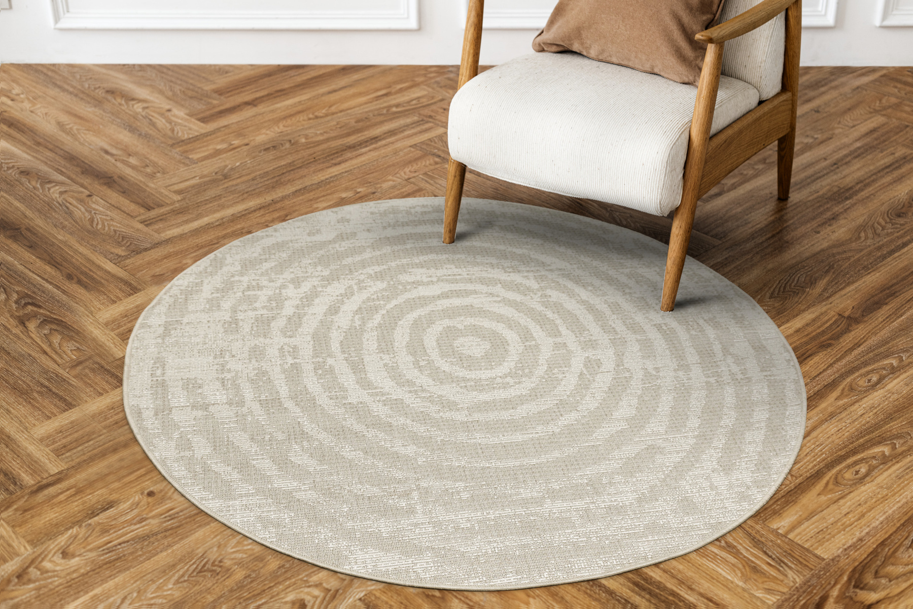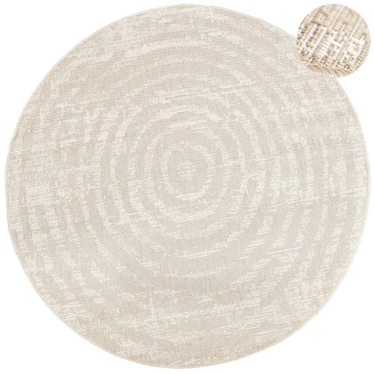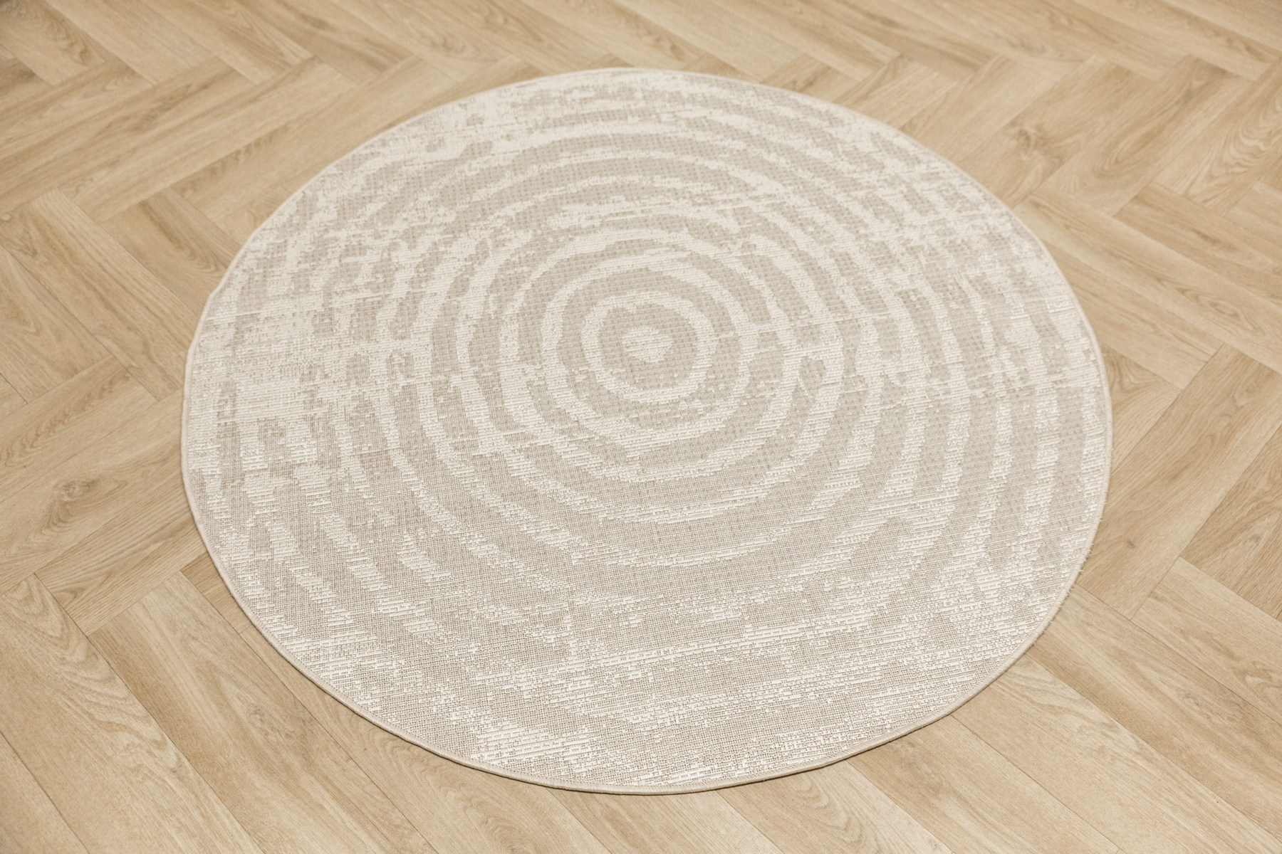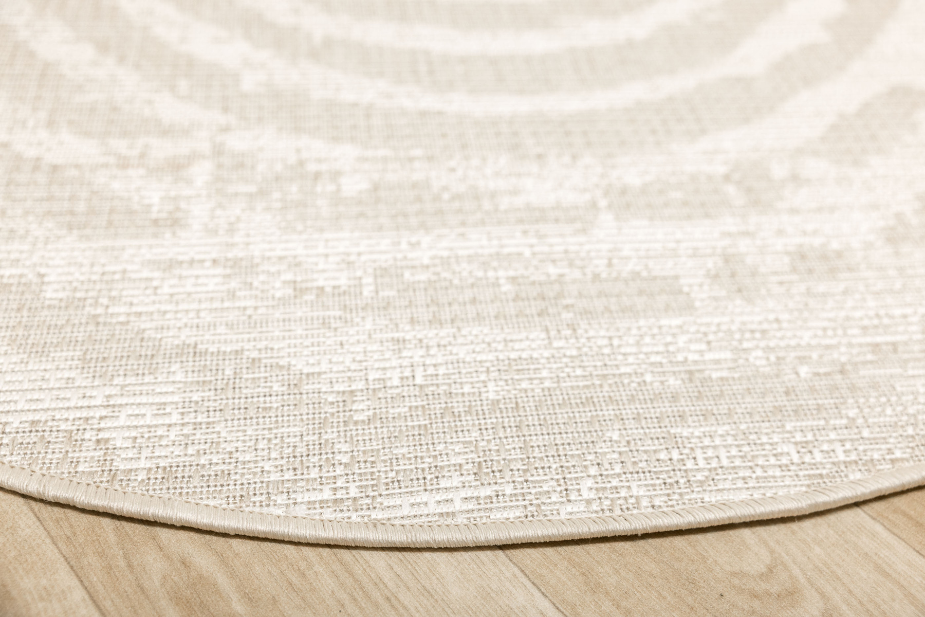 - Okrągły dywan sznurkowy Haga z geometrycznym wzorem z motywem okręgów w odcieniach kremu i beżu, który może być stosowany zarówno wewnątrz jak i na zewnątrz.