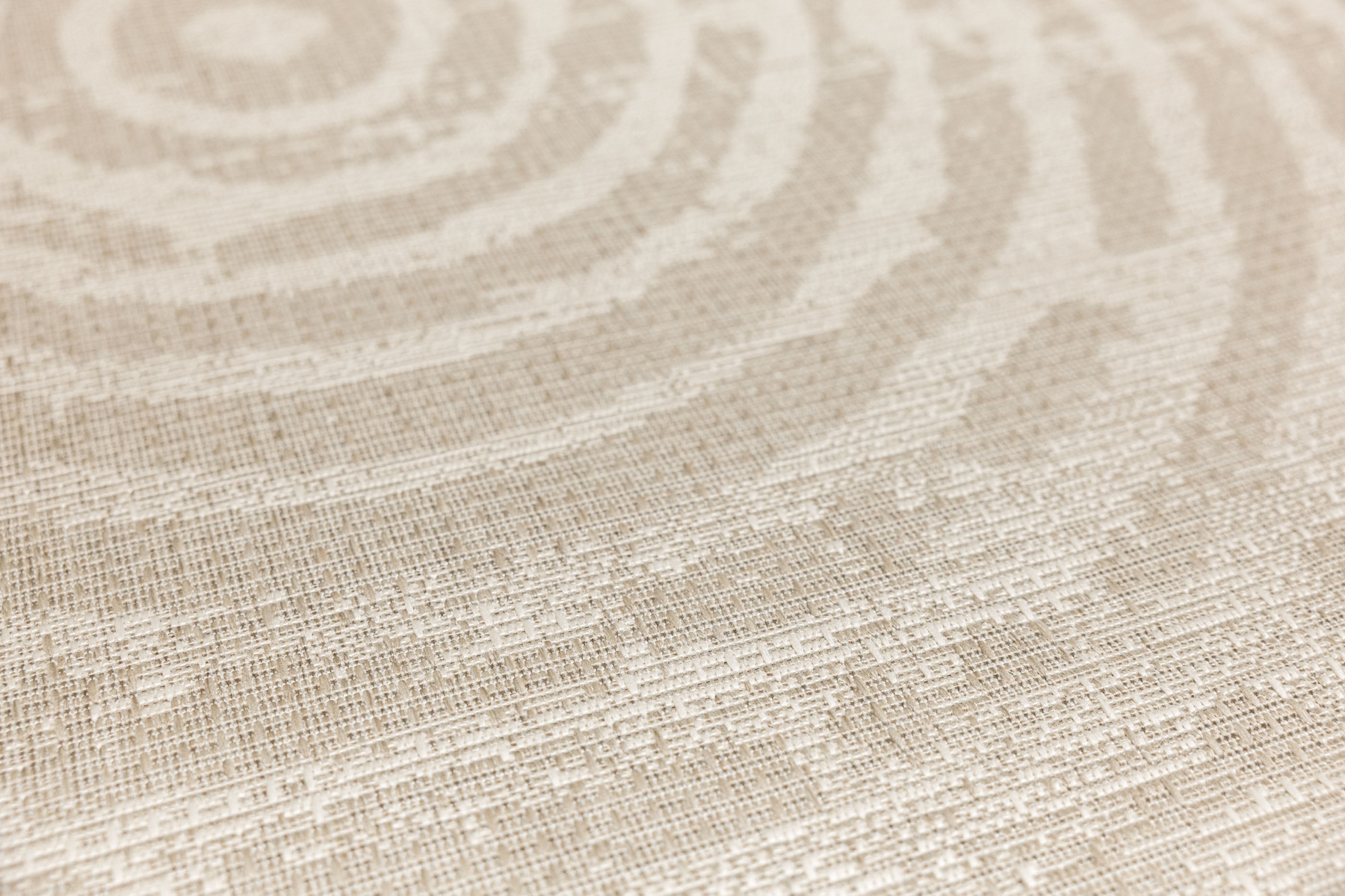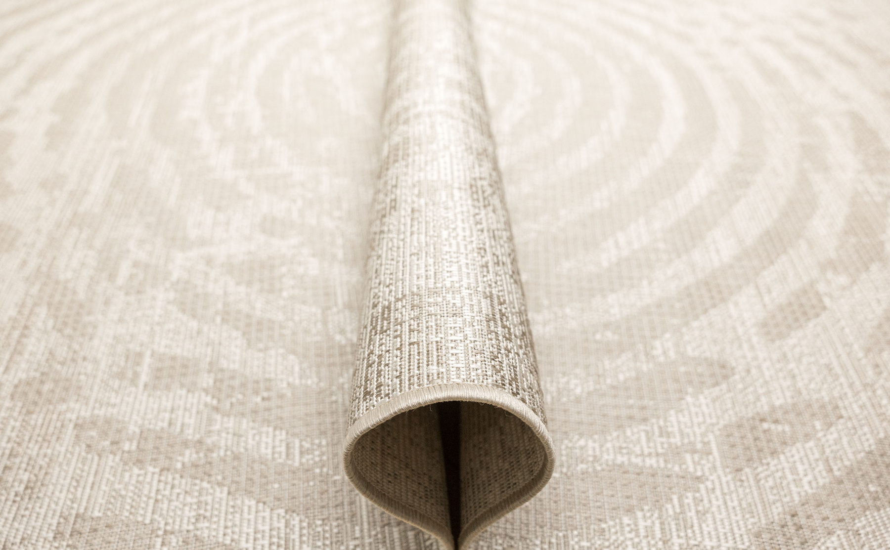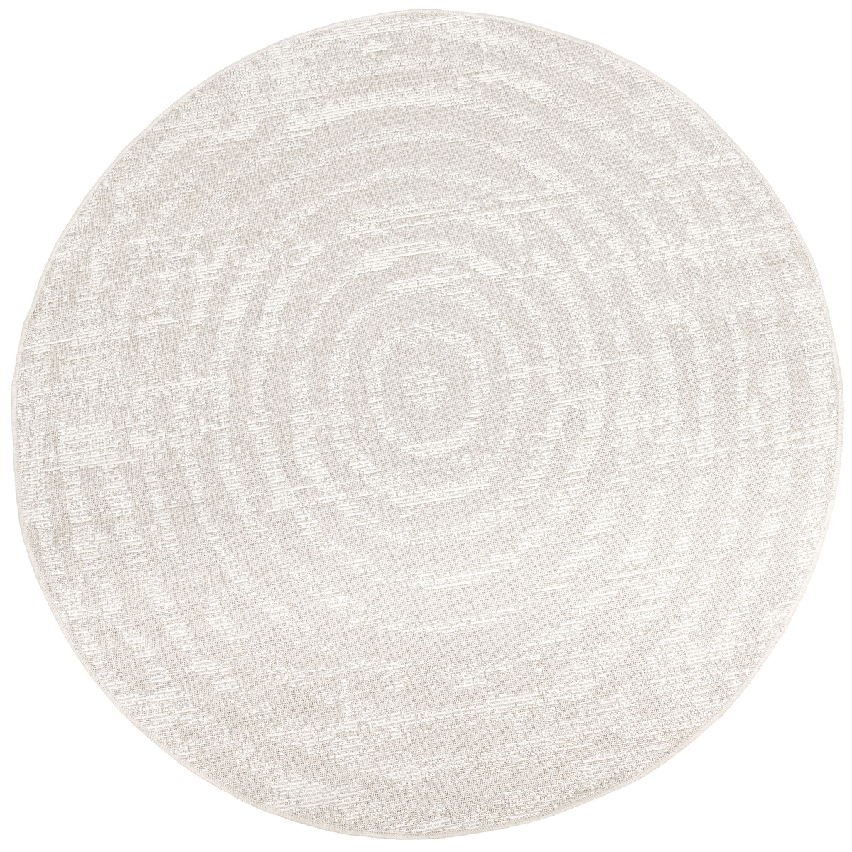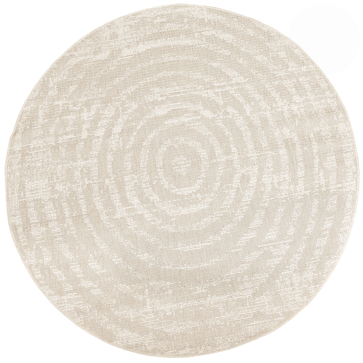 - Okrągły dywan sznurkowy Haga z geometrycznym wzorem z motywem okręgów w odcieniach kremu i beżu, który może być stosowany zarówno wewnątrz jak i na zewnątrz.