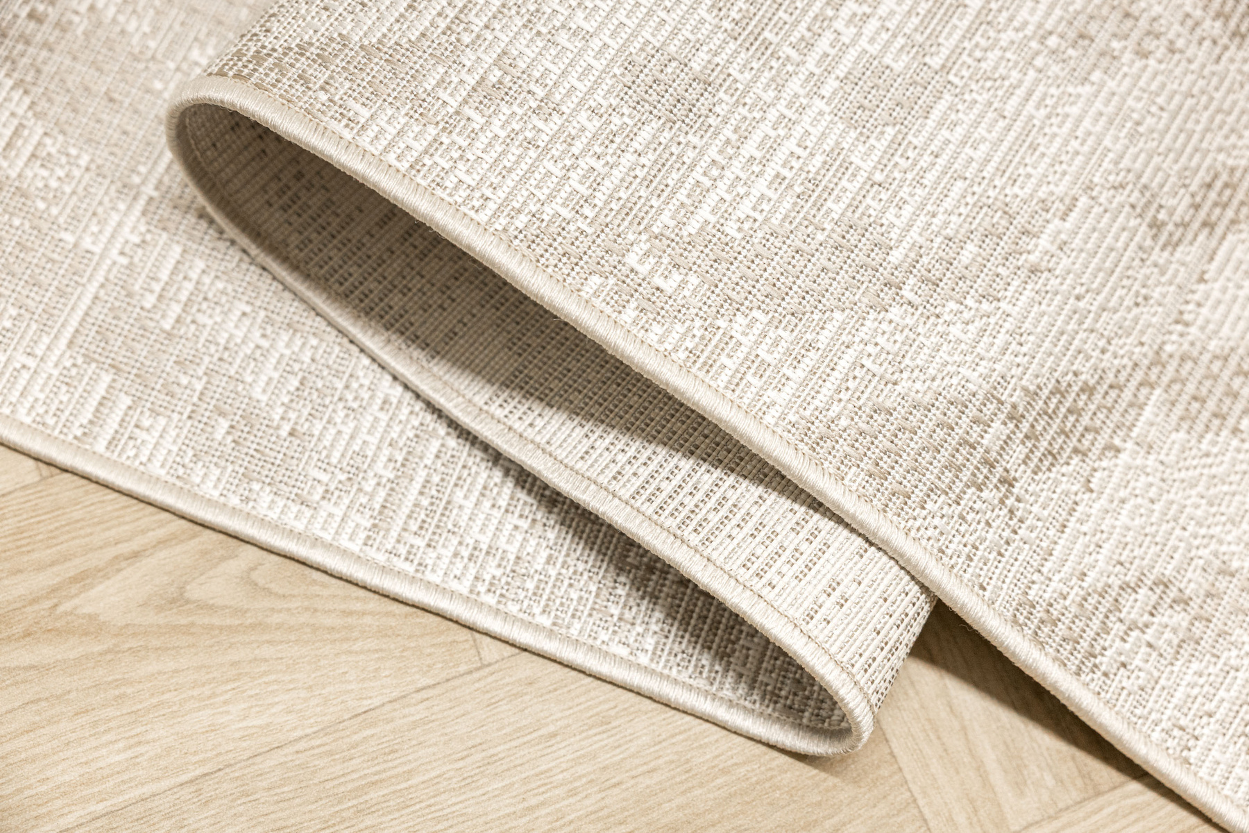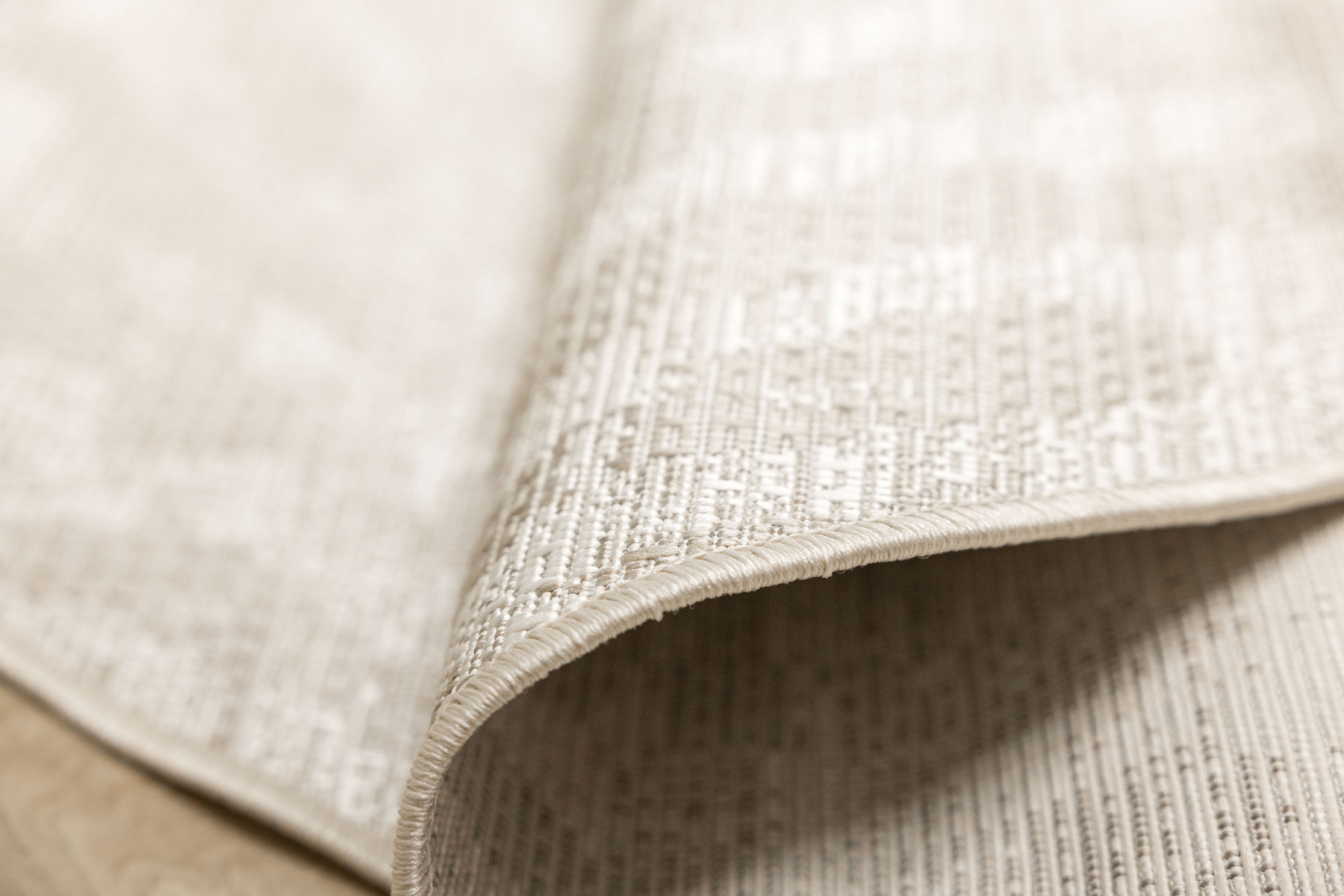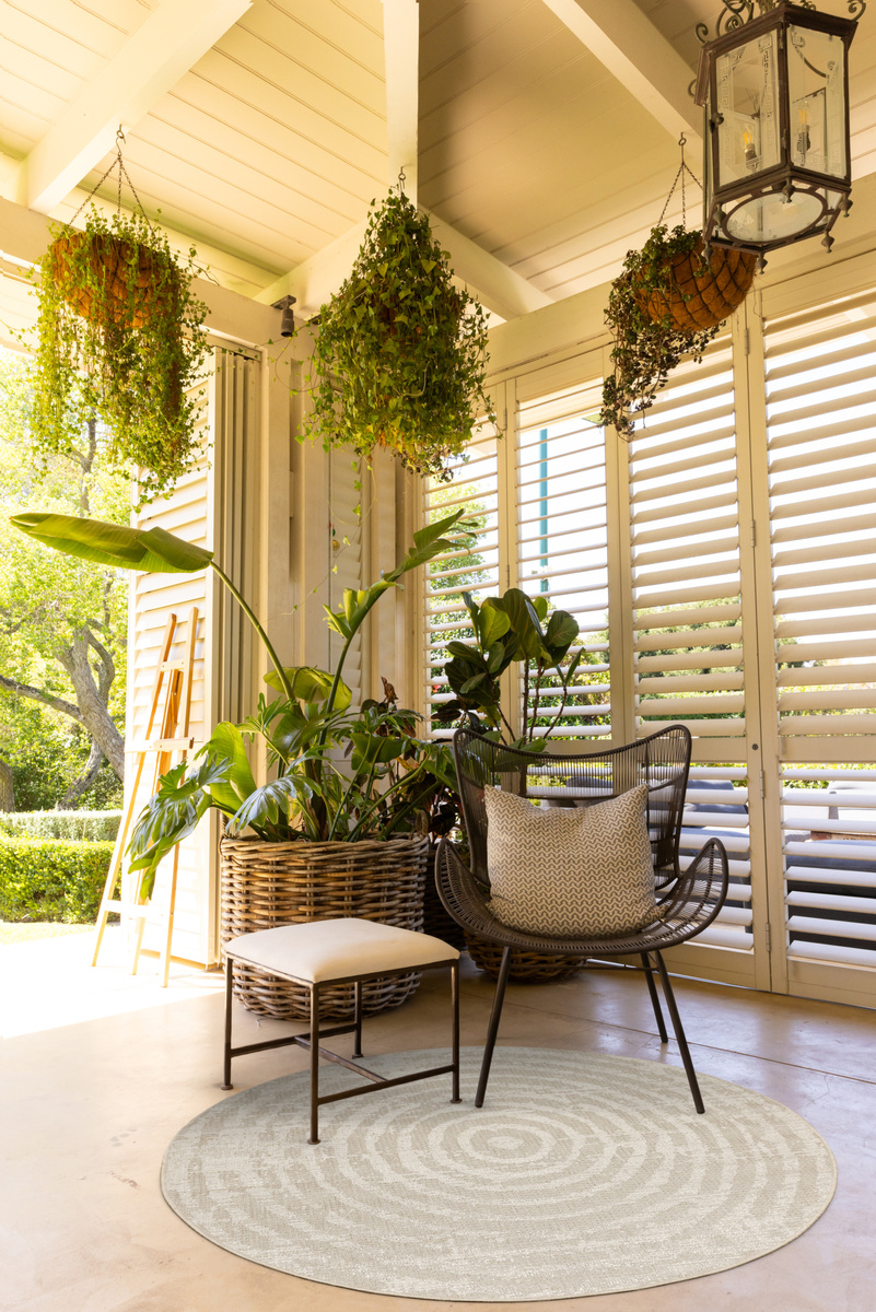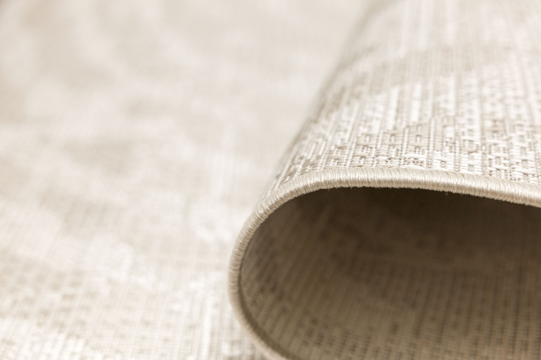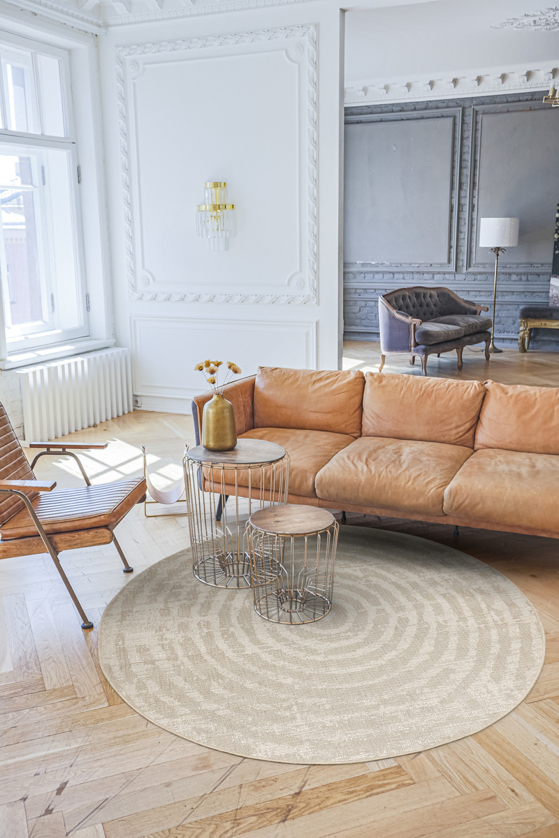 - Okrągły dywan sznurkowy Haga z geometrycznym wzorem z motywem okręgów w odcieniach kremu i beżu, który może być stosowany zarówno wewnątrz jak i na zewnątrz.