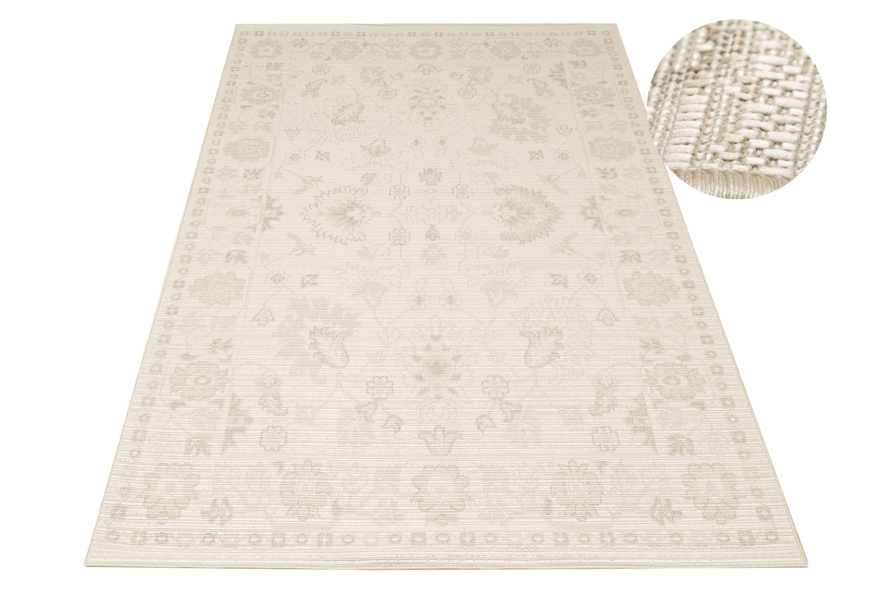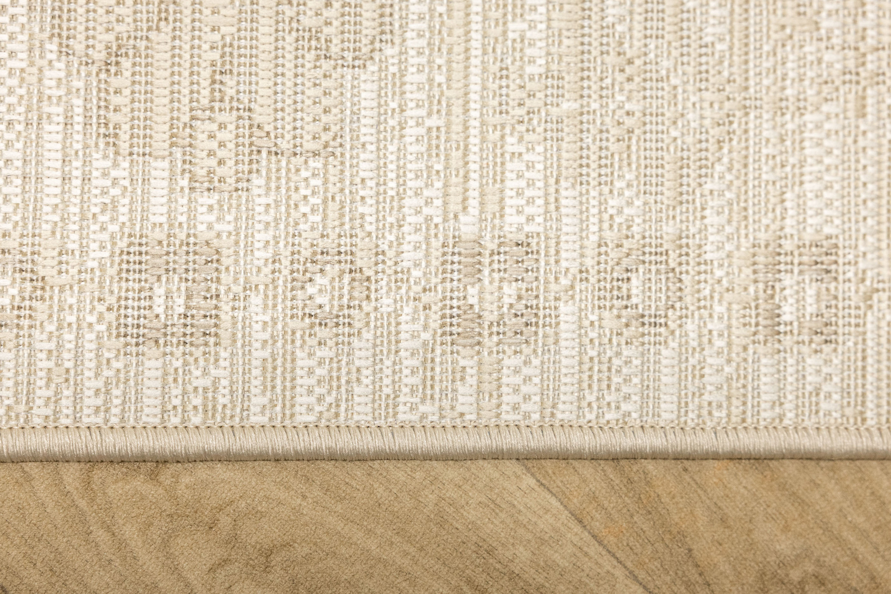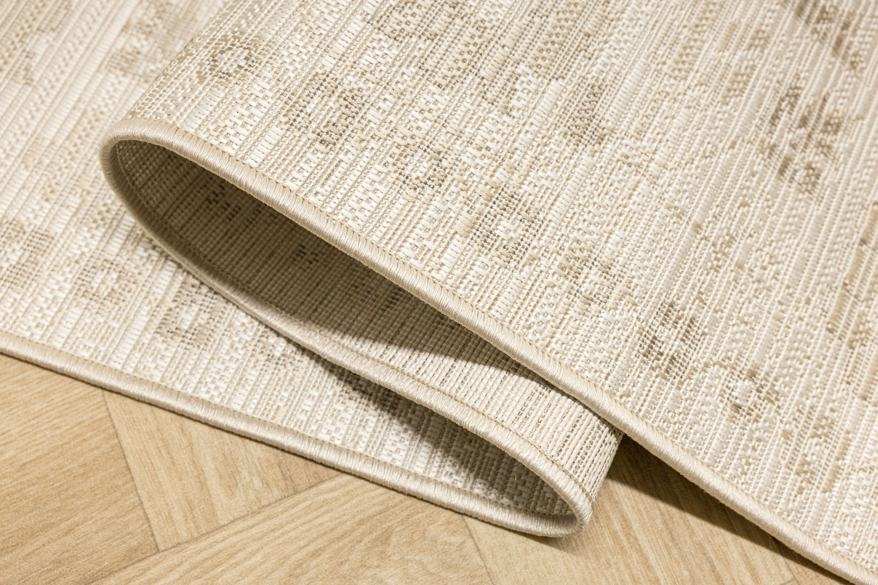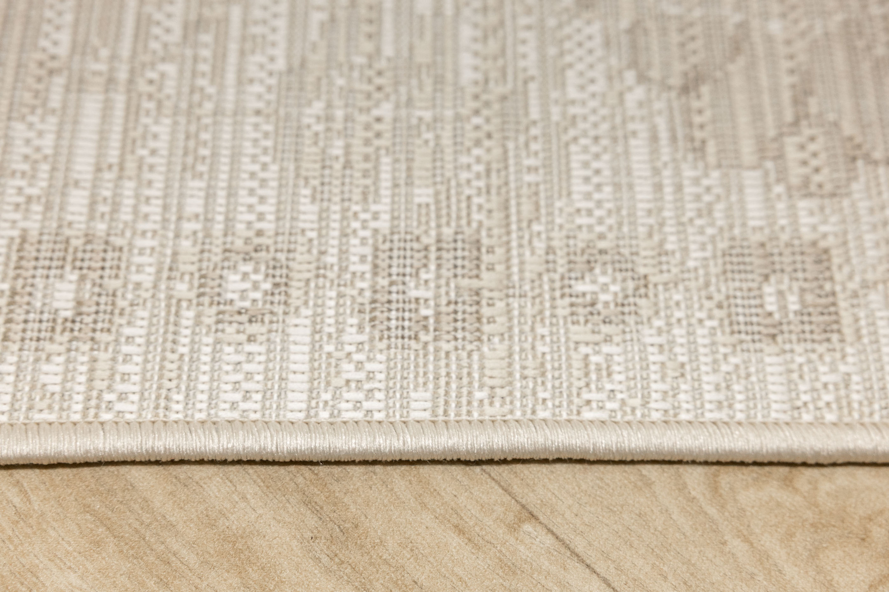 • Dywan sznurkowy Haga z ornamentowym wzorem w odcieniach kremu, ecru i beżu, który może być stosowany zarówno wewnątrz jak i na zewnątrz.