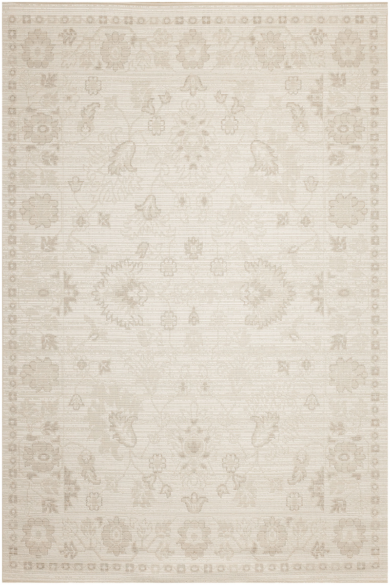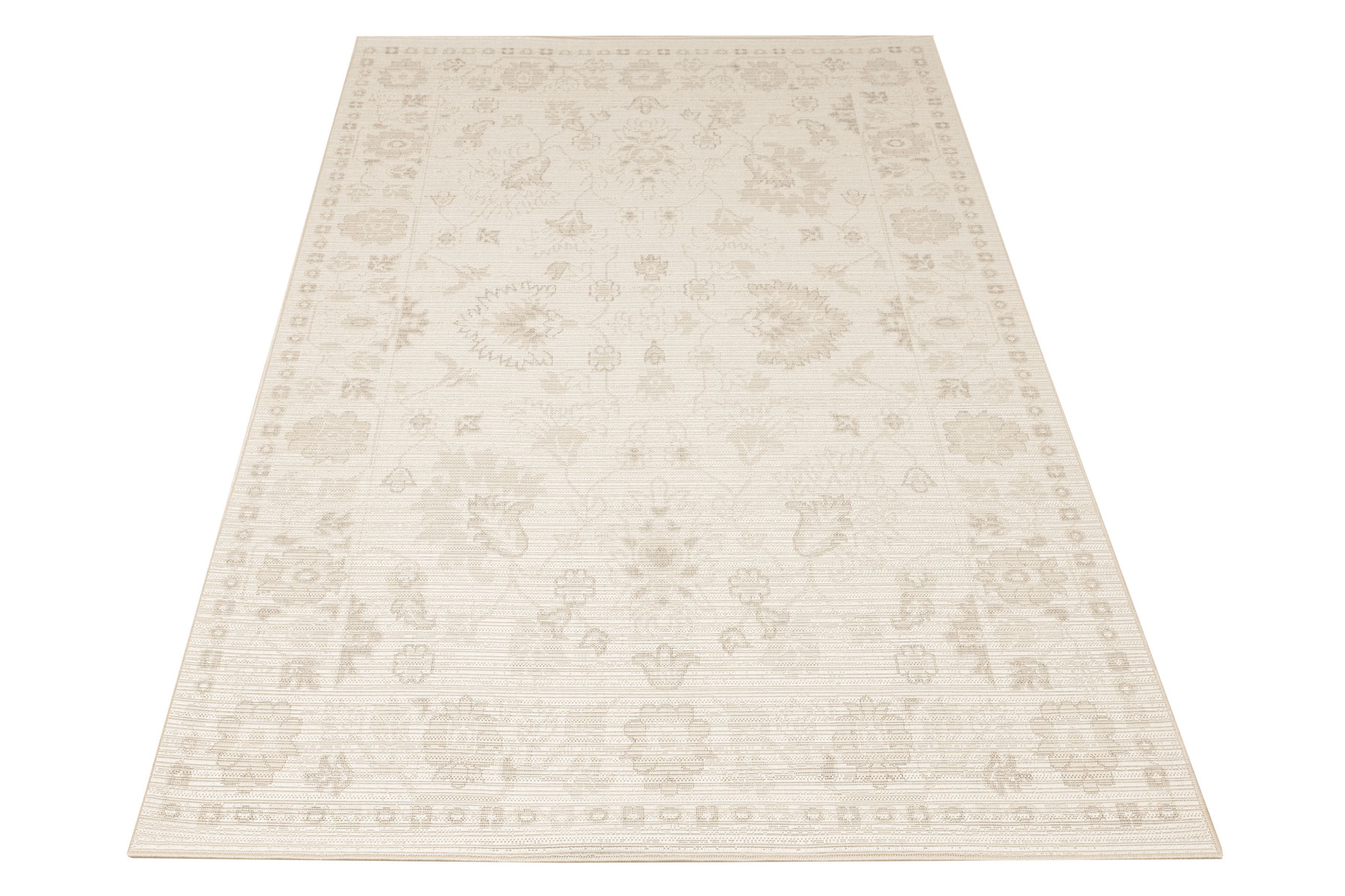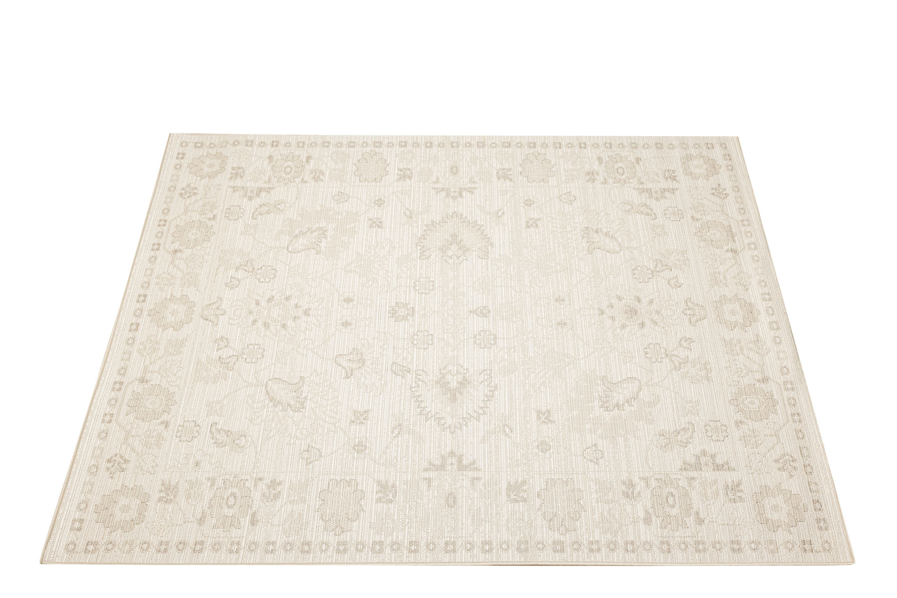 • Dywan sznurkowy Haga z ornamentowym wzorem w odcieniach kremu, ecru i beżu, który może być stosowany zarówno wewnątrz jak i na zewnątrz.
