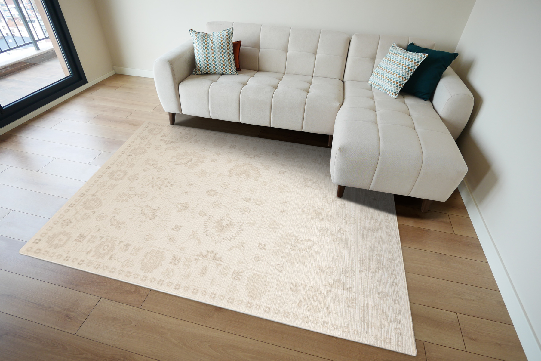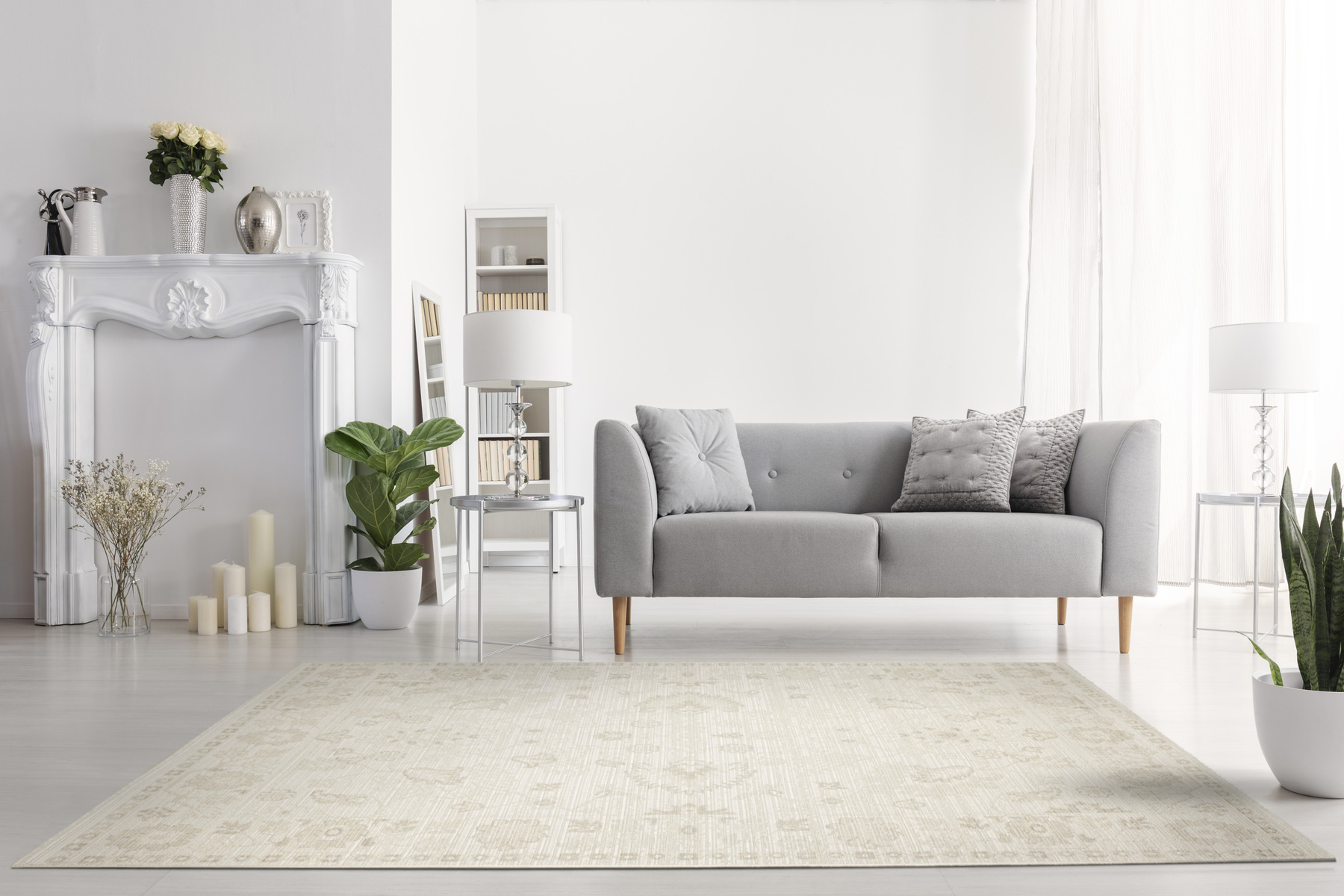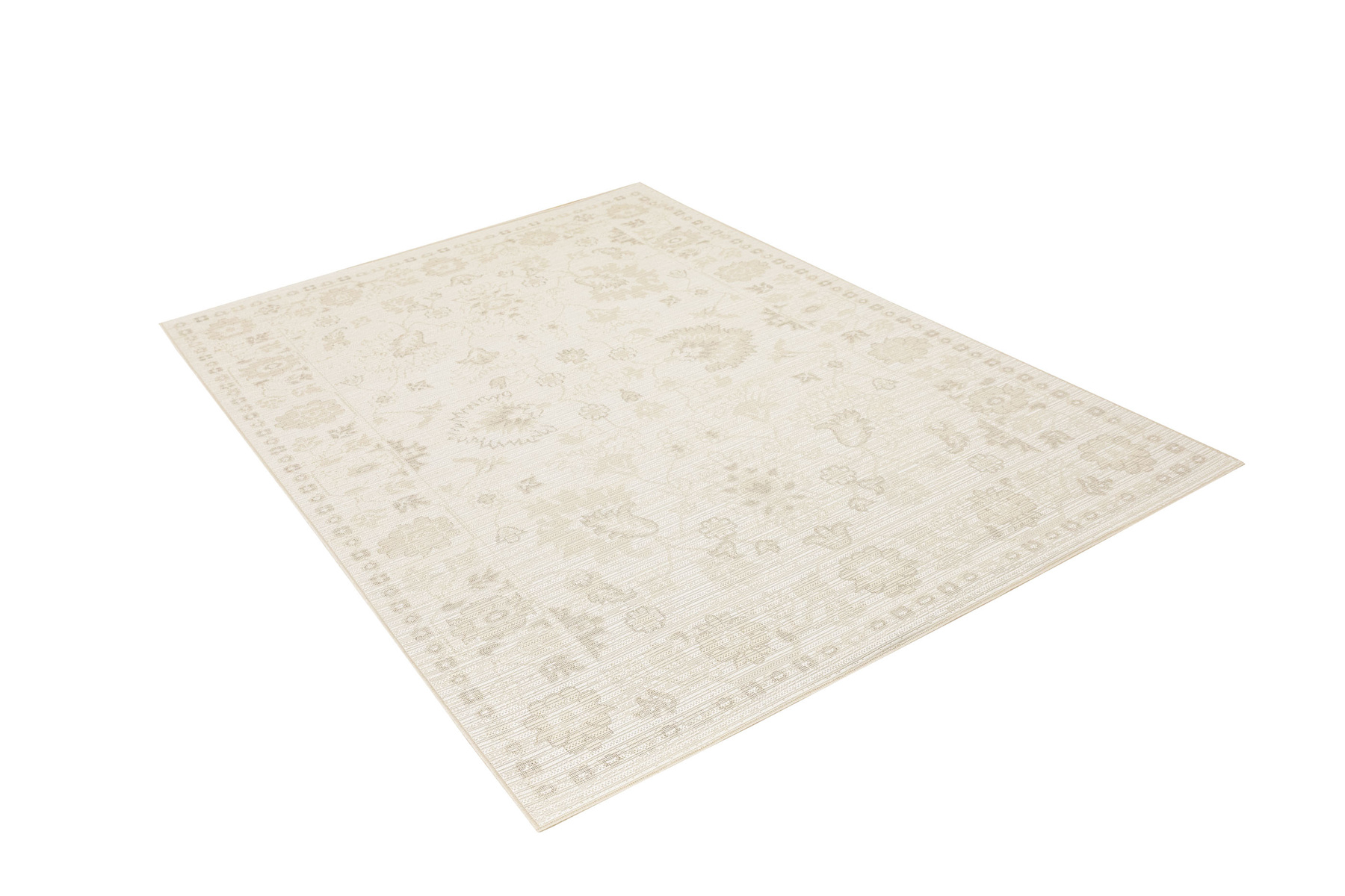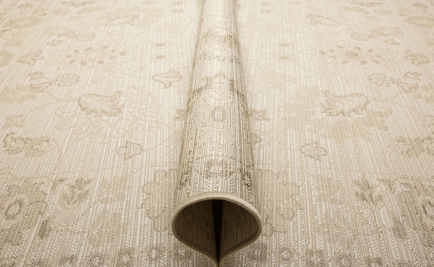 • Dywan sznurkowy Haga z ornamentowym wzorem w odcieniach kremu, ecru i beżu, który może być stosowany zarówno wewnątrz jak i na zewnątrz.