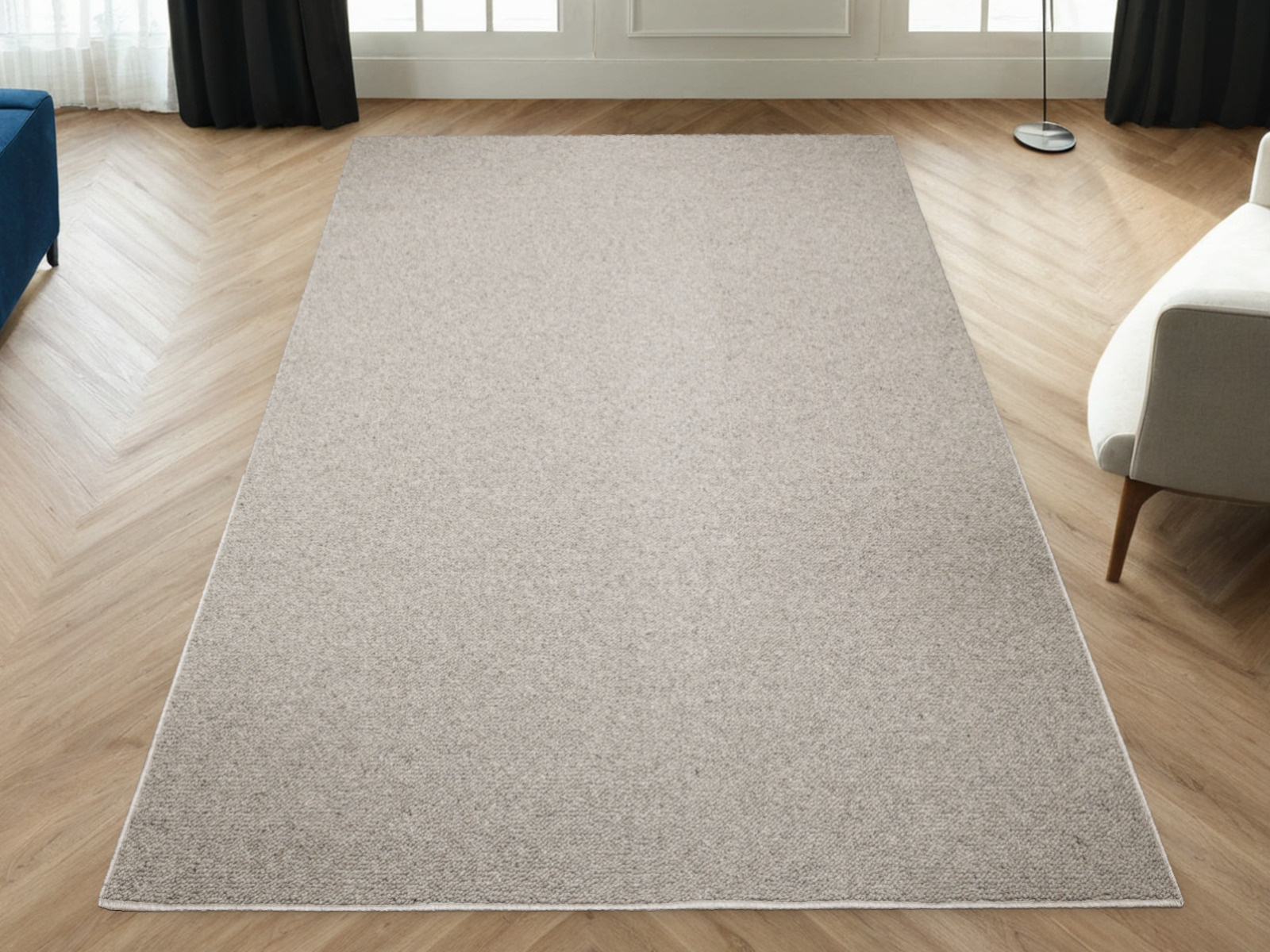 - Wełniany dywan pętelkowy Nelson z runem w odcieniu szarości z delikatnym dodatkiem brązu, ze spodem wykończonym filcem.