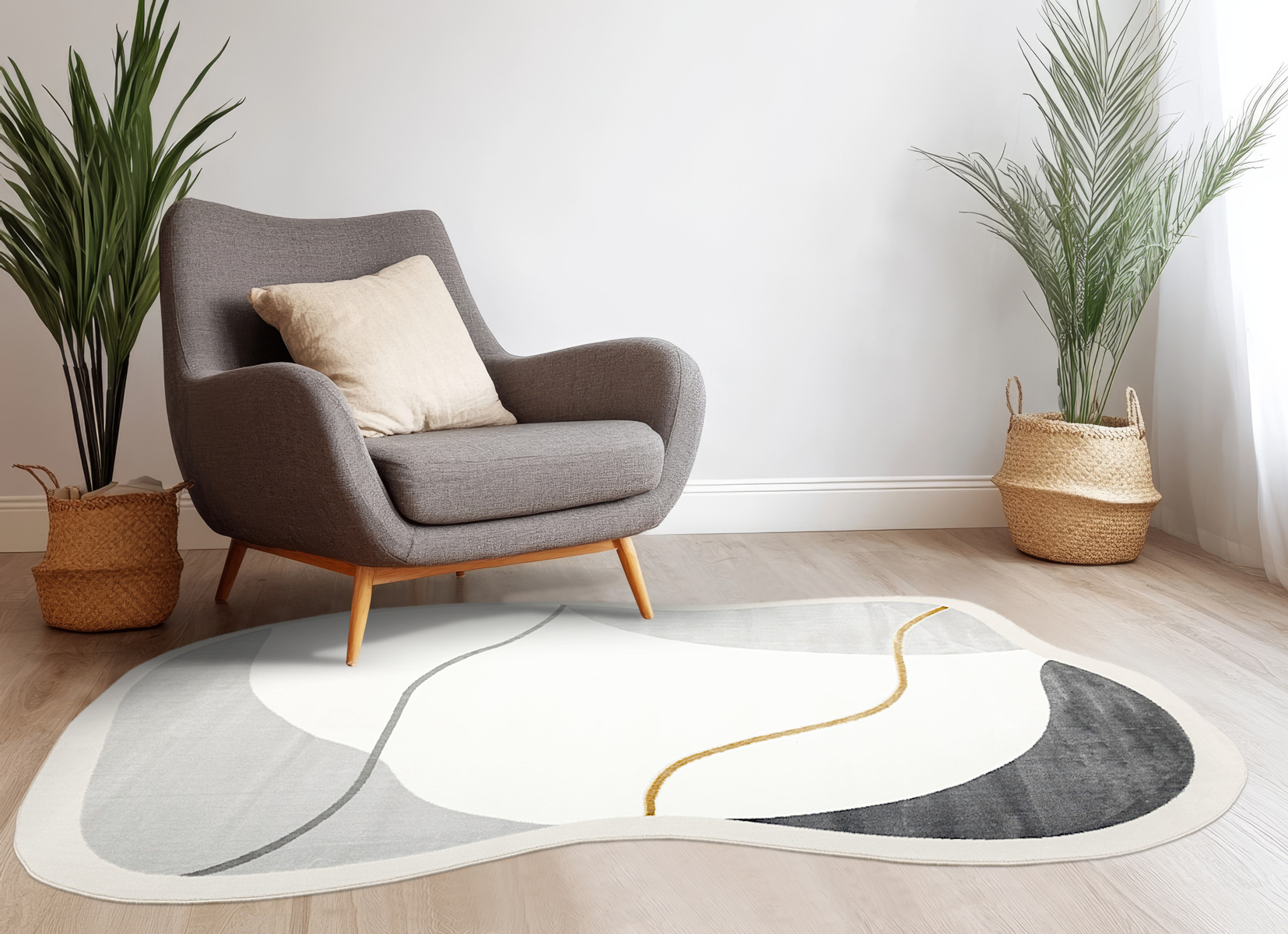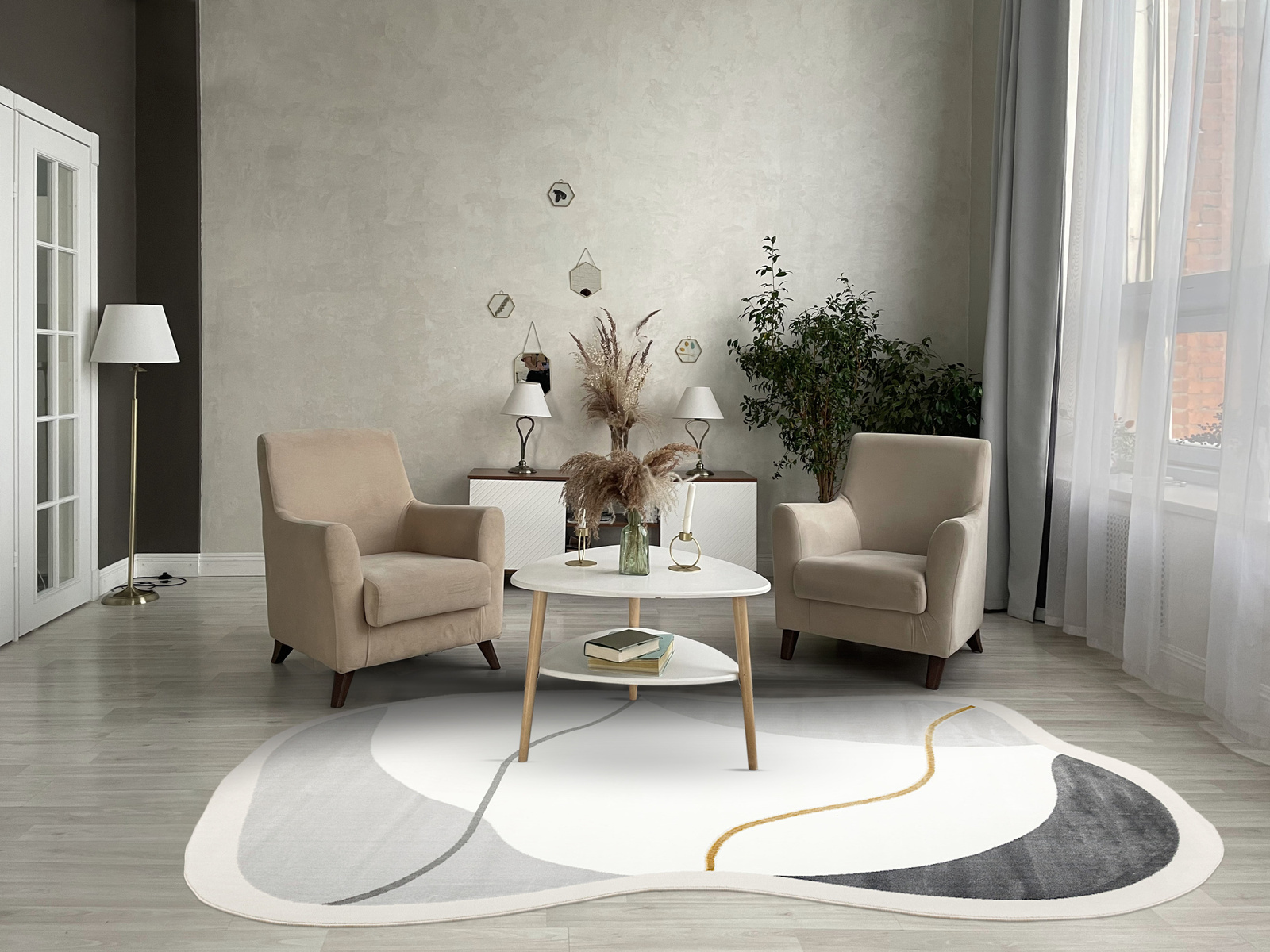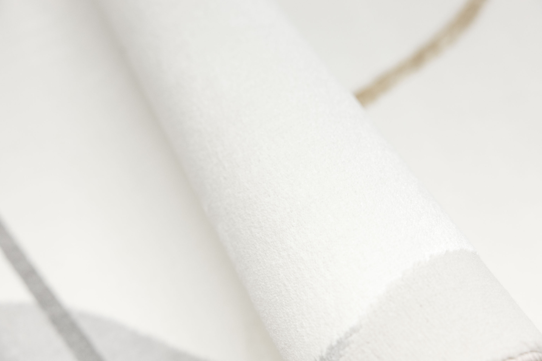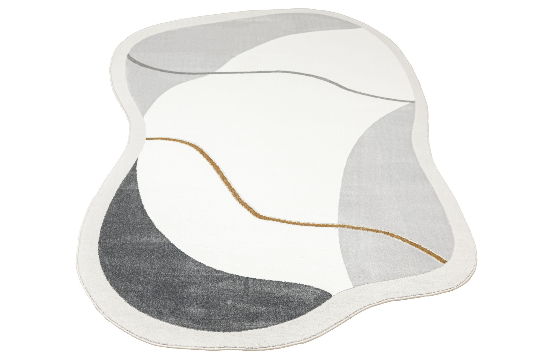 - Luksusowy dywan Selenne o nieregularnym kształcie z mięciutkim, lekko lśniącym, dwupoziomowym runem, abstrakcyjnym wzorem w odcieniach szarości zmieszanej z beżem z akcentami kremu, grafitu i złota, ze spodem wykończonym bawełną.