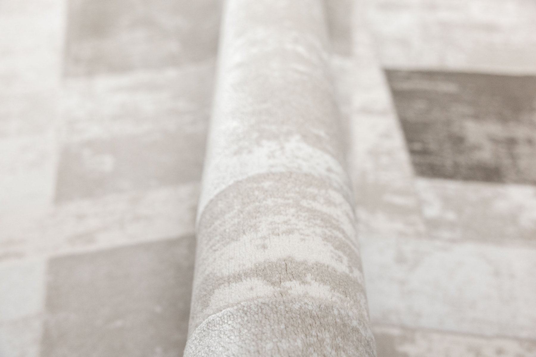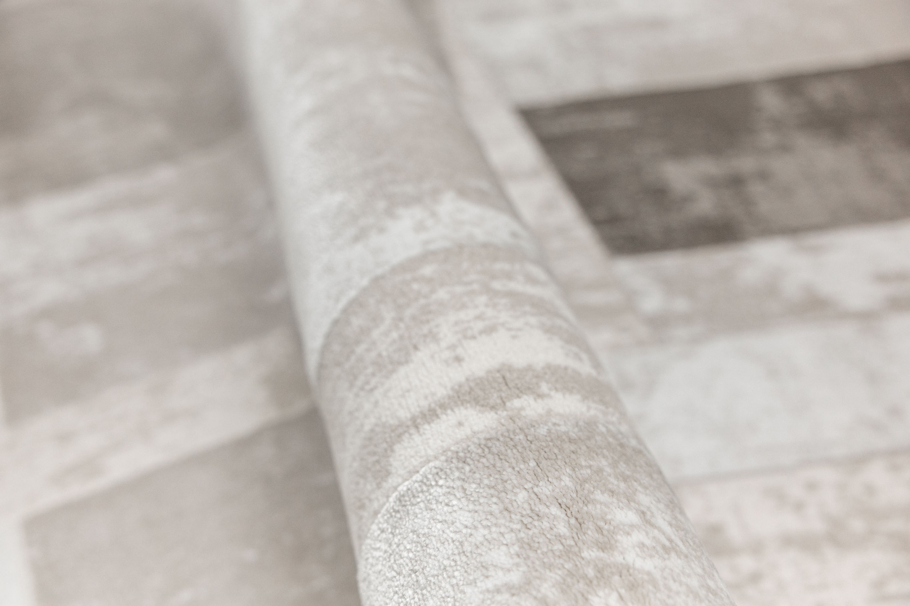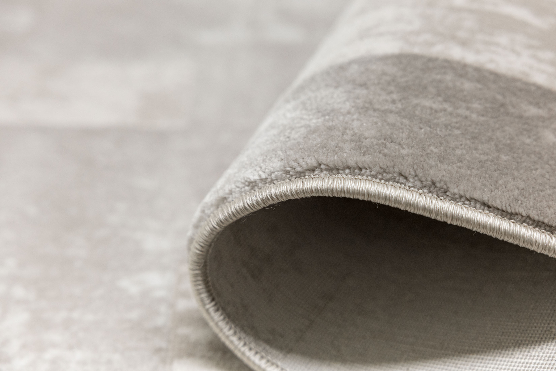 • Luksusowy dywan Selenne o nieregularnym kształcie z mięciutkim, lekko lśniącym, dwupoziomowym runem, abstrakcyjnym wzorem geometrycznym w odcieniach szarości zmieszanej z beżem z akcentami kremu, ze spodem wykończonym bawełną.
