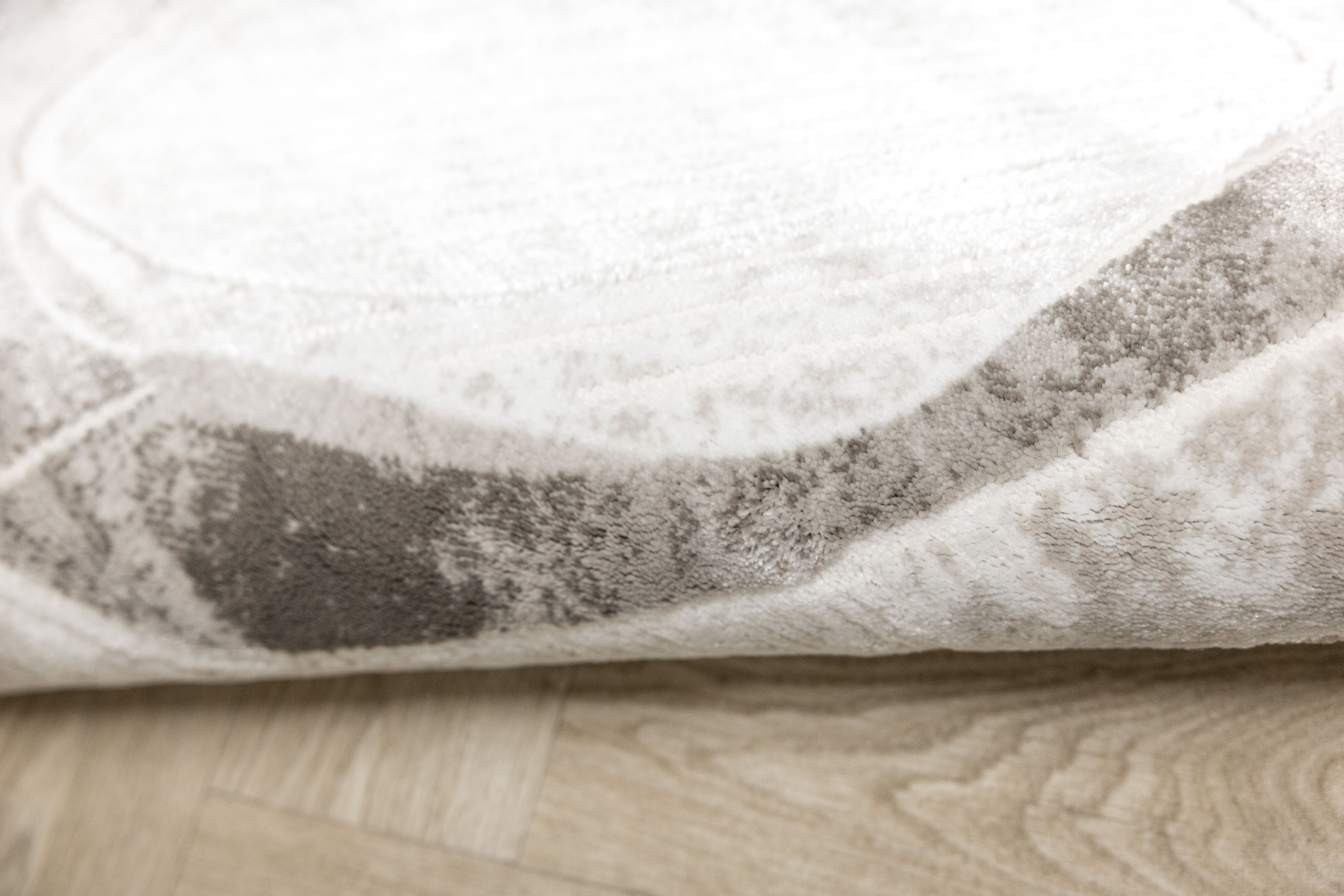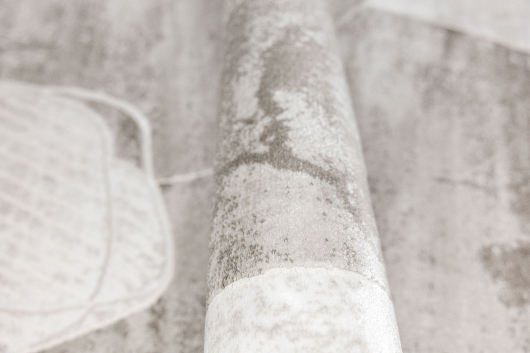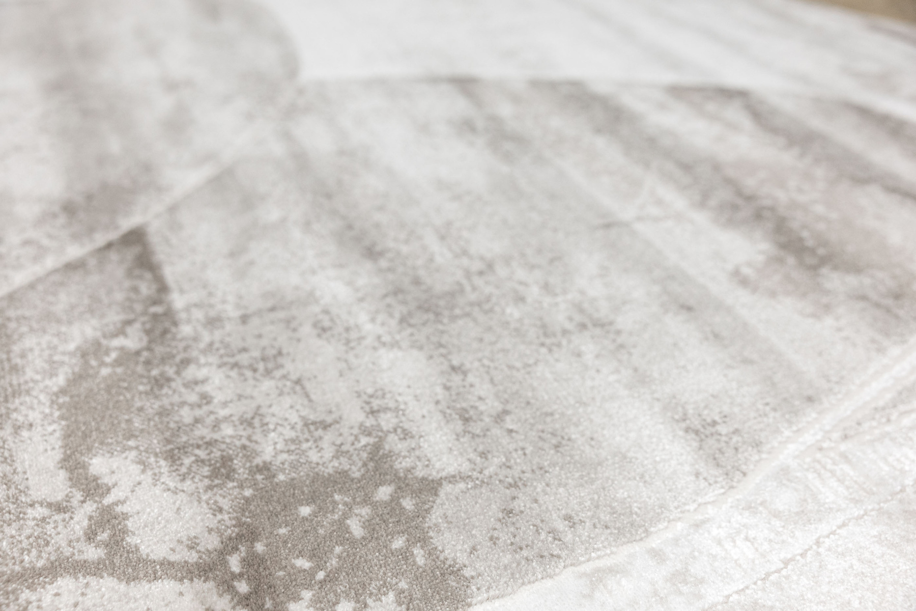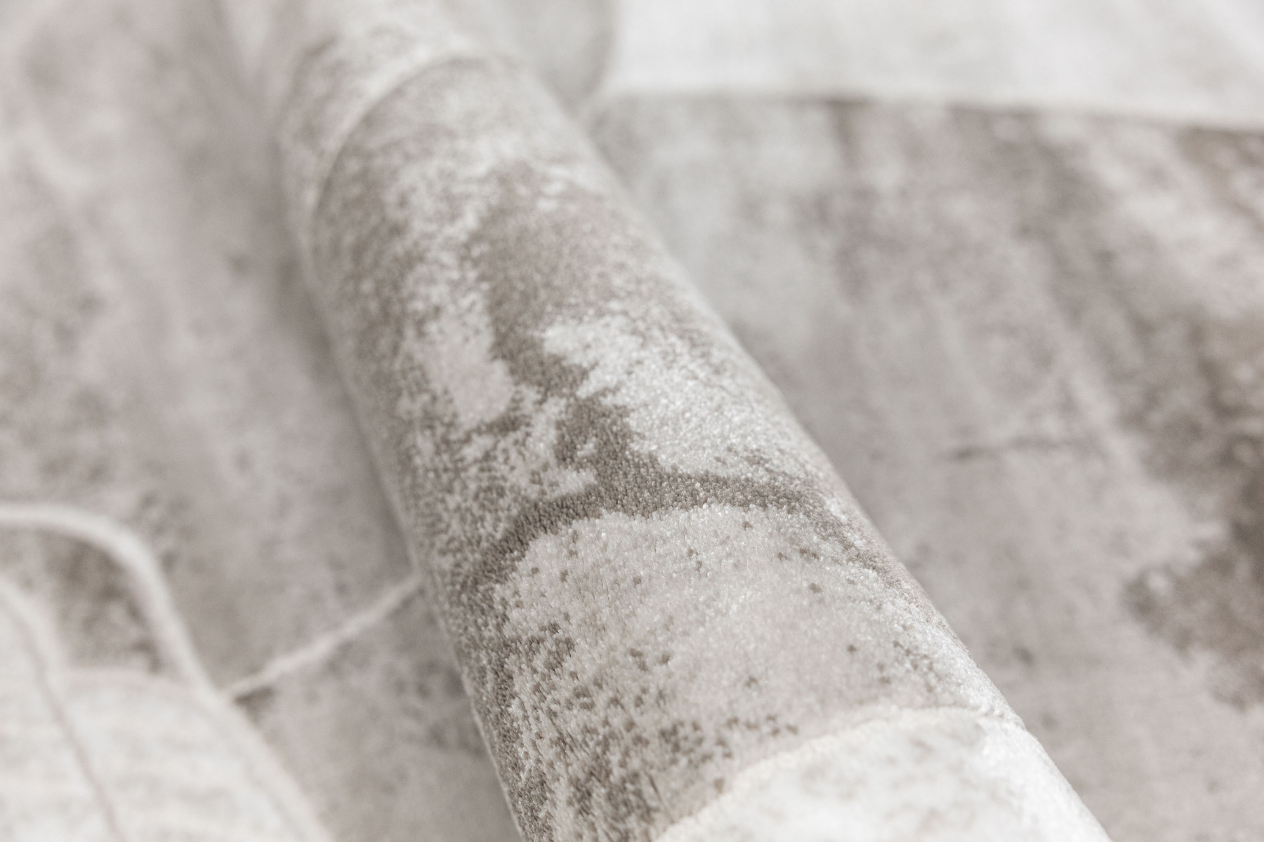 - Luksusowy dywan Selenne o nieregularnym kształcie z mięciutkim, lekko lśniącym, dwupoziomowym runem, abstrakcyjnym wzorem geometrycznym w odcieniach szarości zmieszanej z beżem z akcentami kremu, ze spodem wykończonym bawełną.