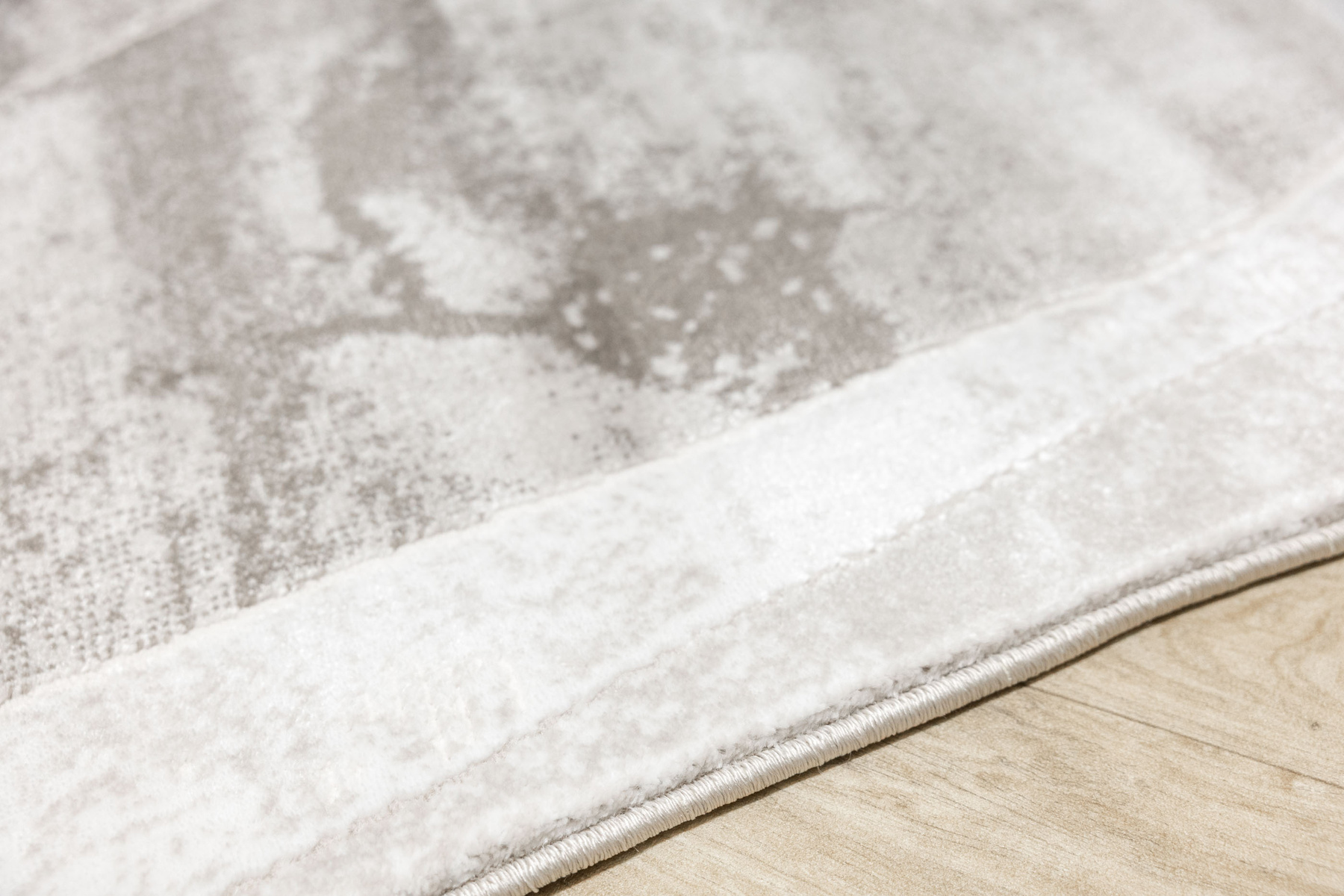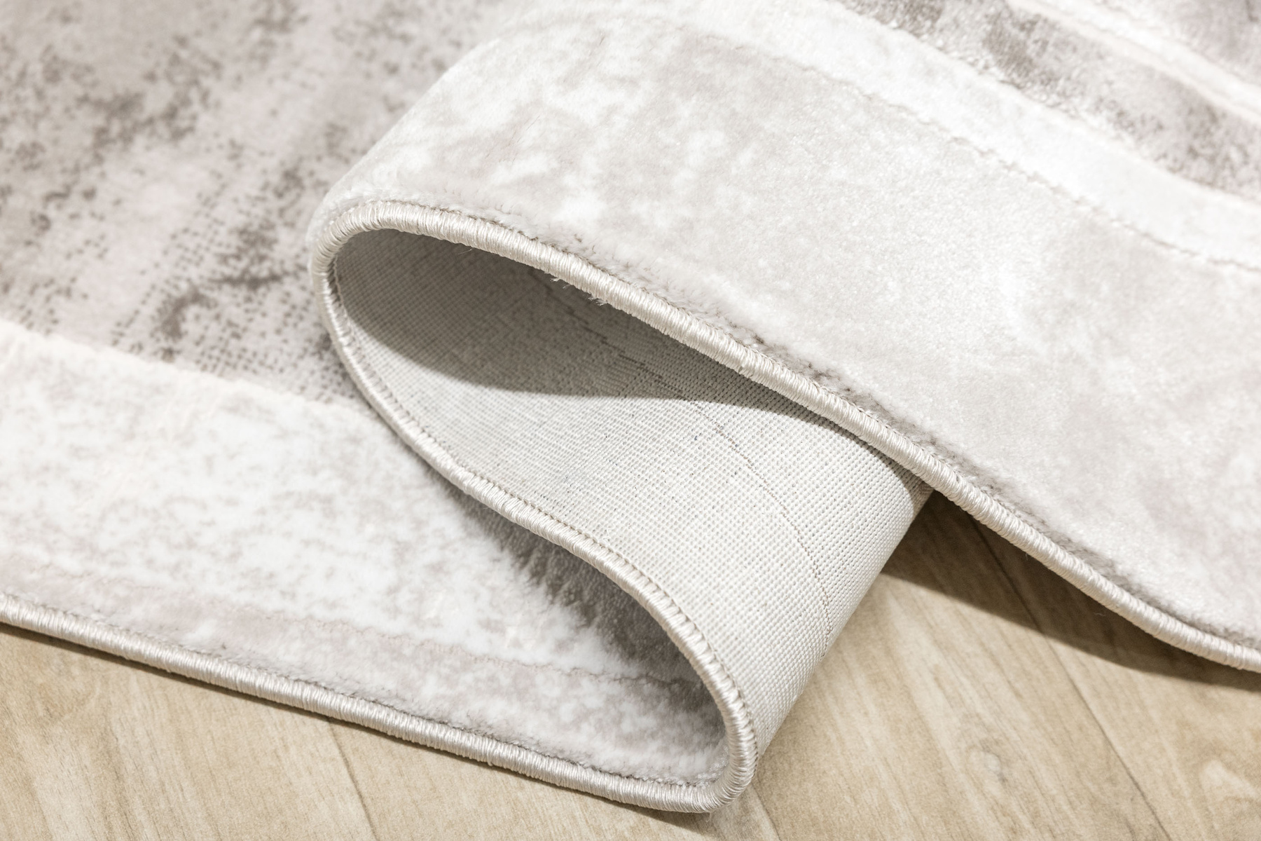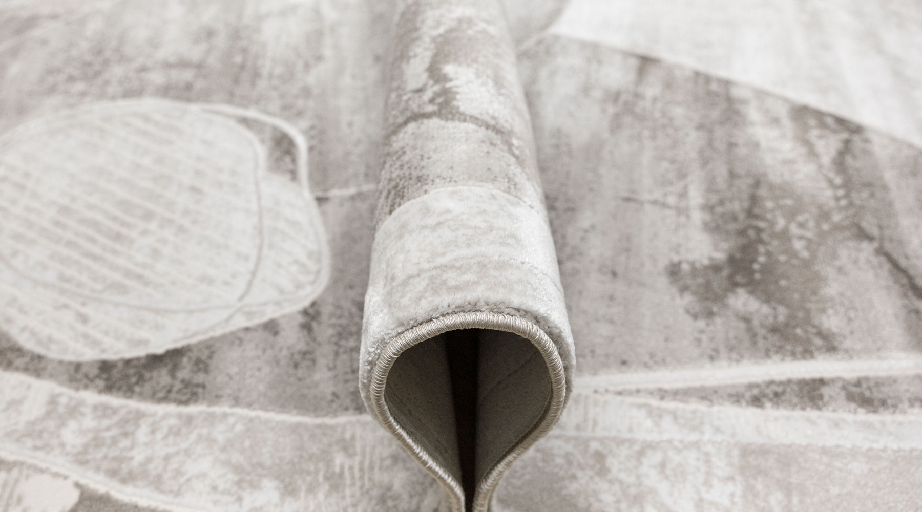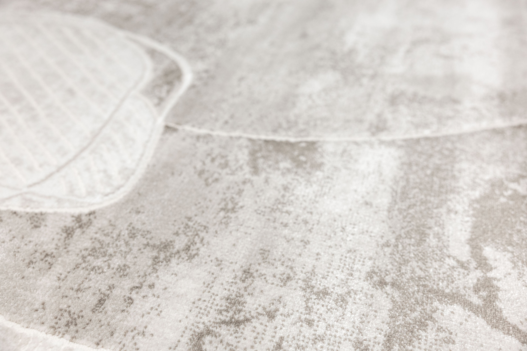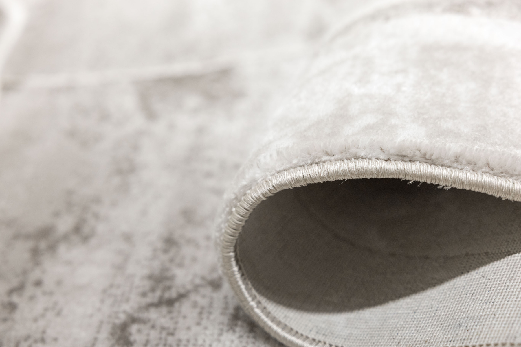 - Luksusowy dywan Selenne o nieregularnym kształcie z mięciutkim, lekko lśniącym, dwupoziomowym runem, abstrakcyjnym wzorem geometrycznym w odcieniach szarości zmieszanej z beżem z akcentami kremu, ze spodem wykończonym bawełną.