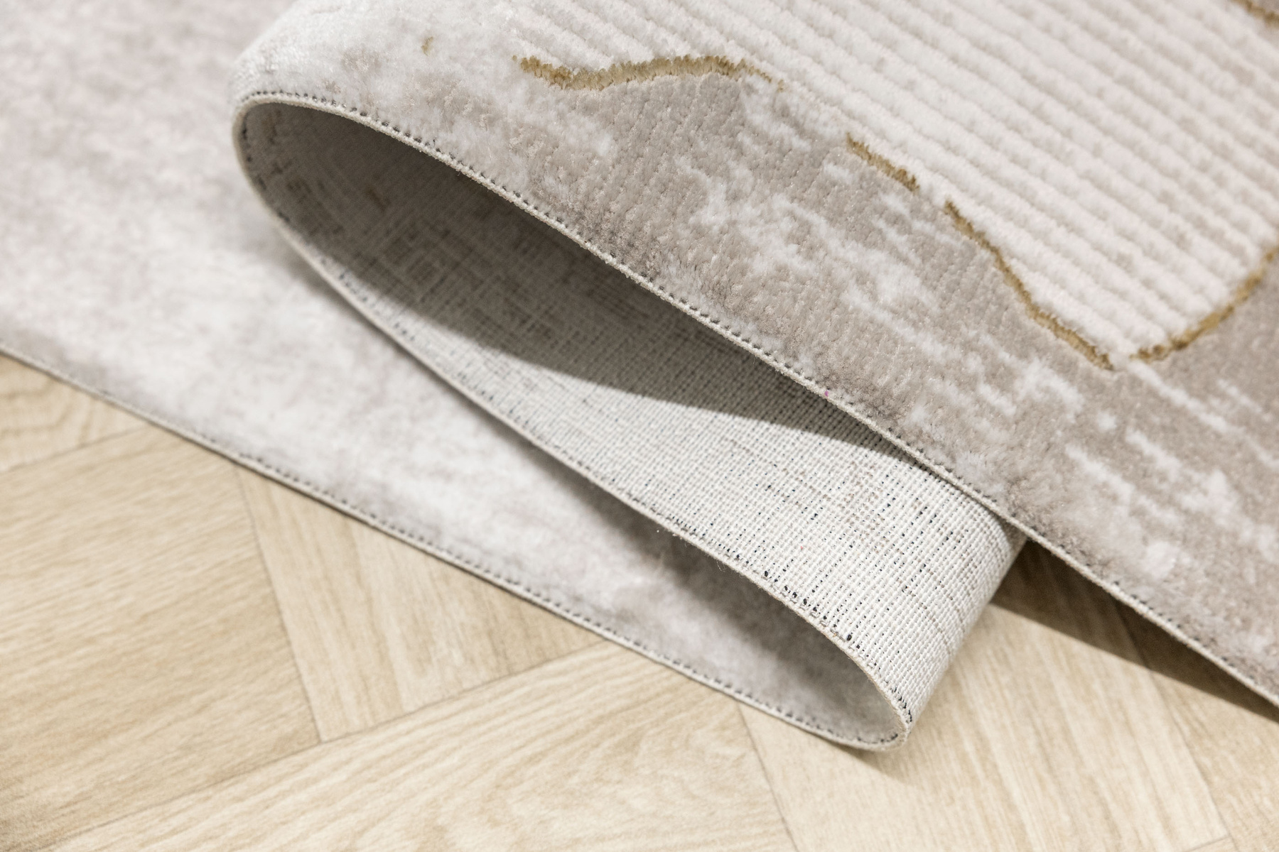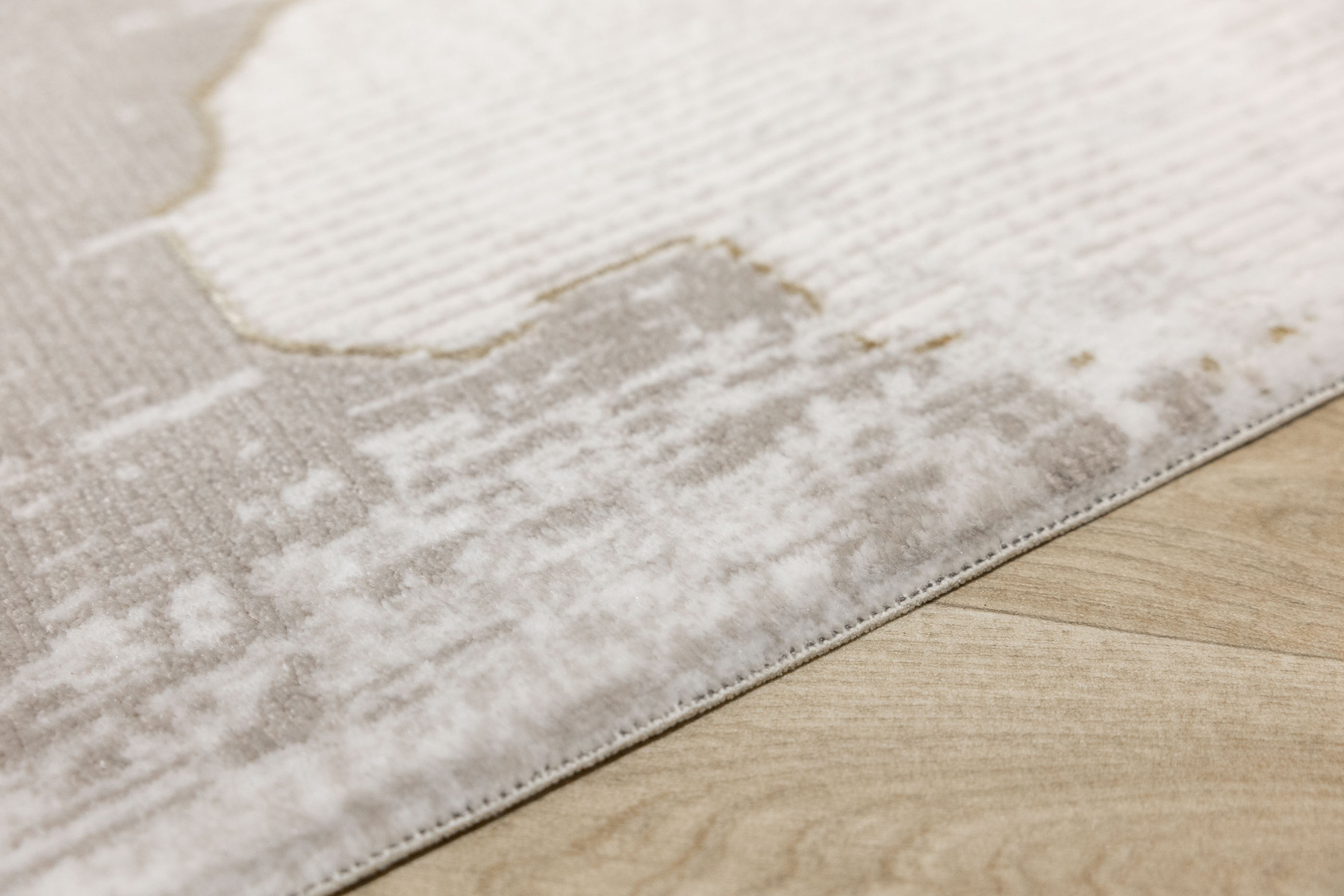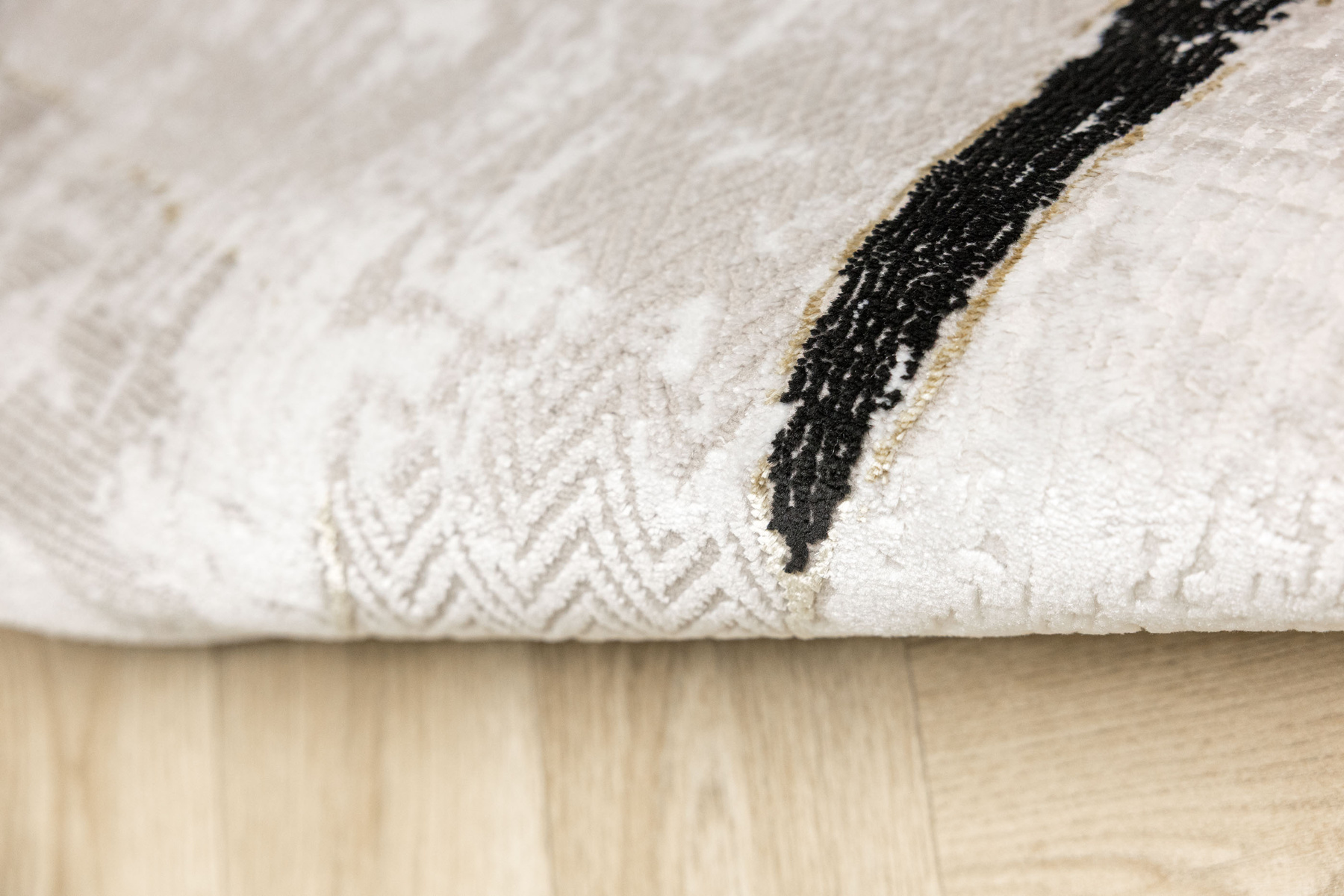 - Luksusowy dywan Kashmir o mięciutkim, lekko lśniącym, dwupoziomowym runie ze złożonym wzorem imitującym przecierany tynk, w odcieniach szarości zmieszanej z beżem z akcentami kremu, czerni i złota, ze spodem wykończonym bawełną.
