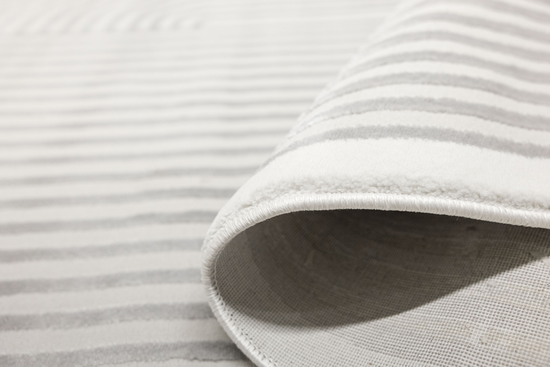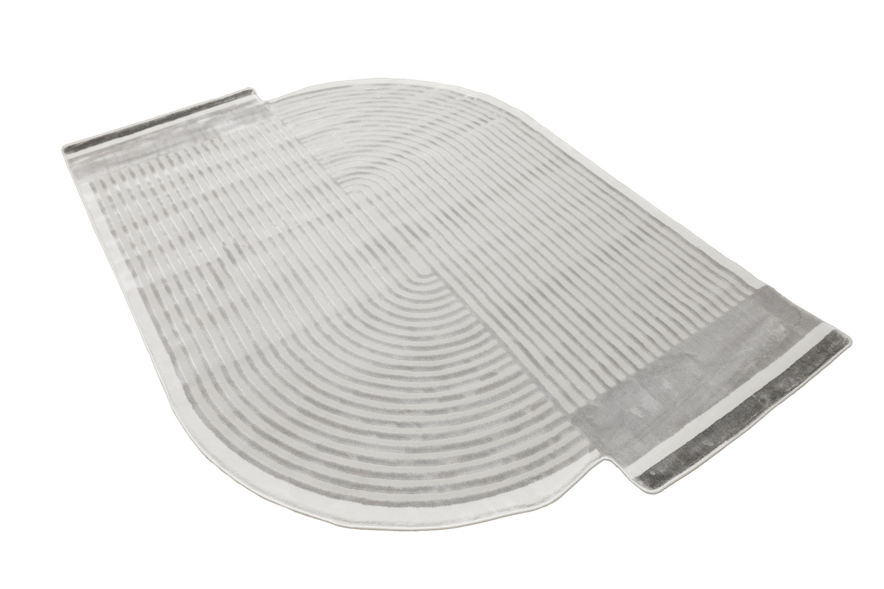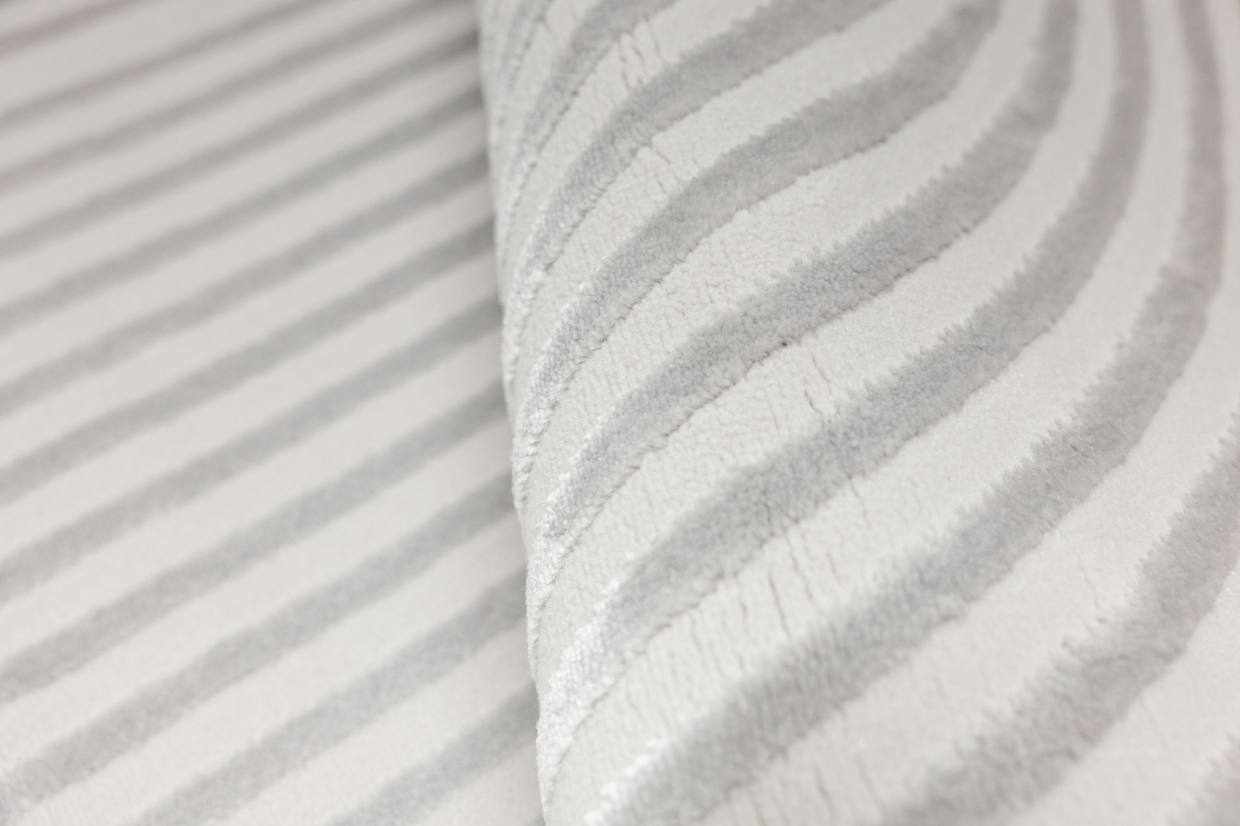 - Luksusowy dywan Selenne o nieregularnym kształcie z mięciutkim, lekko lśniącym, dwupoziomowym runem, abstrakcyjnym wzorem geometrycznym w symetryczne paski w odcieniach szarości i kremu, ze spodem wykończonym bawełną.