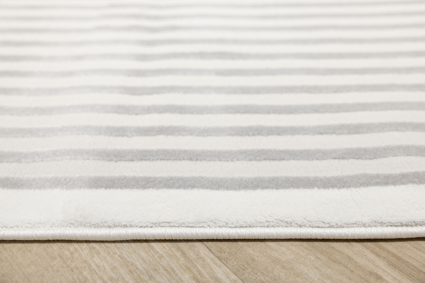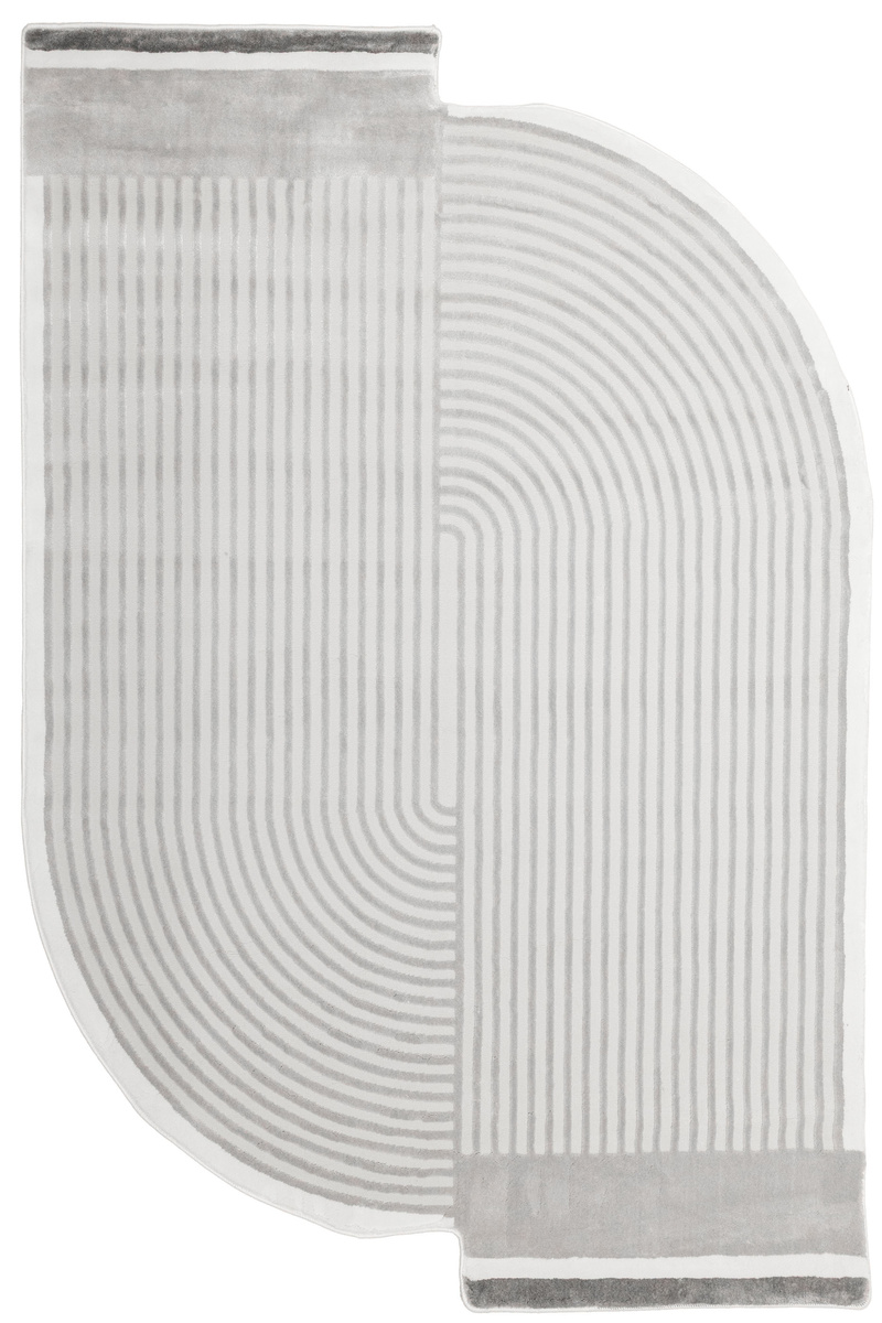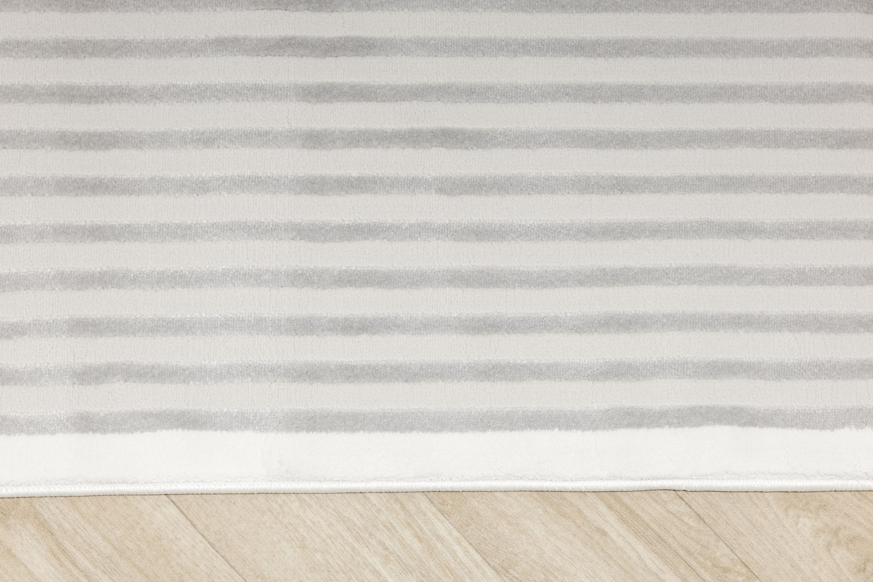 - Luksusowy dywan Selenne o nieregularnym kształcie z mięciutkim, lekko lśniącym, dwupoziomowym runem, abstrakcyjnym wzorem geometrycznym w symetryczne paski w odcieniach szarości i kremu, ze spodem wykończonym bawełną.