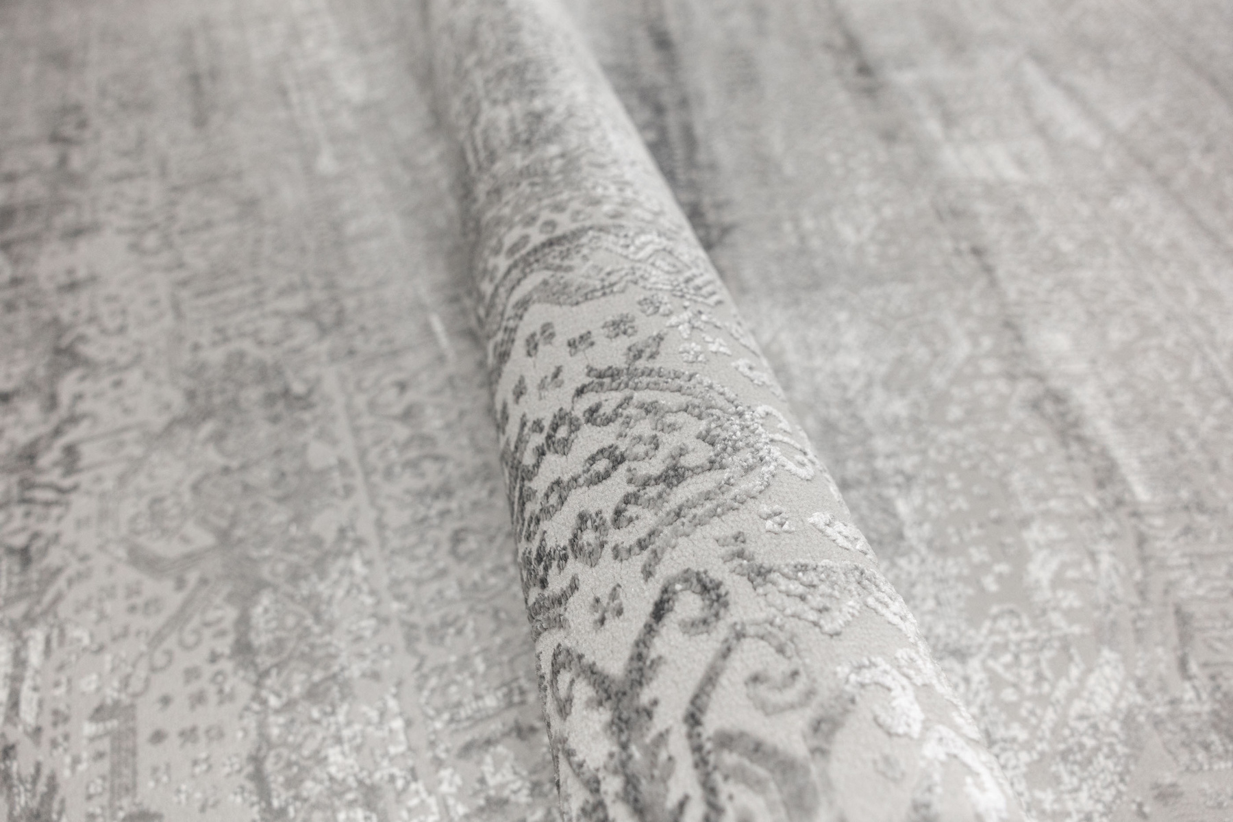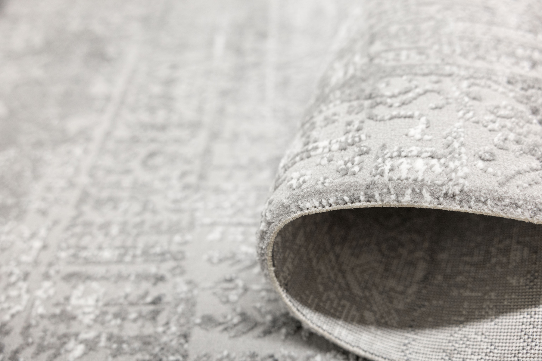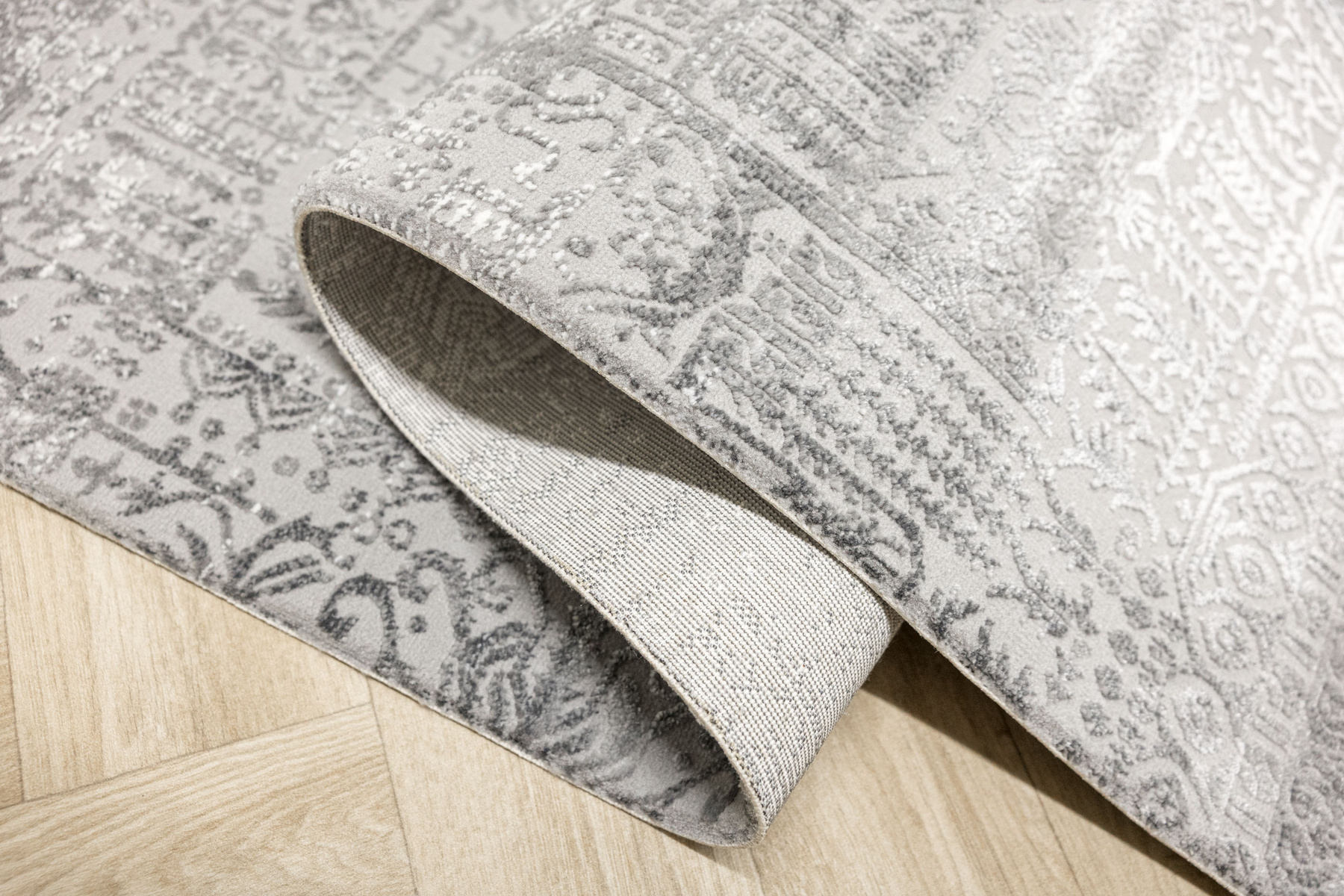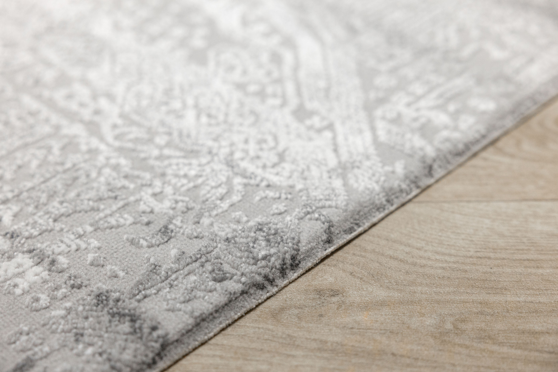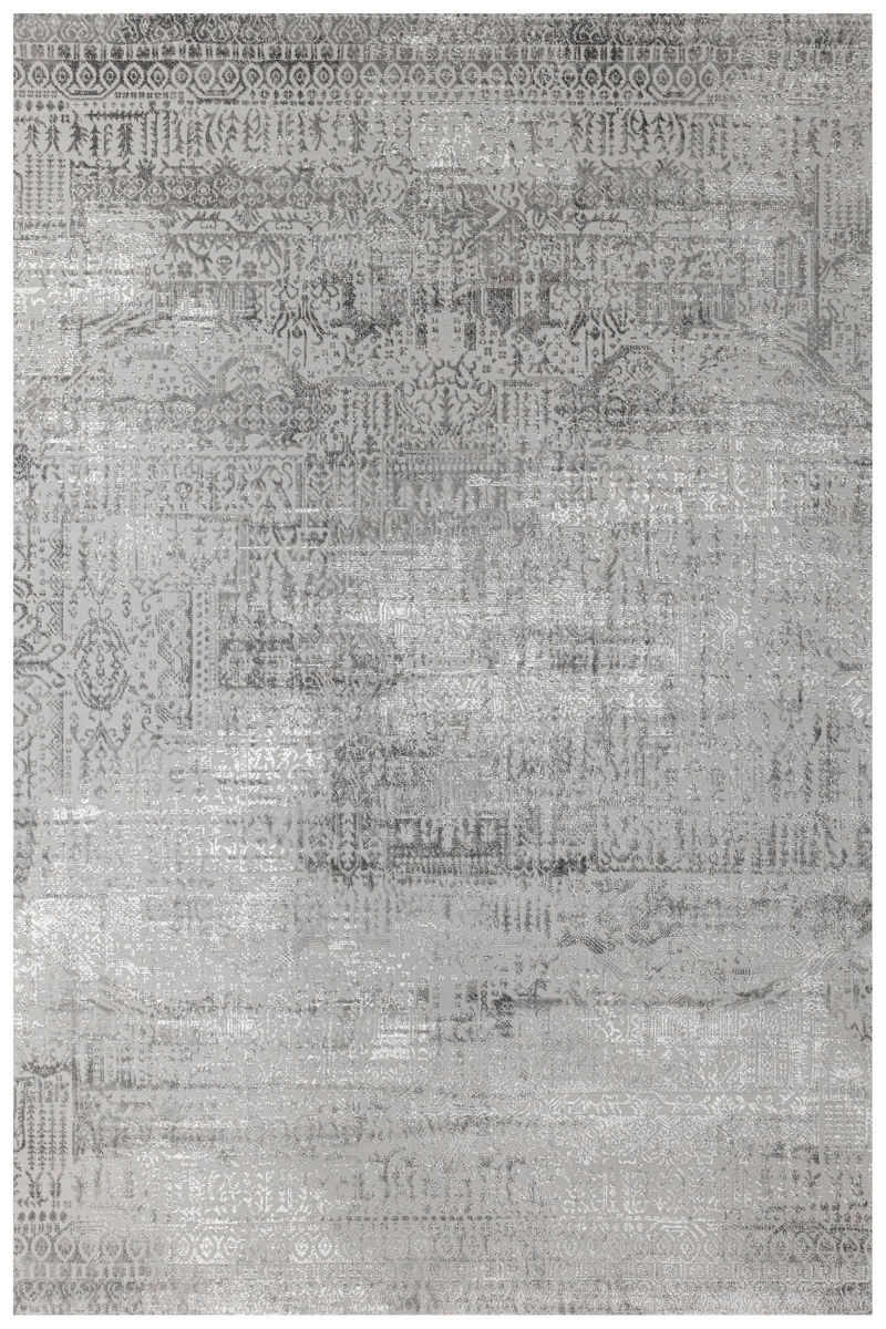 - Luksusowy dywan Nantes o mięciutkim, lekko lśniącym, dwupoziomowym runie ze złożonym wzorem ornamentowym, w odcieniach szarości z akcentami kremu, ze spodem wykończonym bawełną.