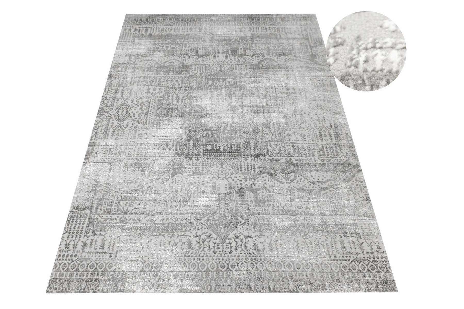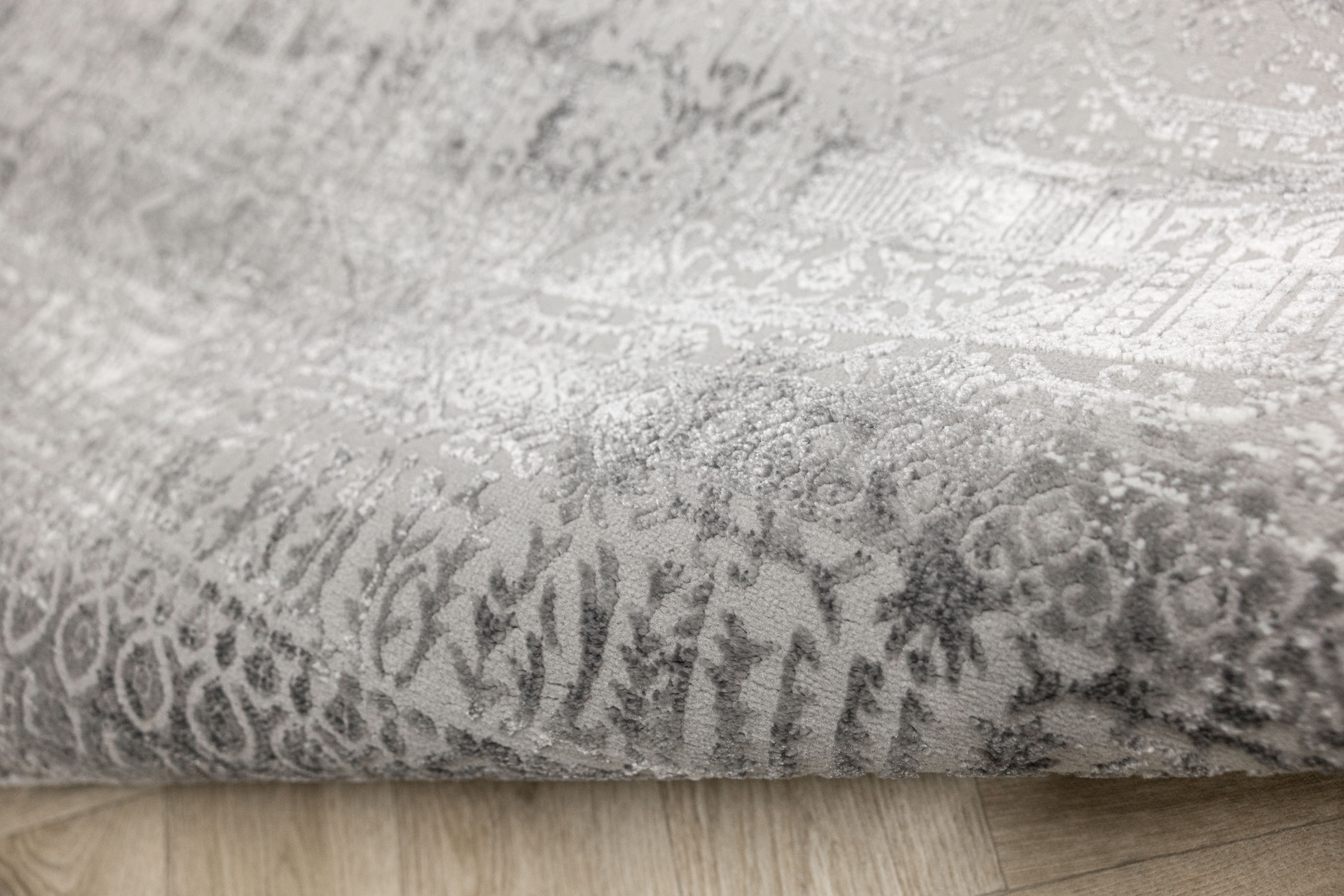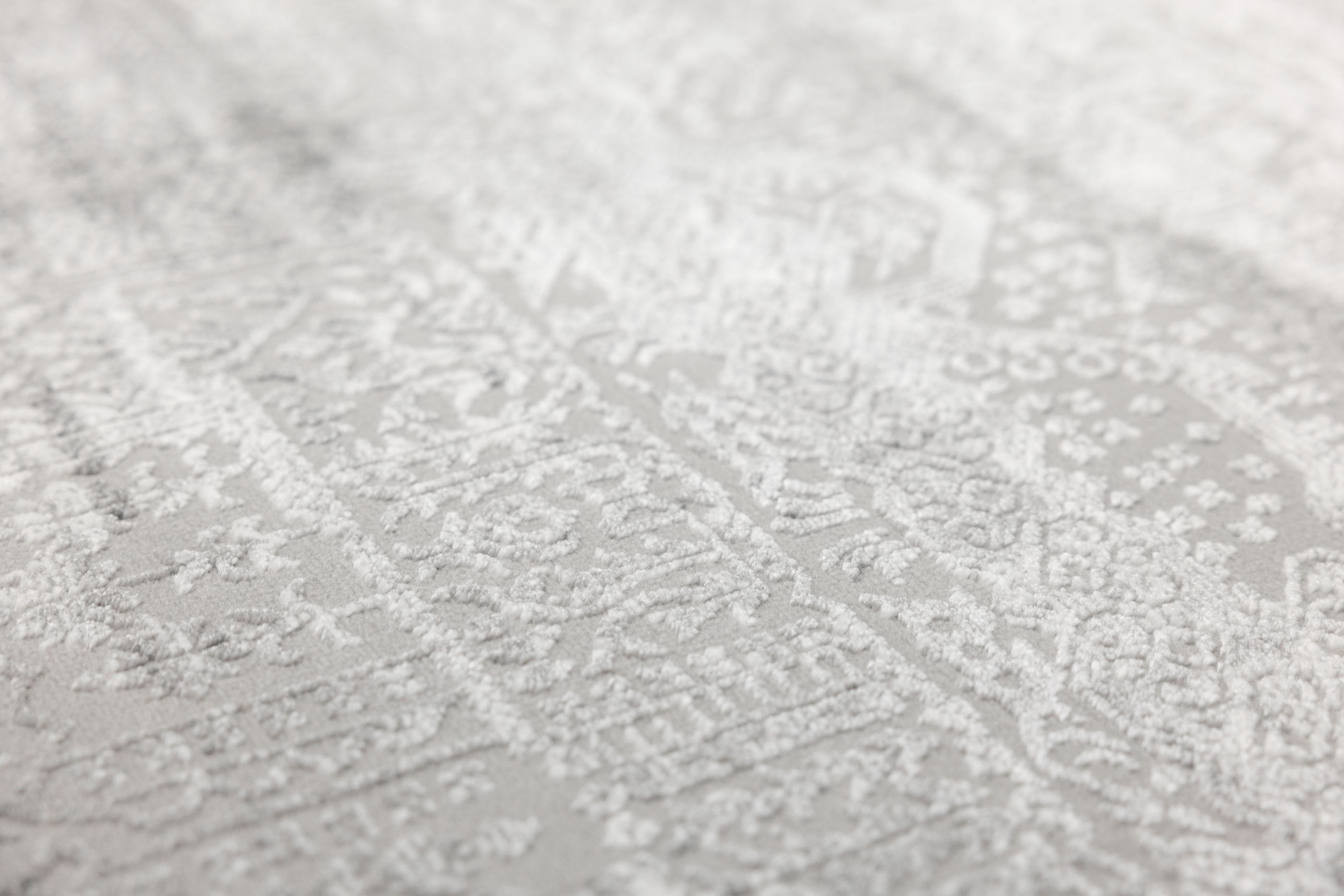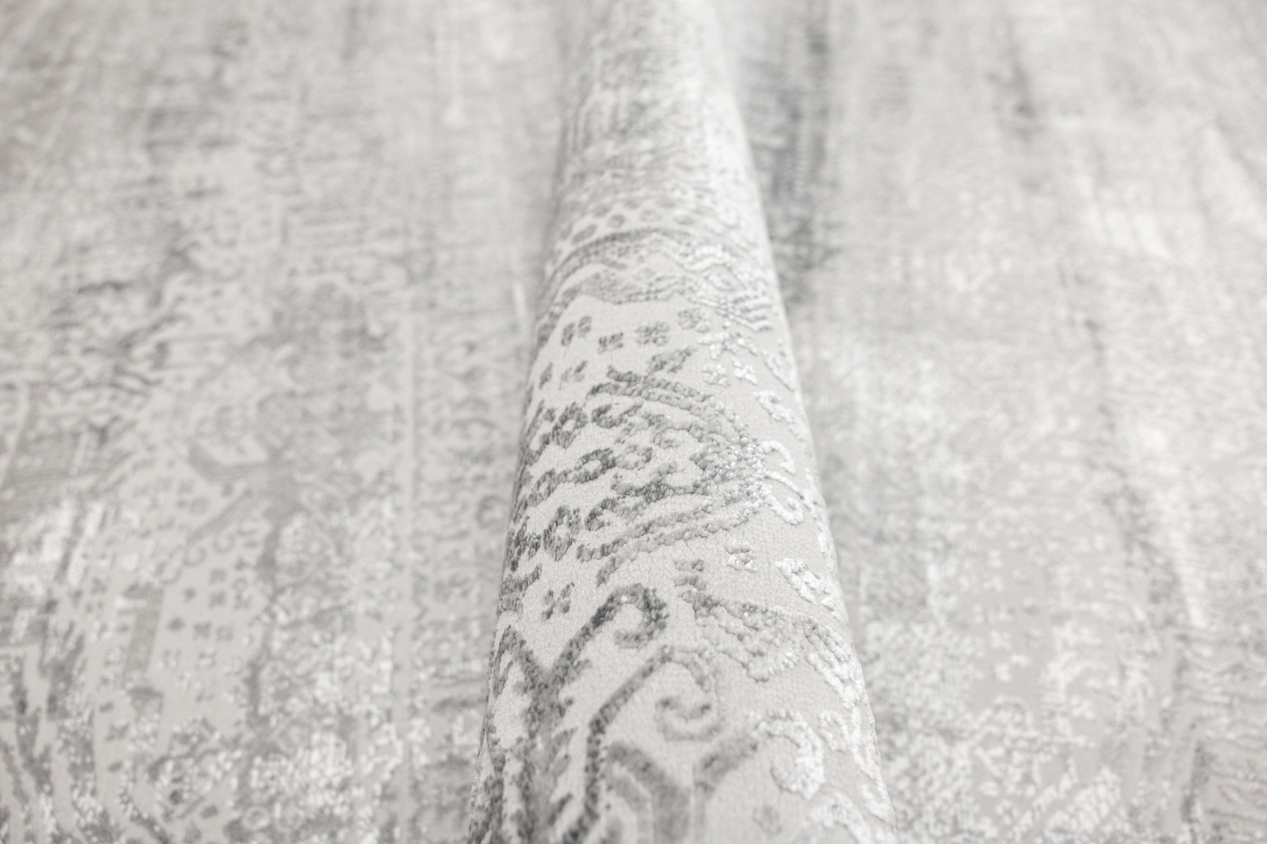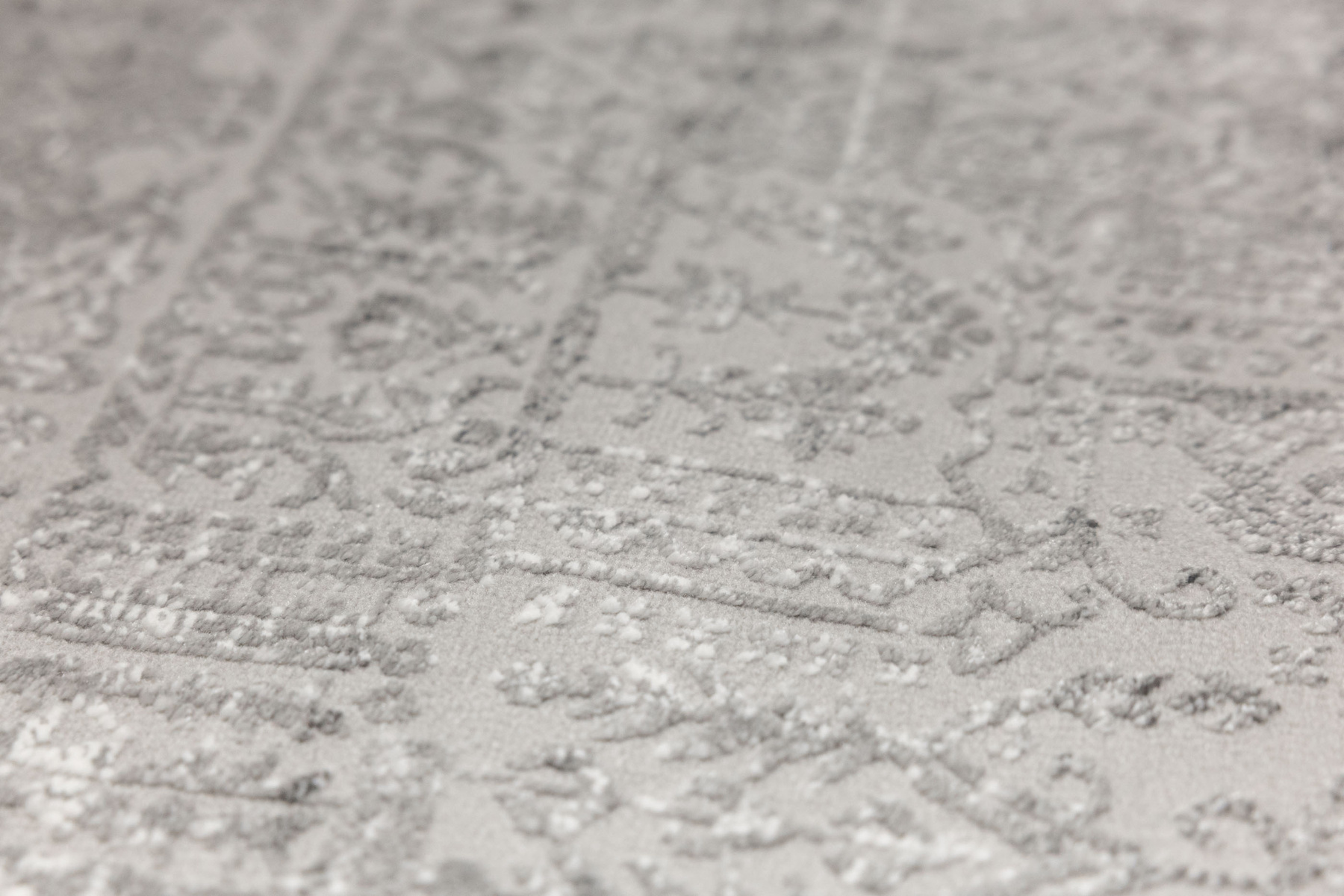 - Luksusowy dywan Nantes o mięciutkim, lekko lśniącym, dwupoziomowym runie ze złożonym wzorem ornamentowym, w odcieniach szarości z akcentami kremu, ze spodem wykończonym bawełną.