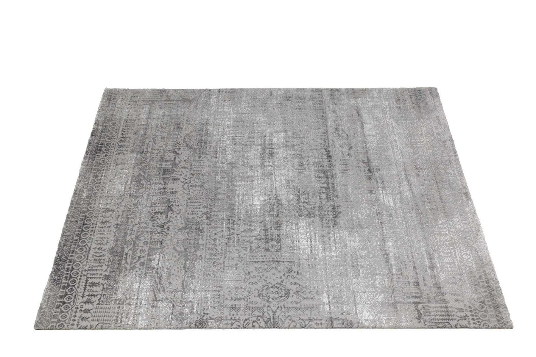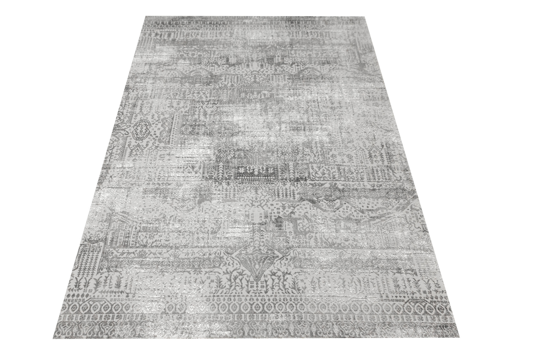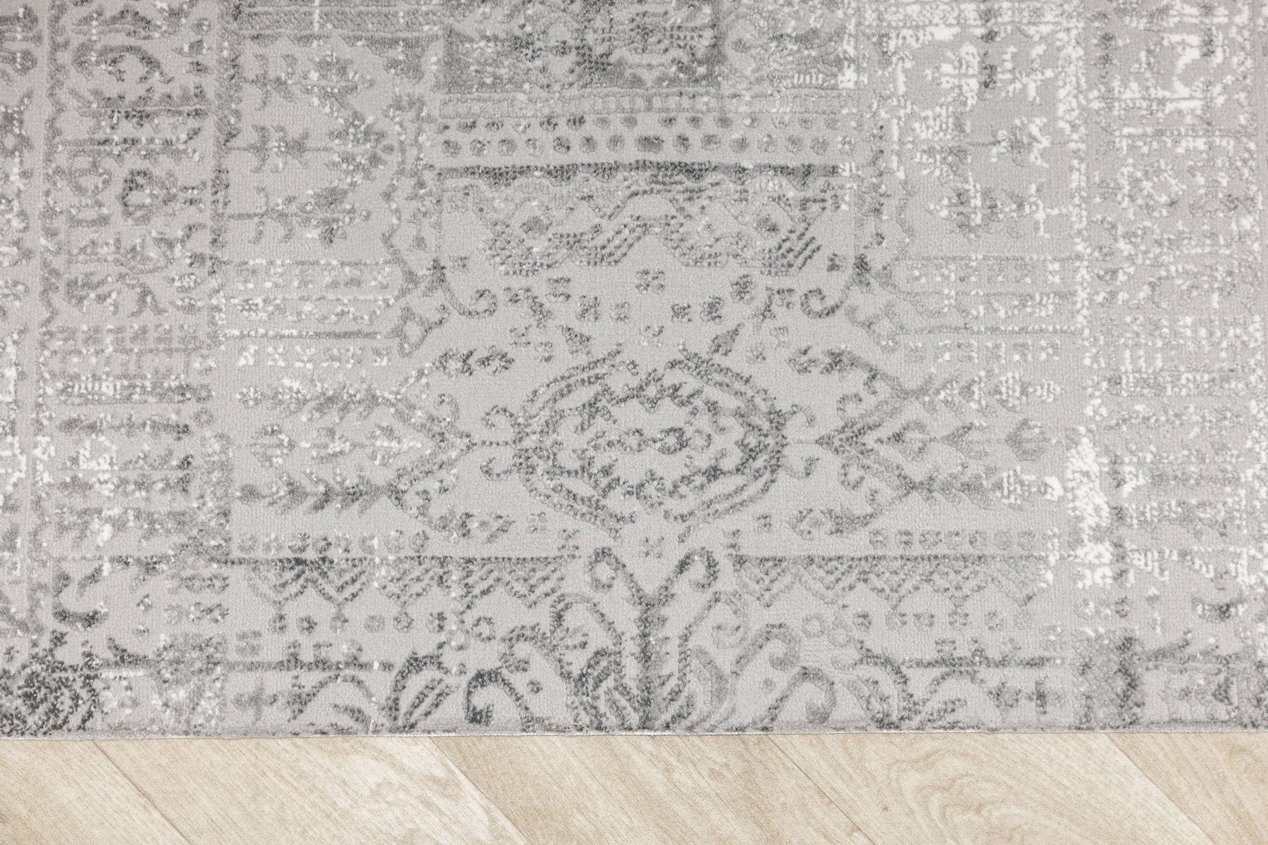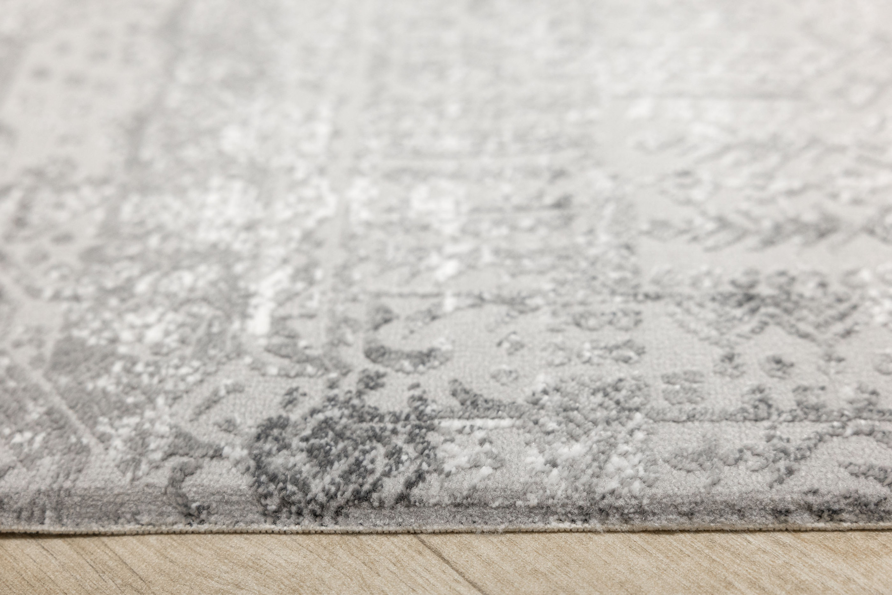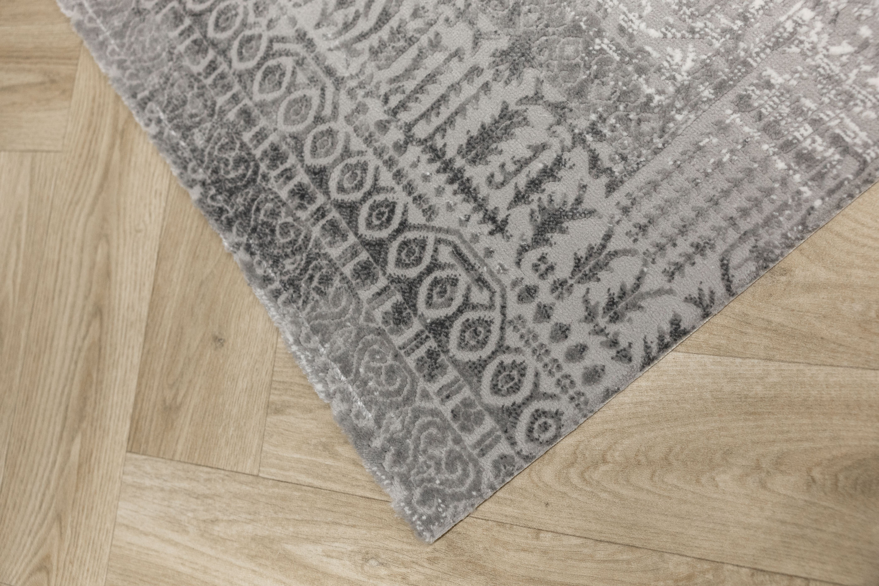 - Luksusowy dywan Nantes o mięciutkim, lekko lśniącym, dwupoziomowym runie ze złożonym wzorem ornamentowym, w odcieniach szarości z akcentami kremu, ze spodem wykończonym bawełną.