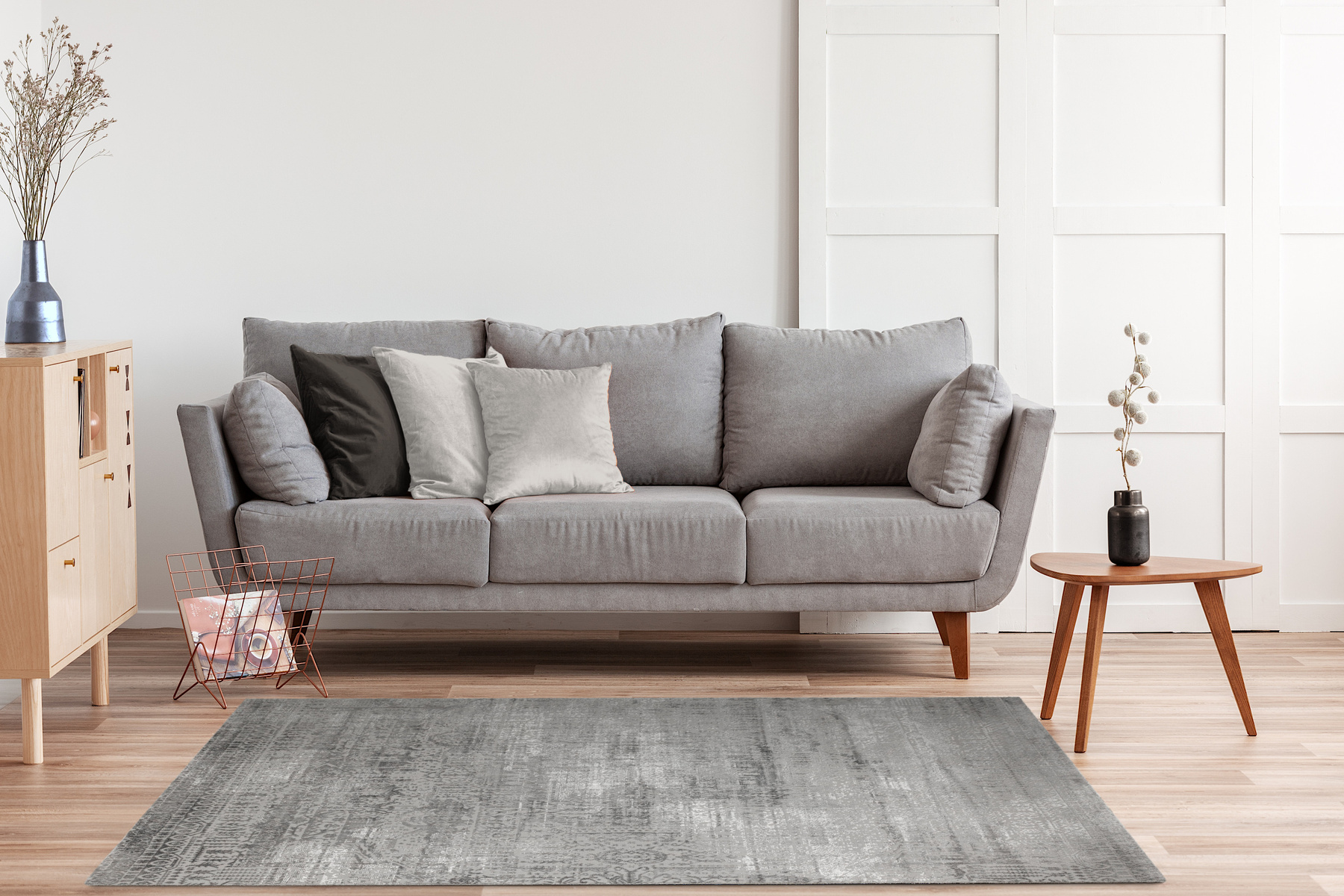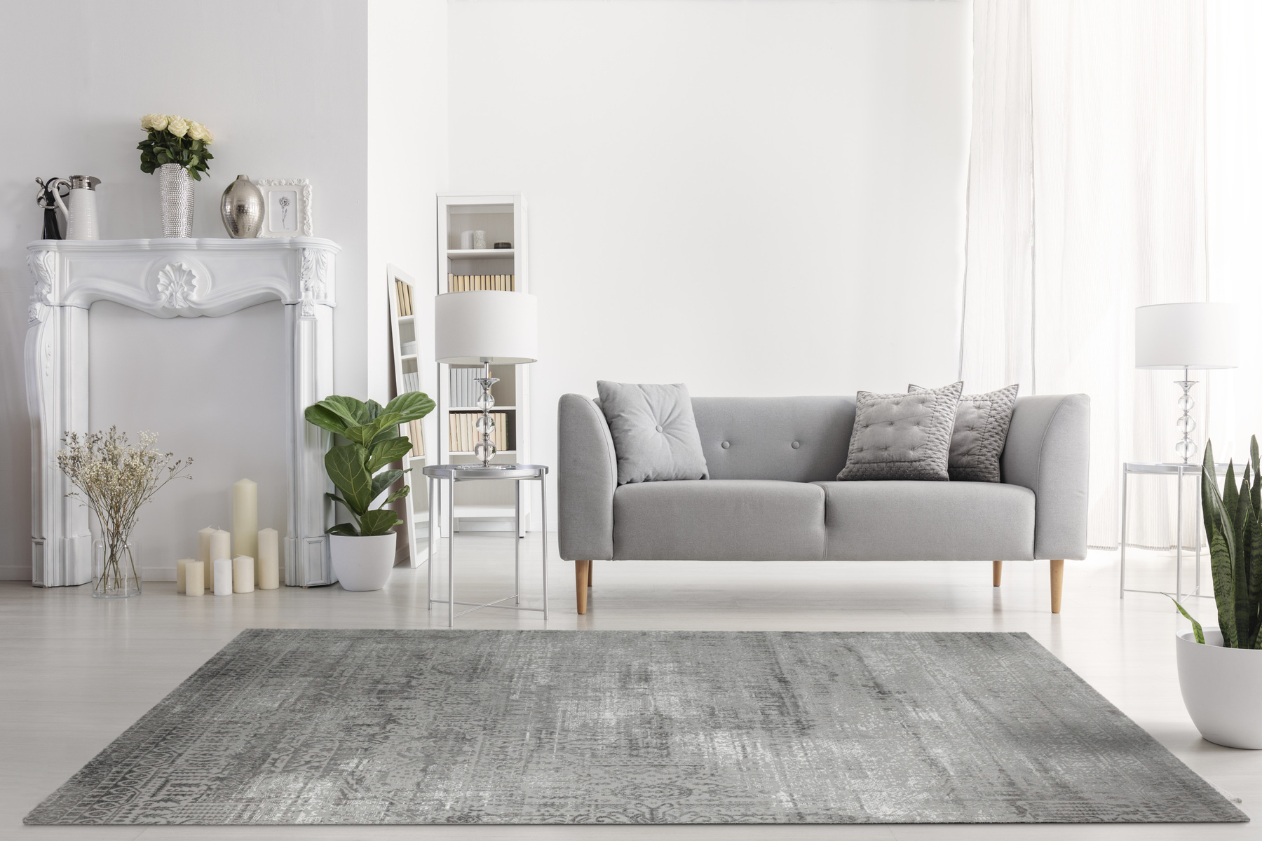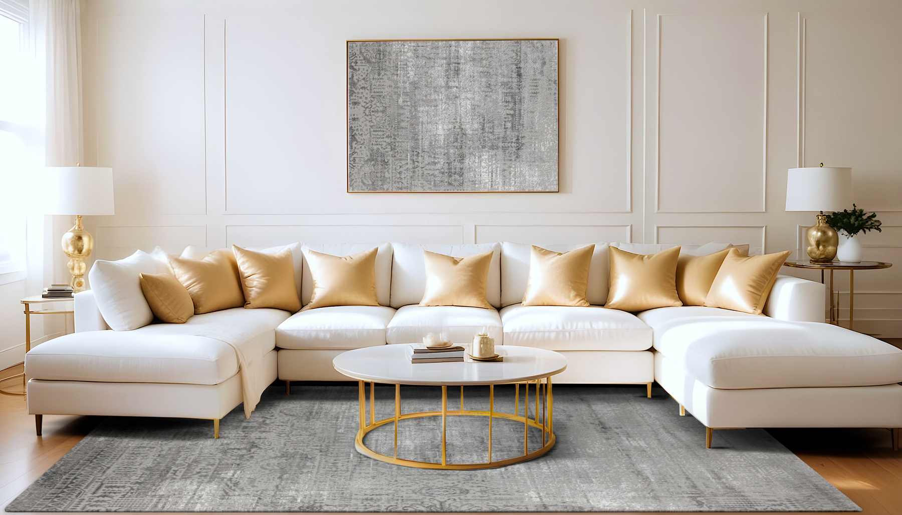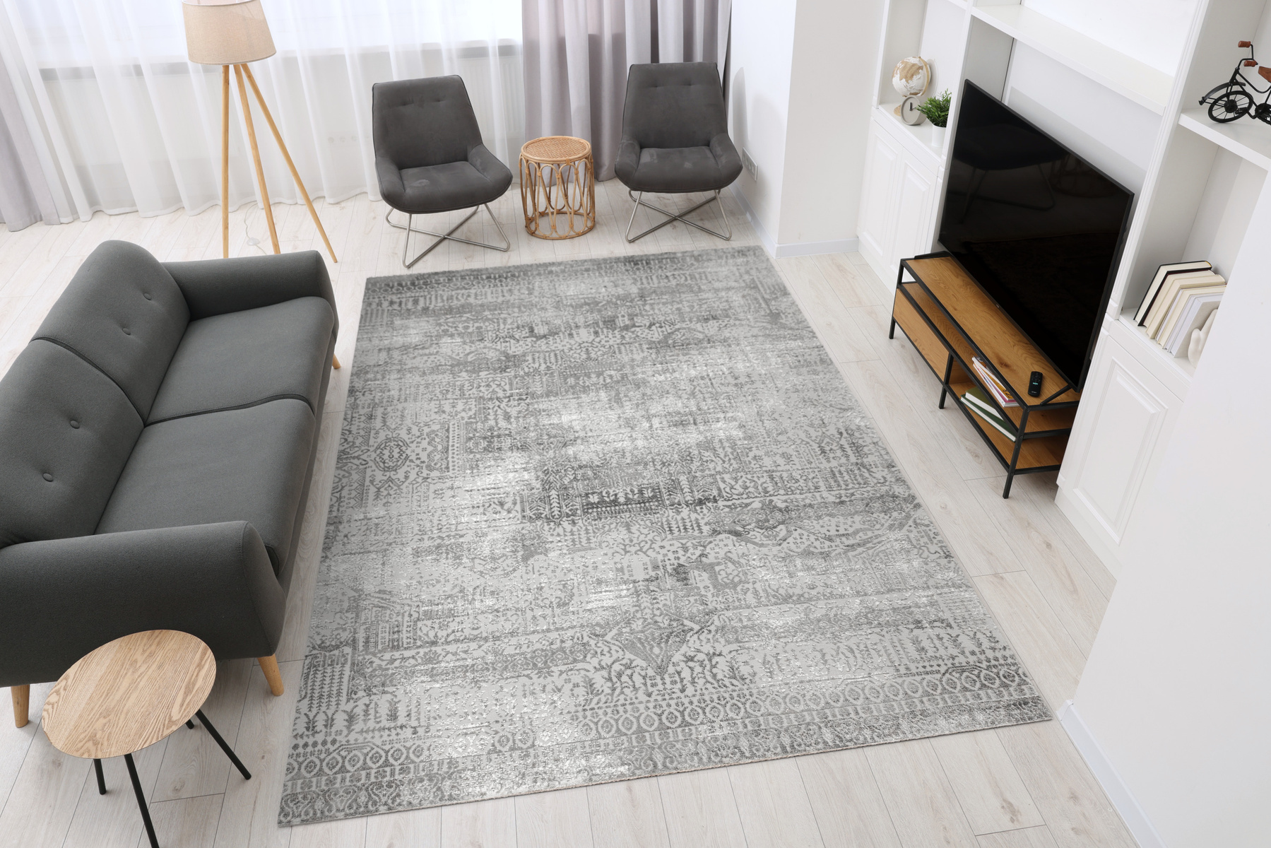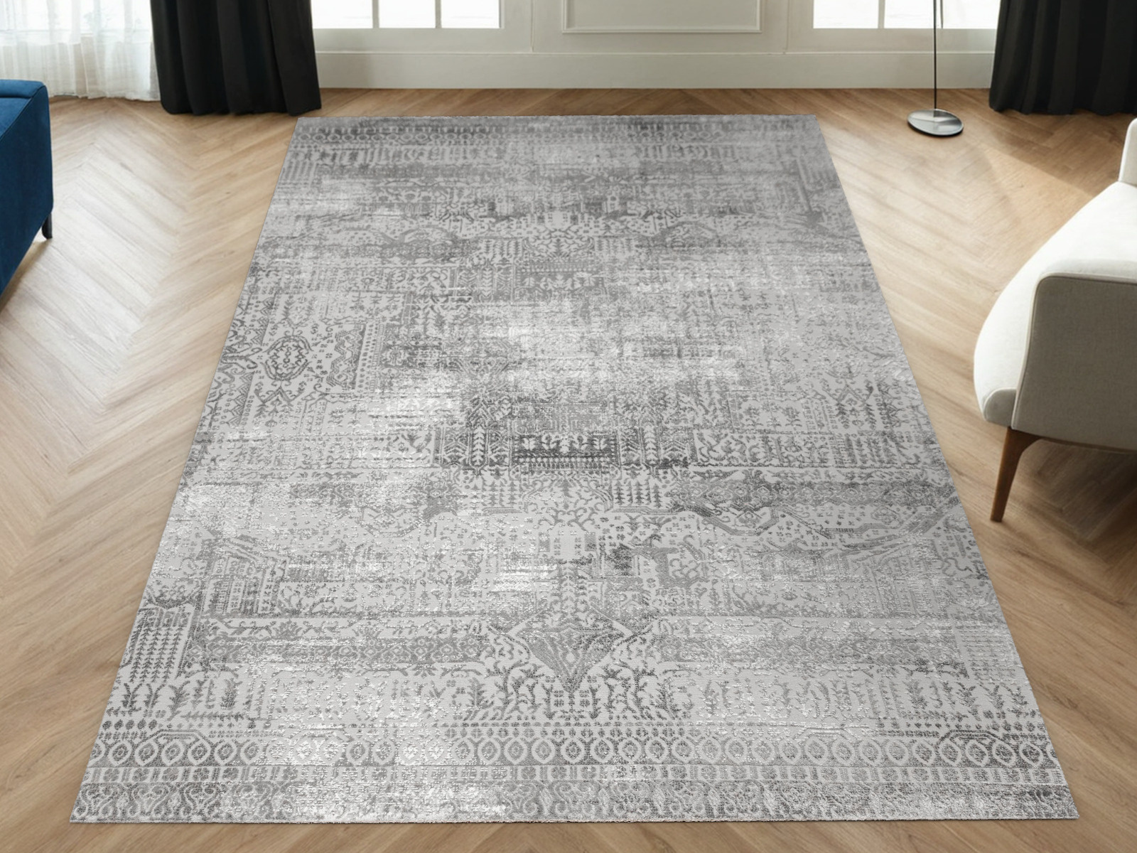 - Luksusowy dywan Nantes o mięciutkim, lekko lśniącym, dwupoziomowym runie ze złożonym wzorem ornamentowym, w odcieniach szarości z akcentami kremu, ze spodem wykończonym bawełną.