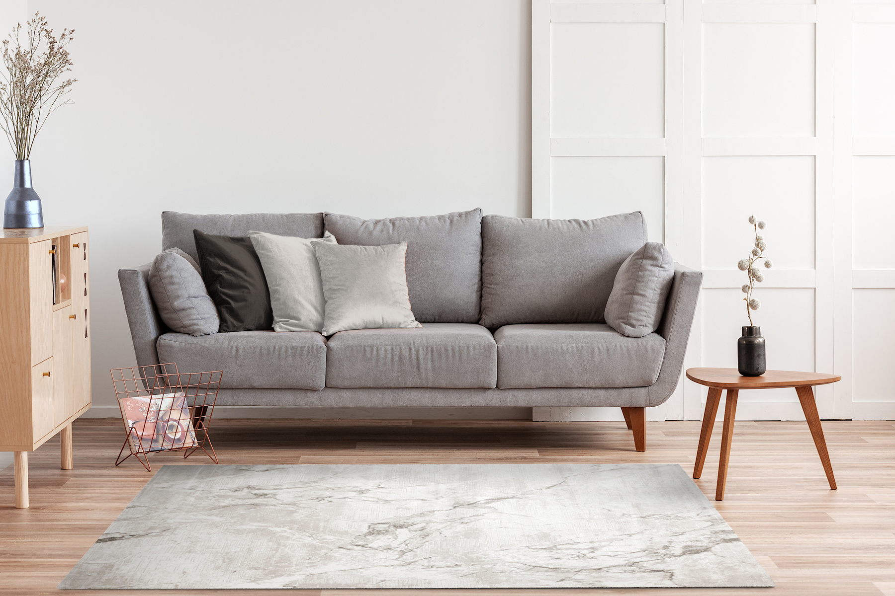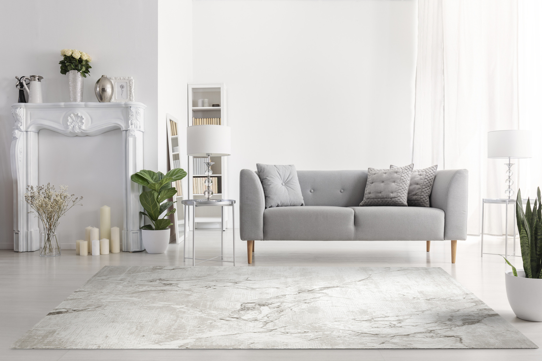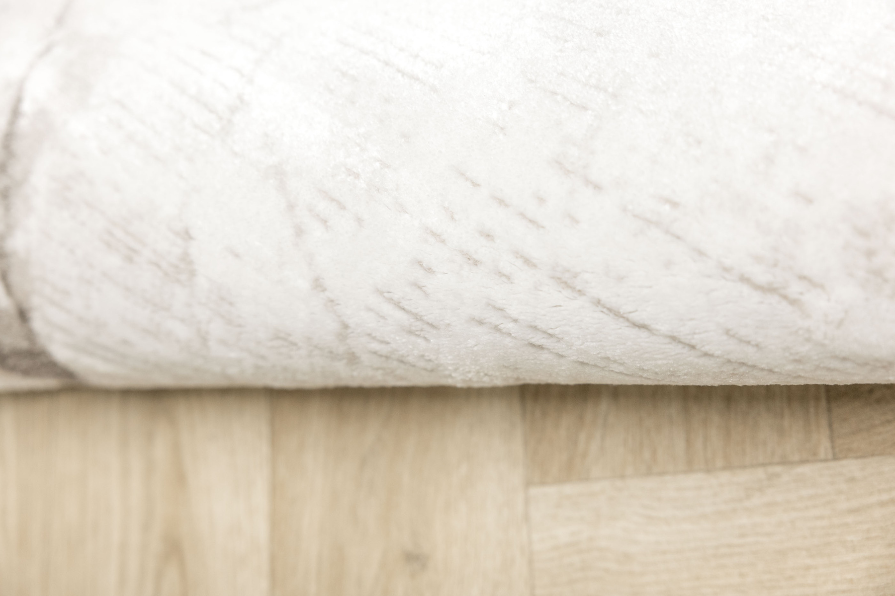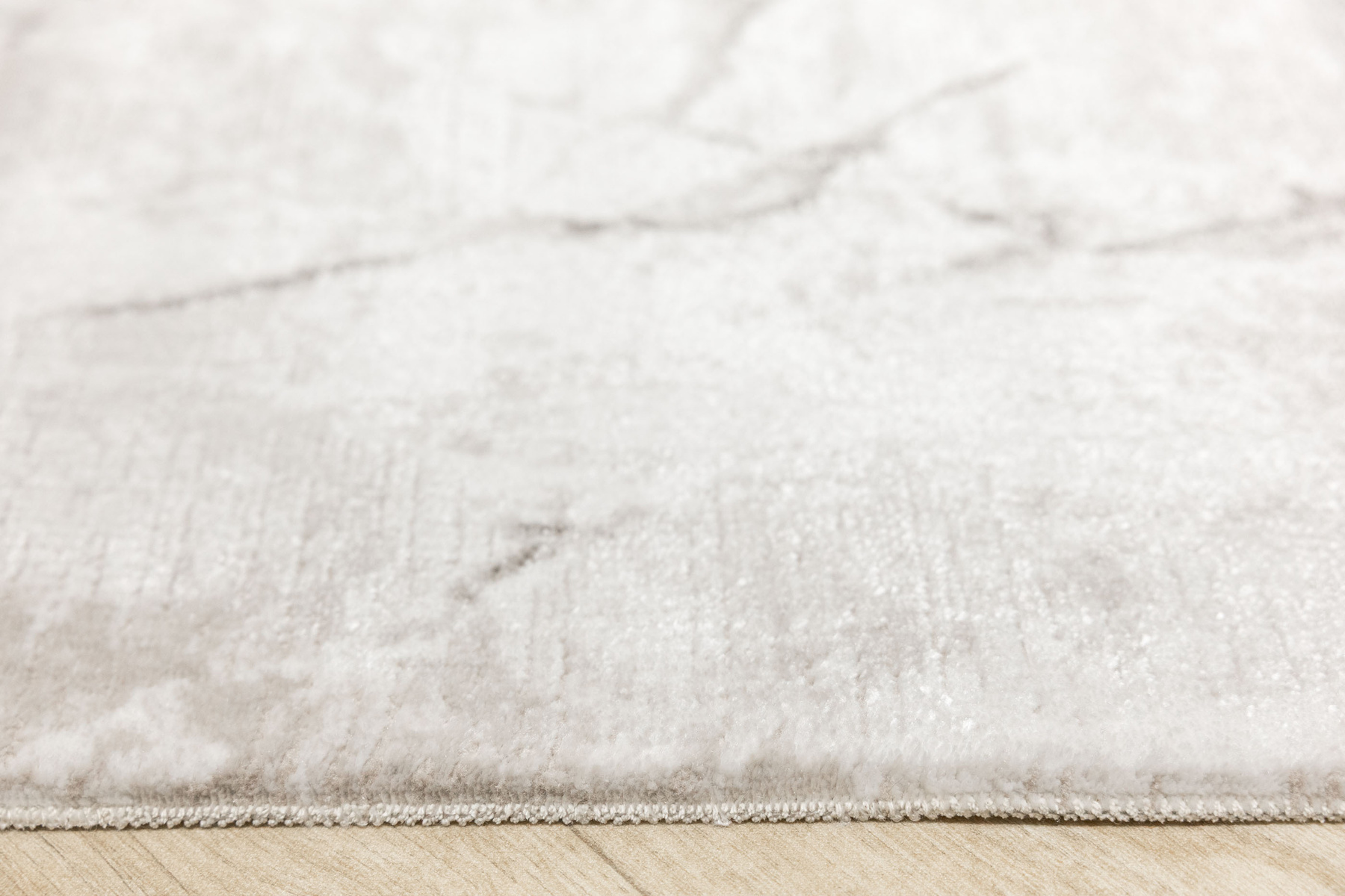 • Luksusowy dywan Nantes o mięciutkim, lekko lśniącym, dwupoziomowym runie z przecieranym wzorem imitującym taflę marmuru, w odcieniach szarości zmieszanej z beżem z akcentami kremu, ze spodem wykończonym bawełną.