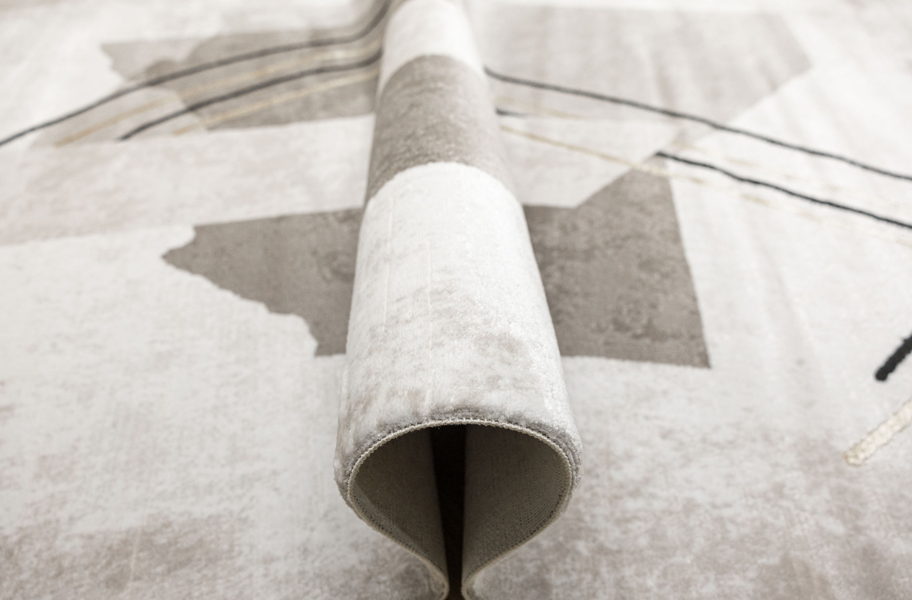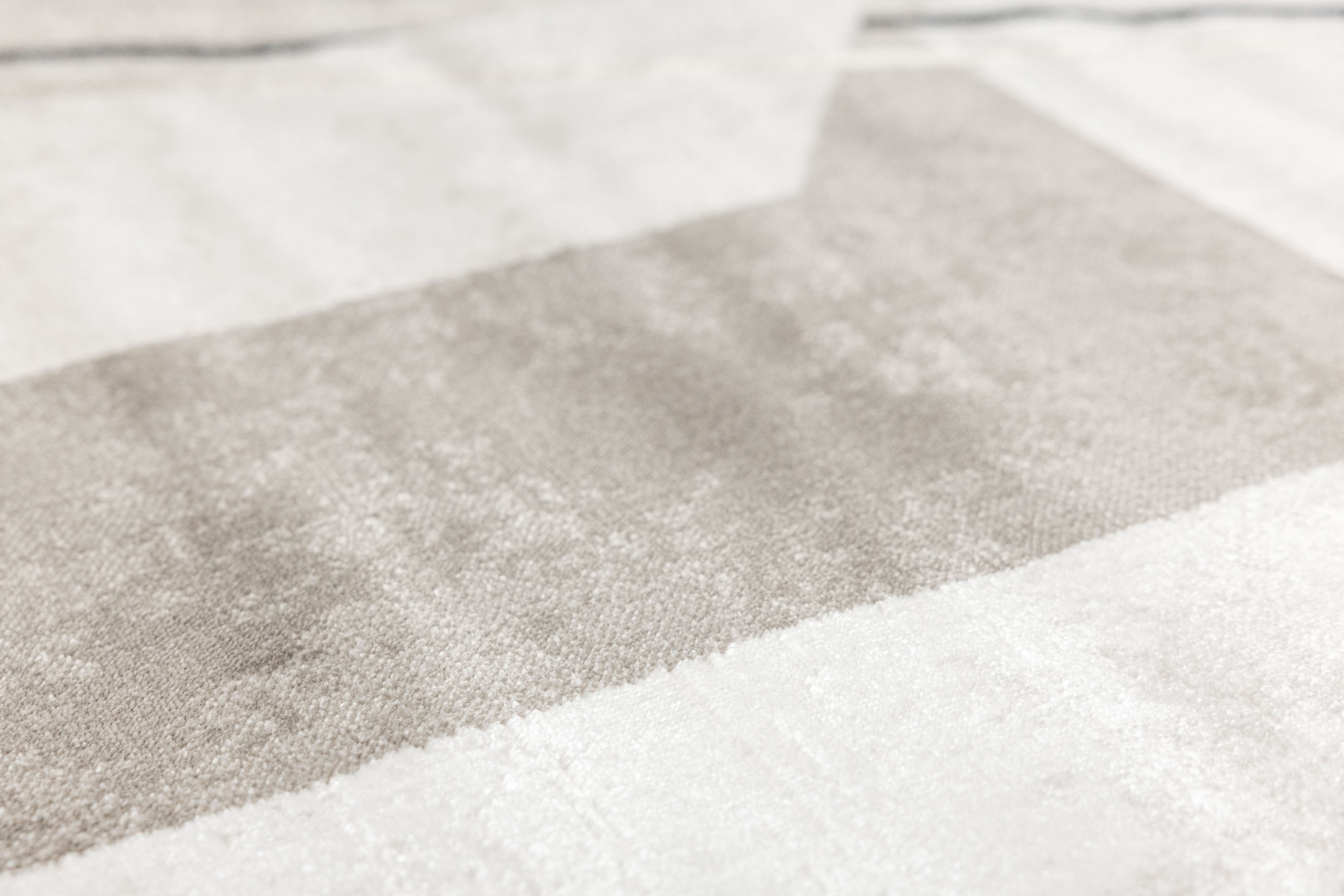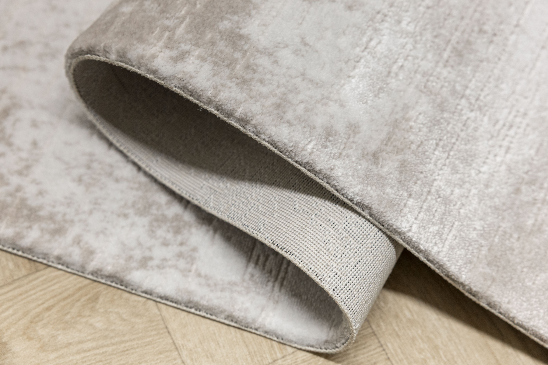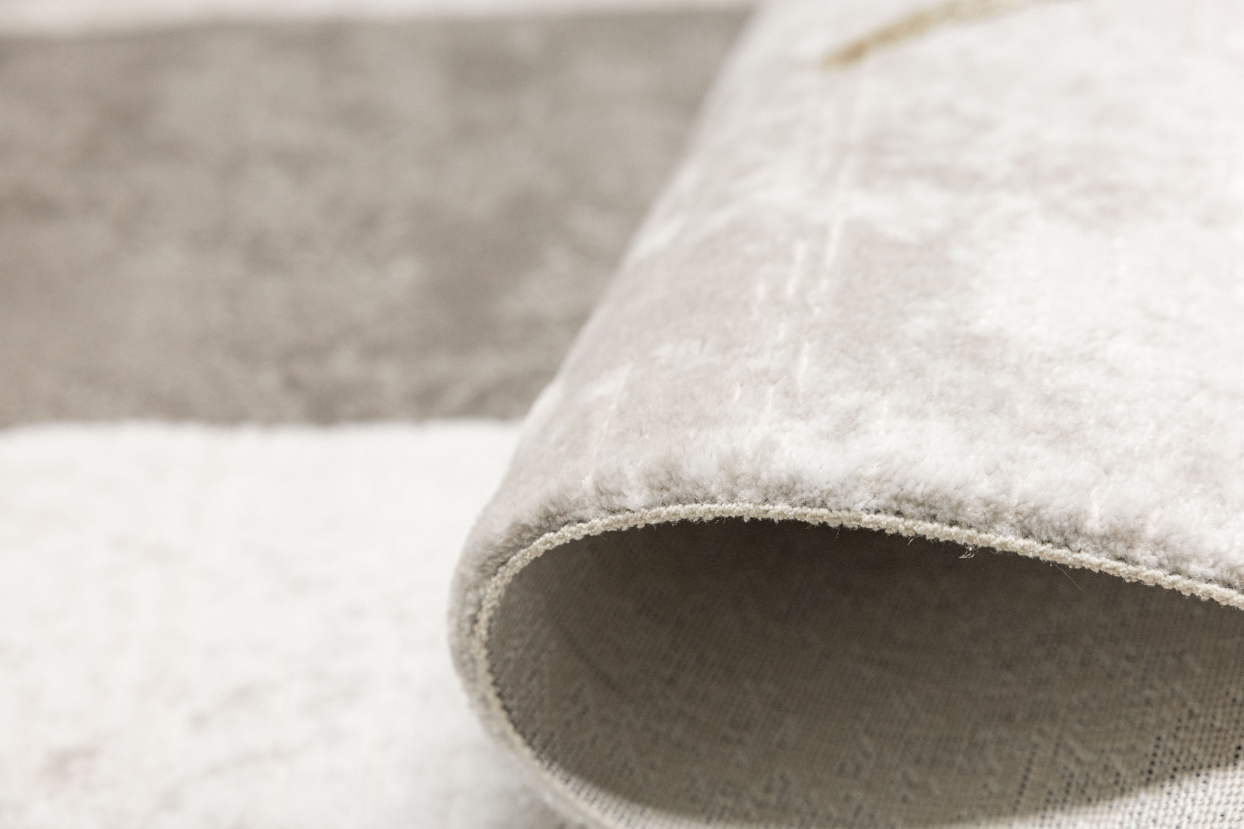 - Luksusowy dywan Kashmir o mięciutkim, lekko lśniącym, dwupoziomowym runie z abstrakcyjnym wzorem, w odcieniach szarości zmieszanej z beżem z akcentami kremu, czerni i złota, ze spodem wykończonym bawełną.
