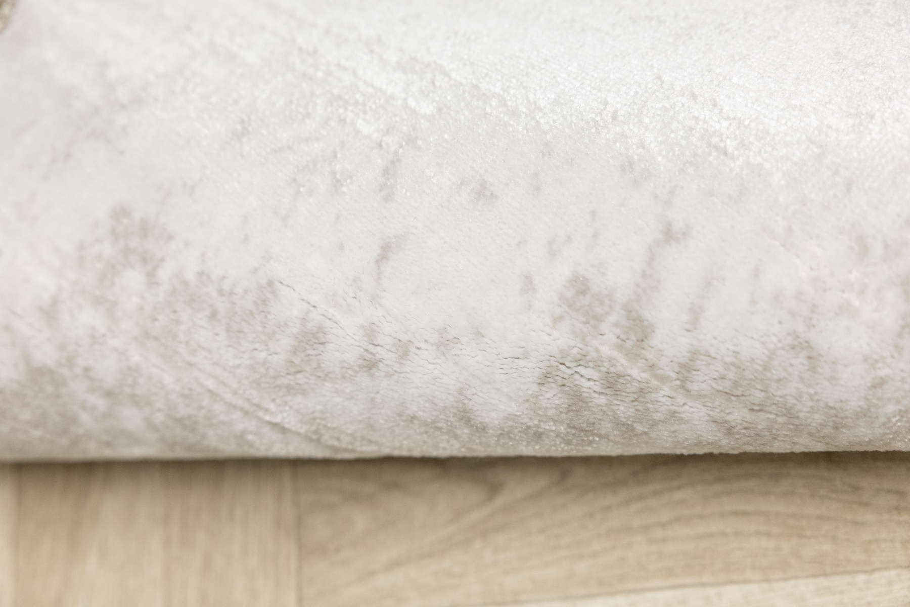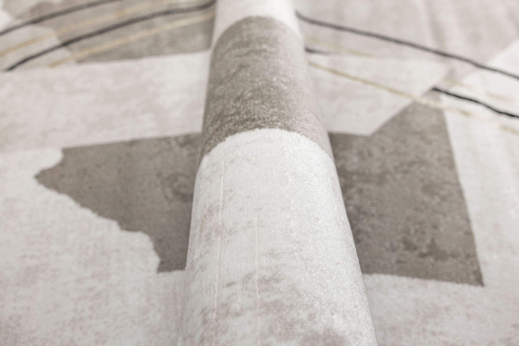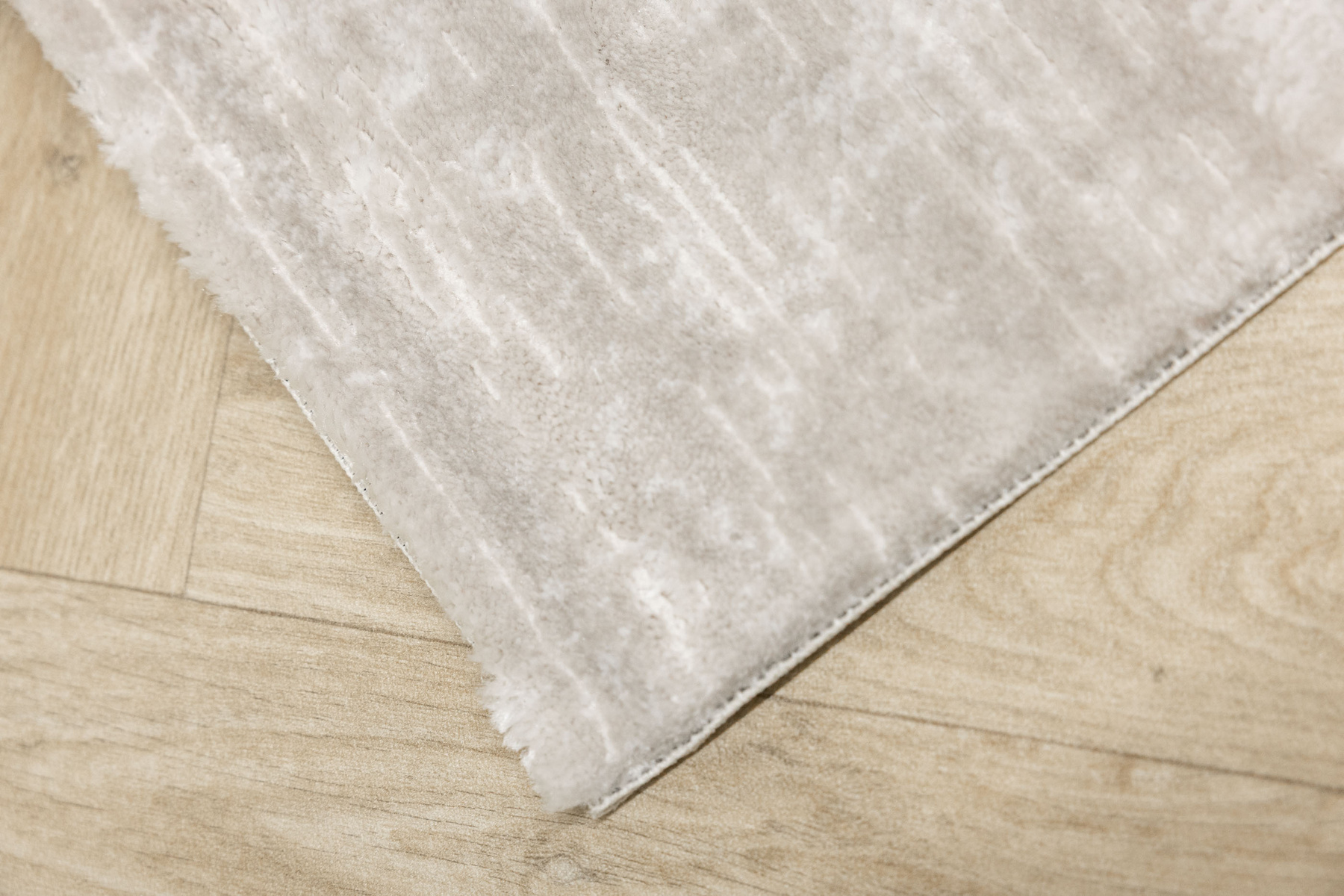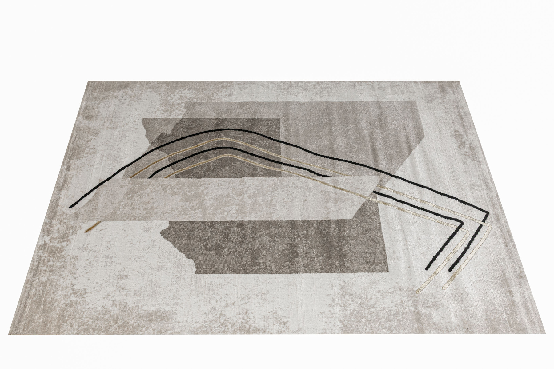 - Luksusowy dywan Kashmir o mięciutkim, lekko lśniącym, dwupoziomowym runie z abstrakcyjnym wzorem, w odcieniach szarości zmieszanej z beżem z akcentami kremu, czerni i złota, ze spodem wykończonym bawełną.