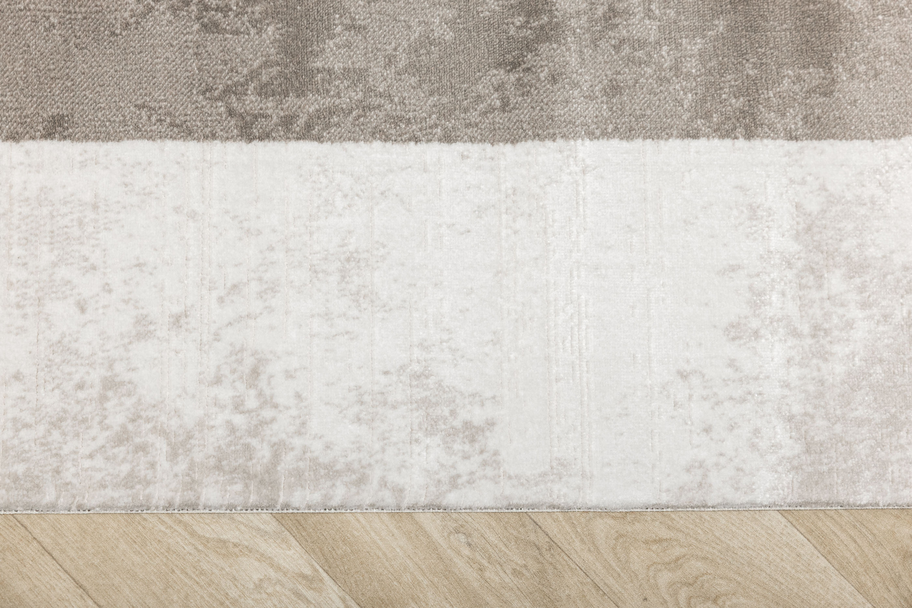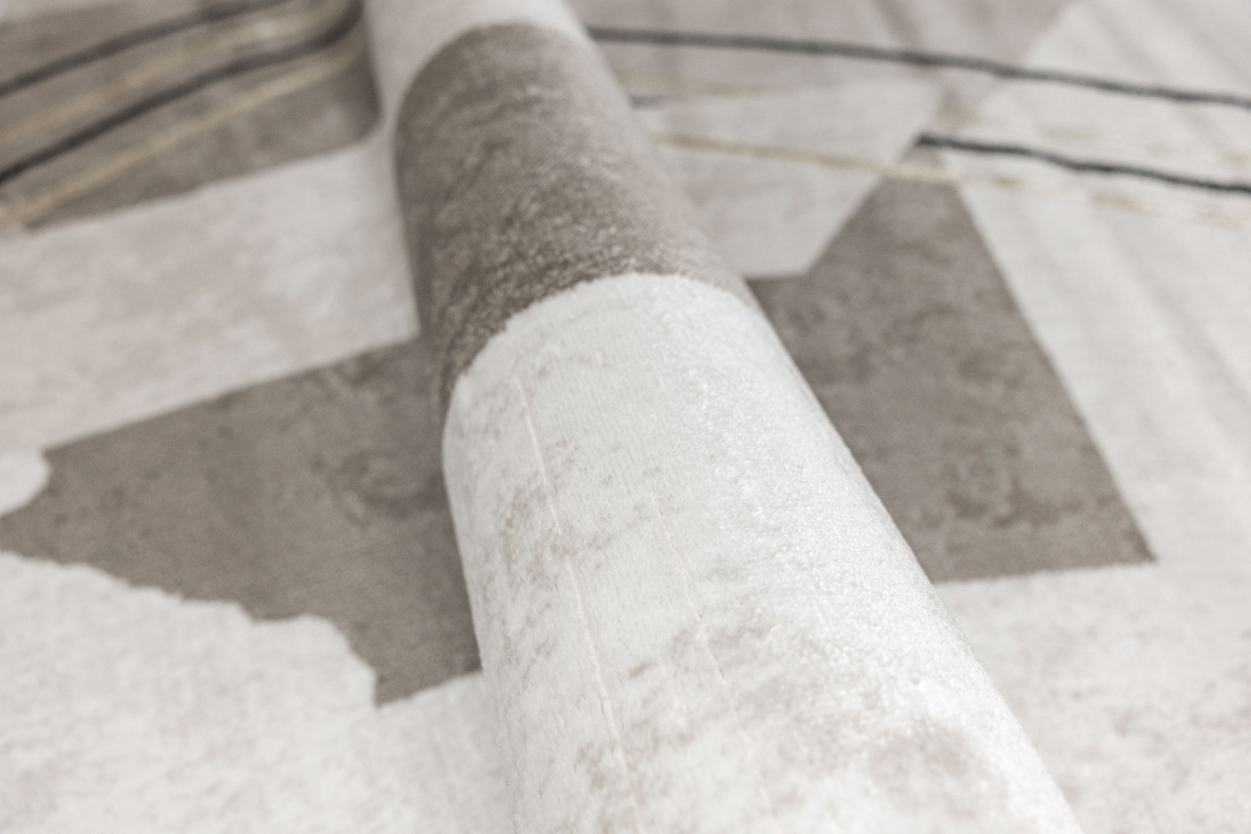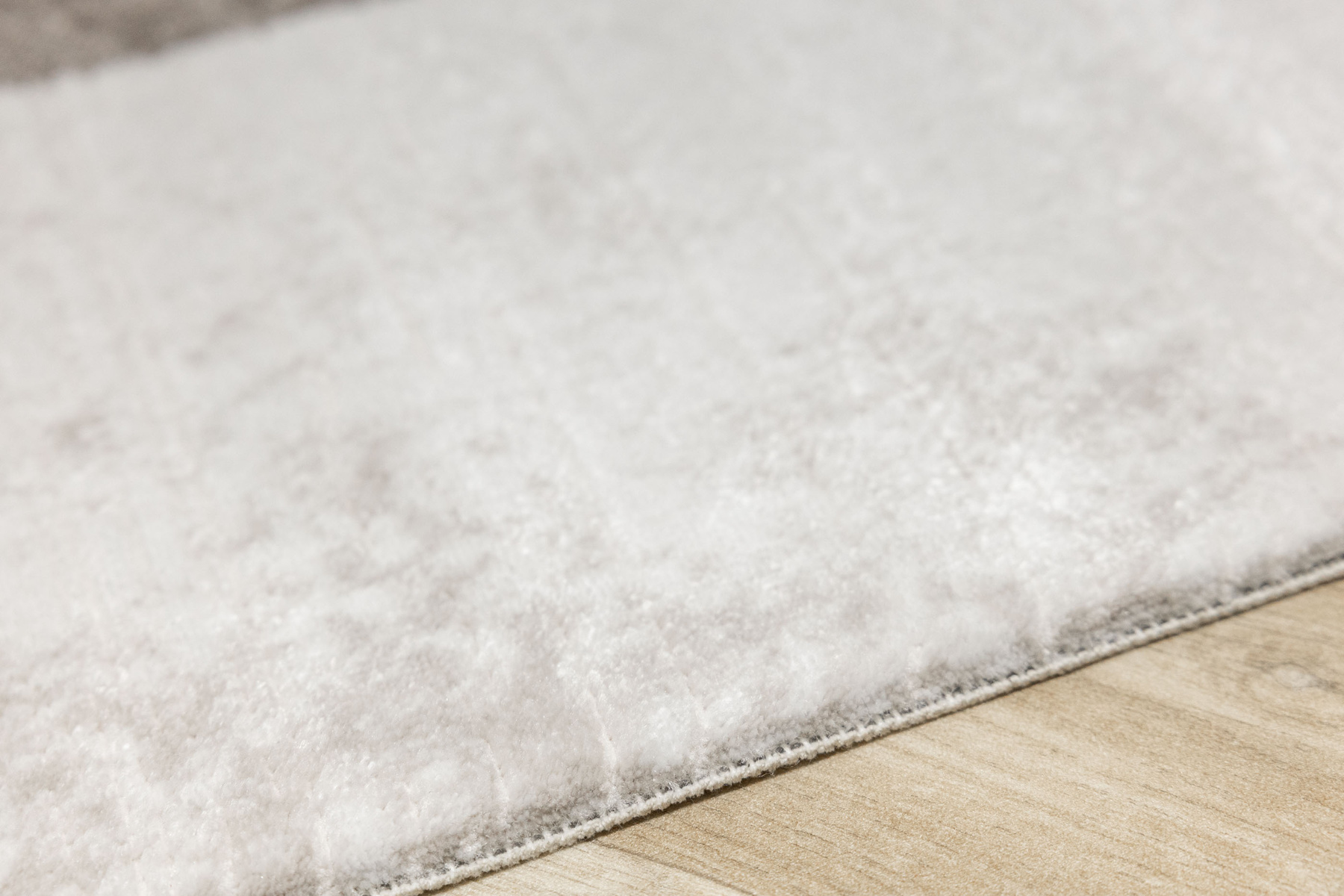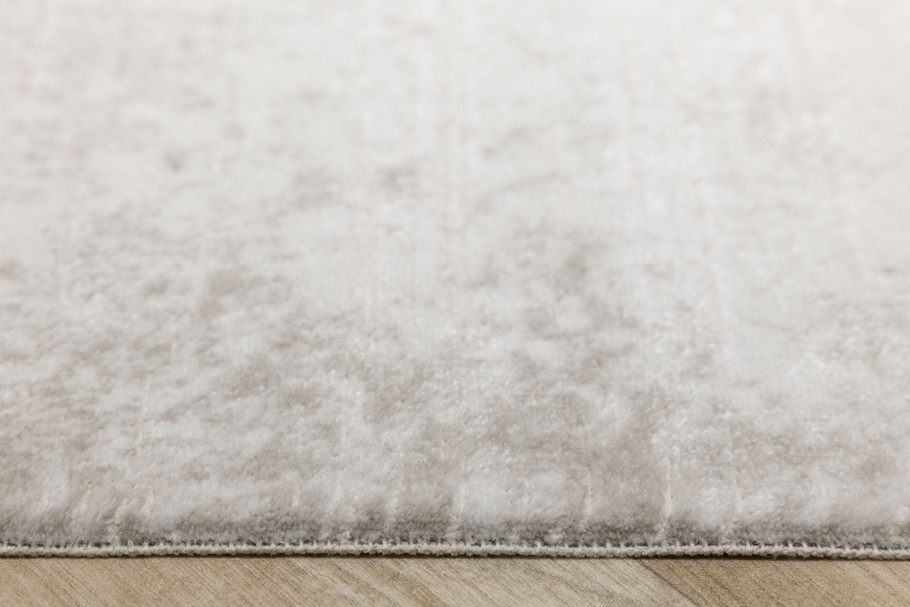 - Luksusowy dywan Kashmir o mięciutkim, lekko lśniącym, dwupoziomowym runie z abstrakcyjnym wzorem, w odcieniach szarości zmieszanej z beżem z akcentami kremu, czerni i złota, ze spodem wykończonym bawełną.