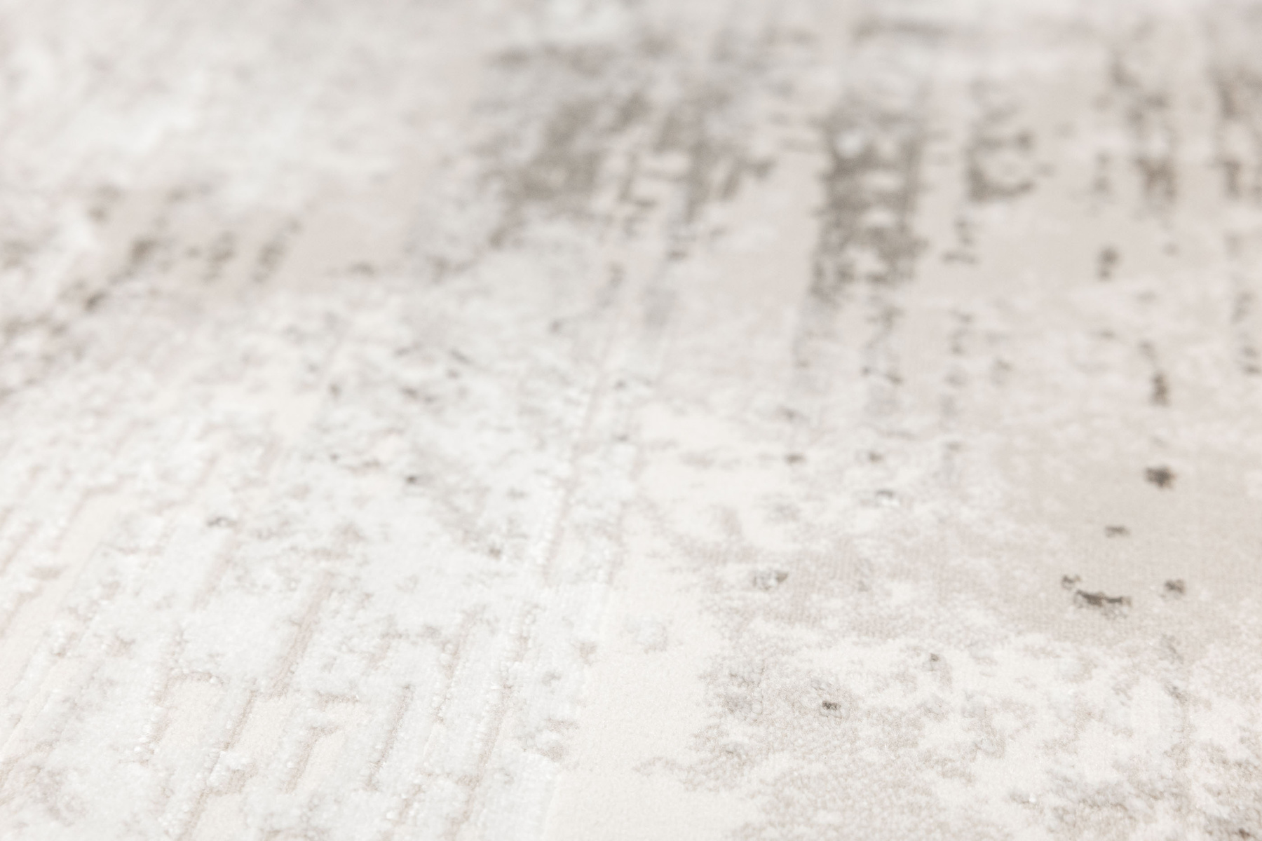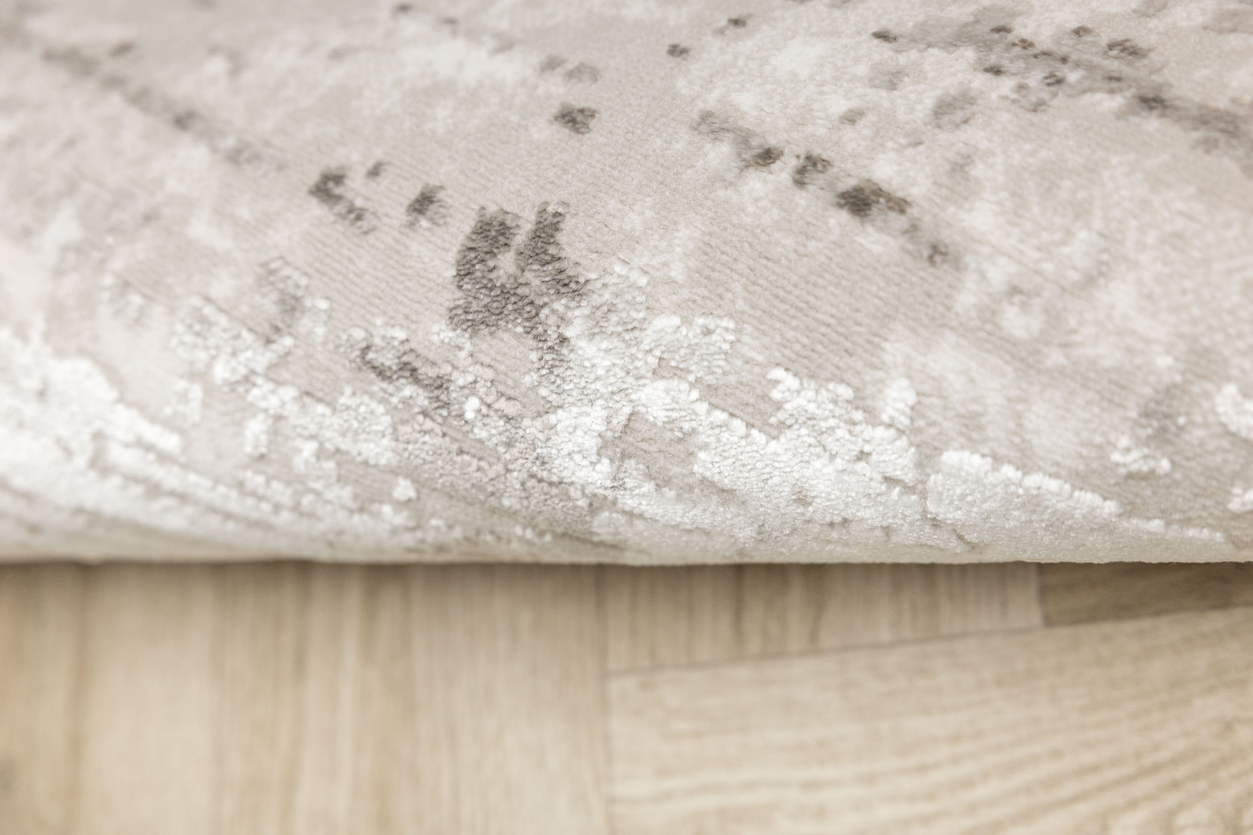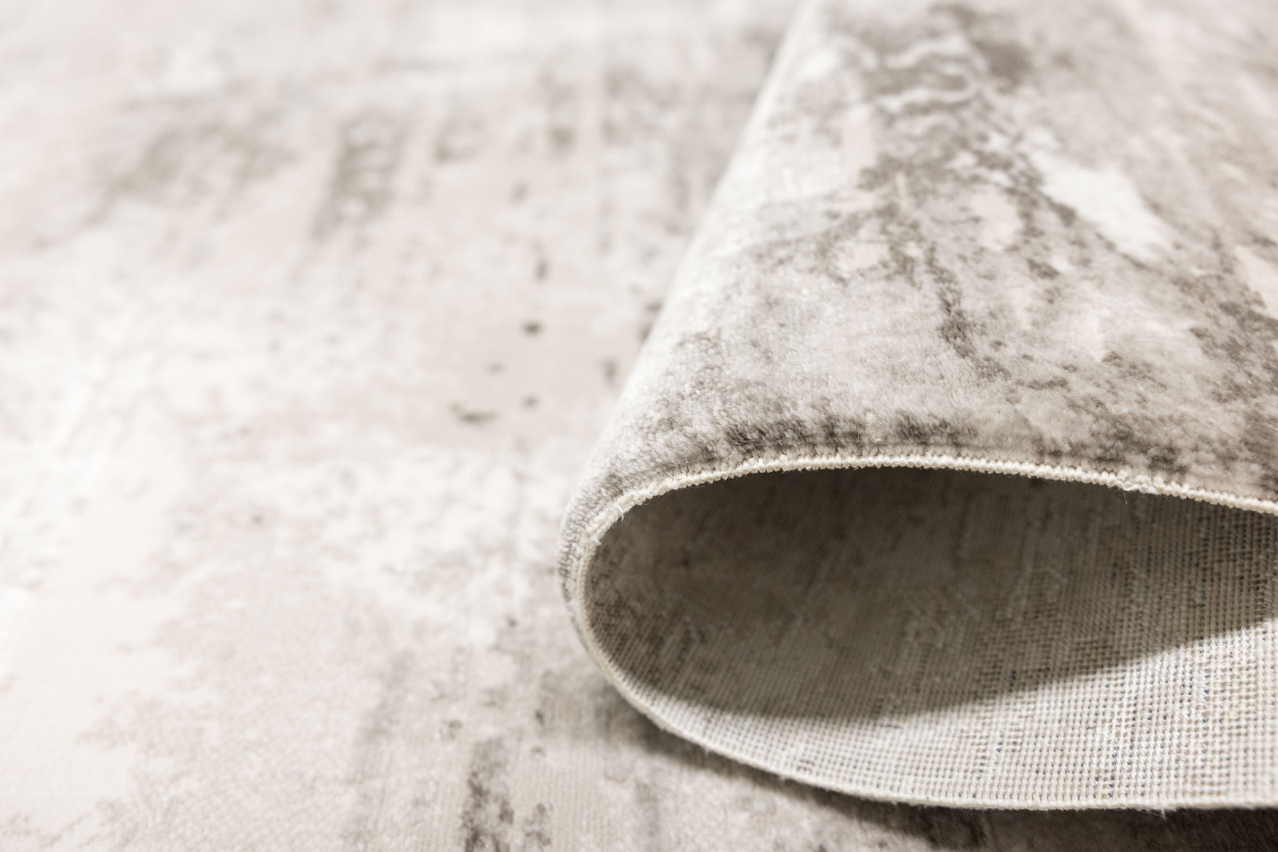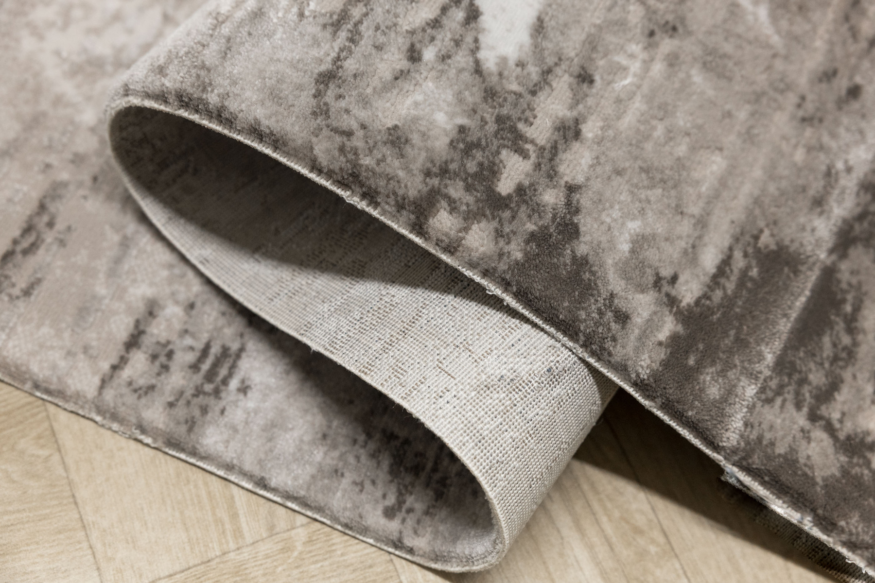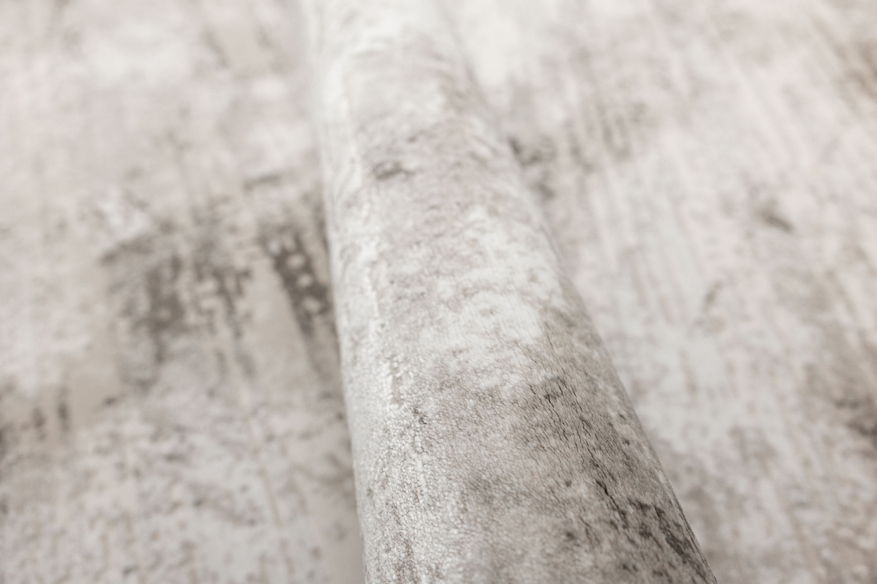 • Luksusowy dywan Nantes o mięciutkim, lekko lśniącym, dwupoziomowym runie z przecieranym wzorem imitującym taflę marmuru, w odcieniach szarości zmieszanej z beżem z akcentami kremu, ze spodem wykończonym bawełną.