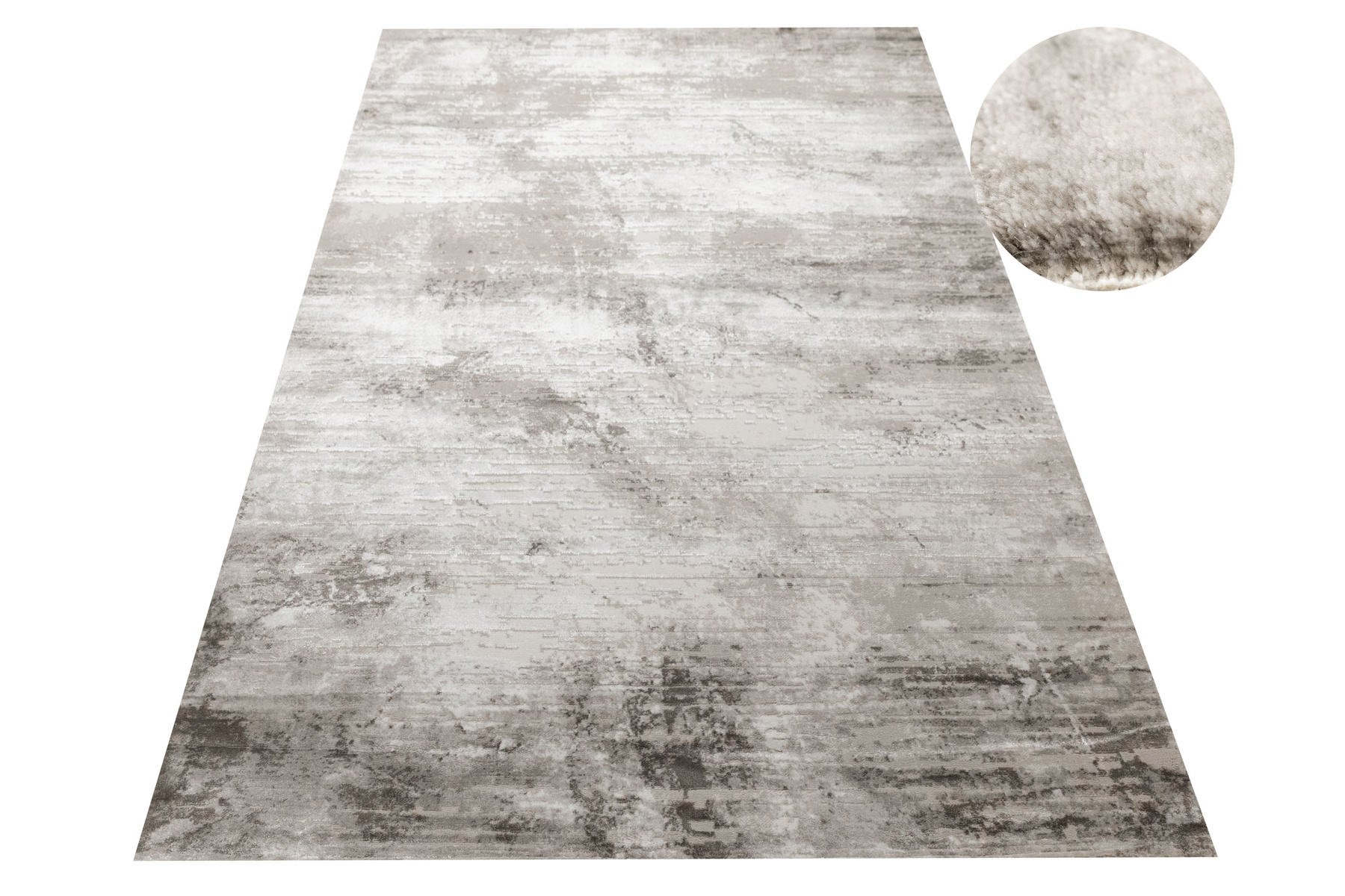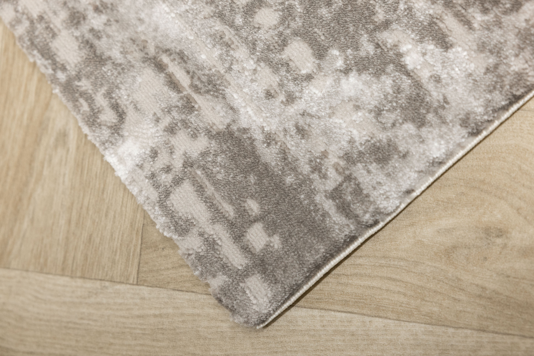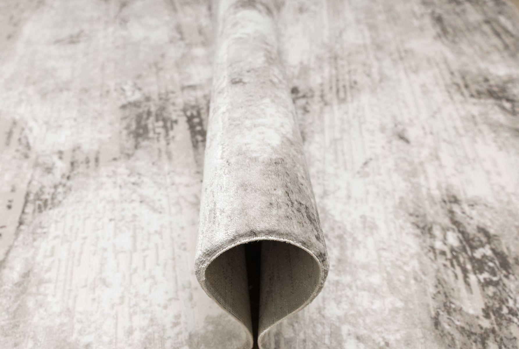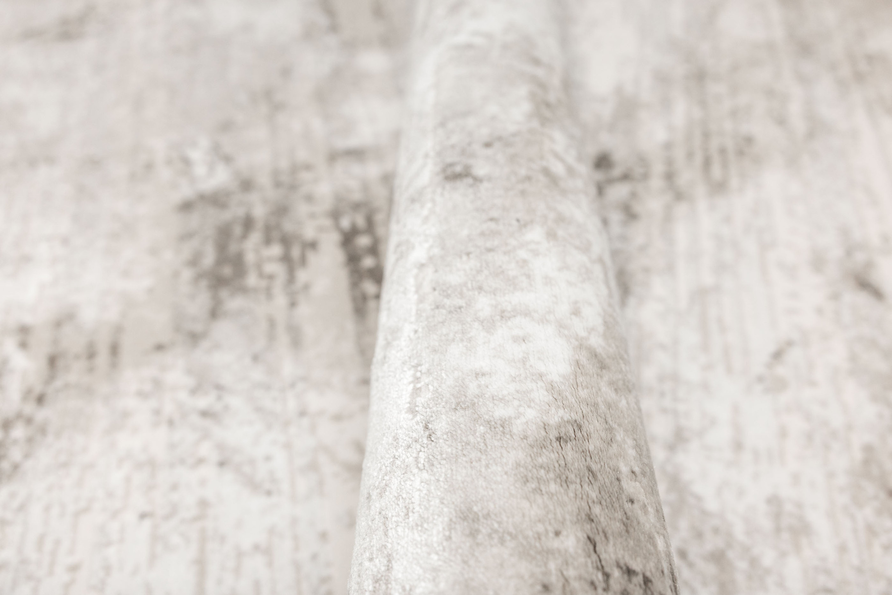 • Luksusowy dywan Nantes o mięciutkim, lekko lśniącym, dwupoziomowym runie z przecieranym wzorem imitującym taflę marmuru, w odcieniach szarości zmieszanej z beżem z akcentami kremu, ze spodem wykończonym bawełną.