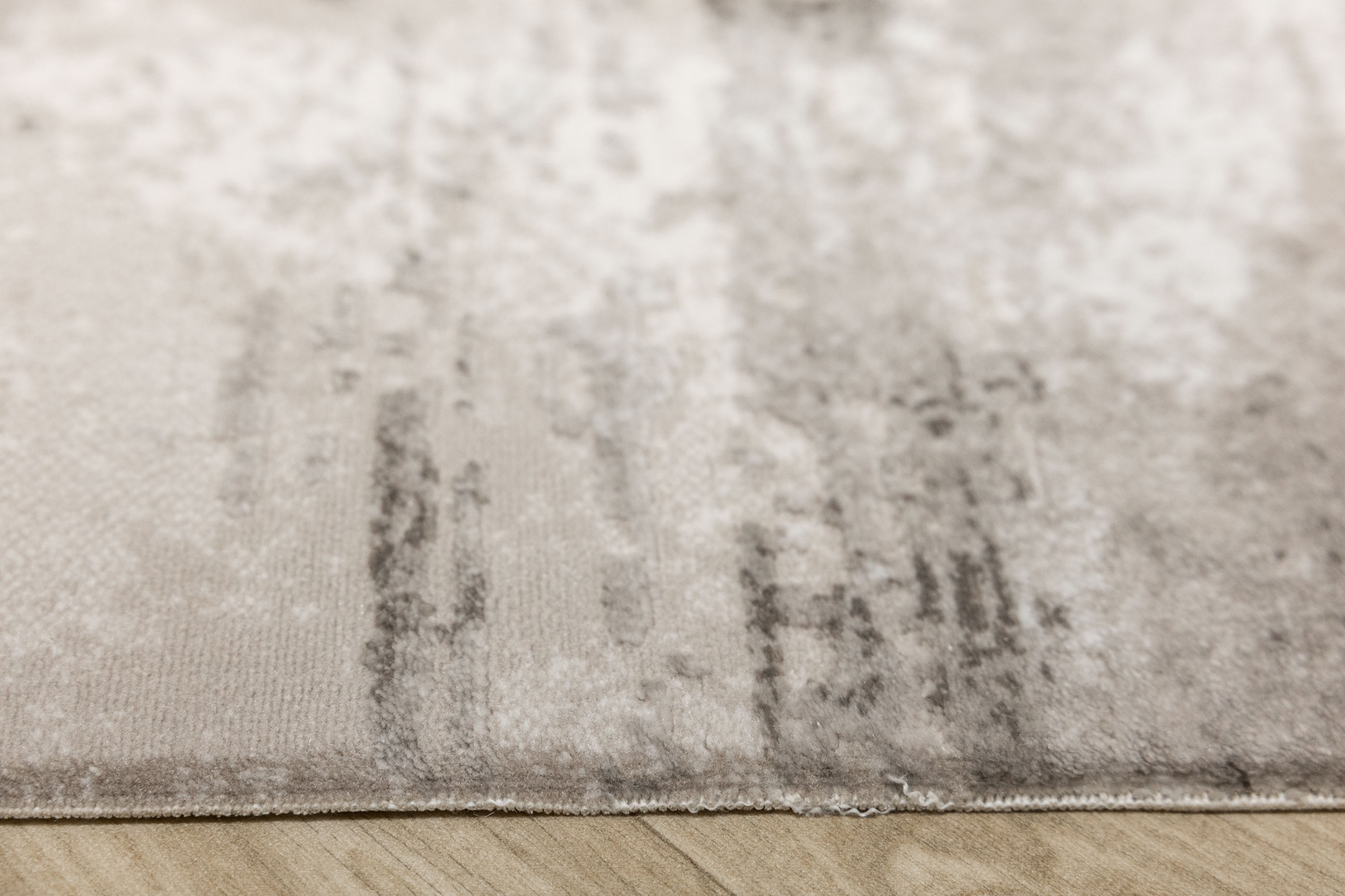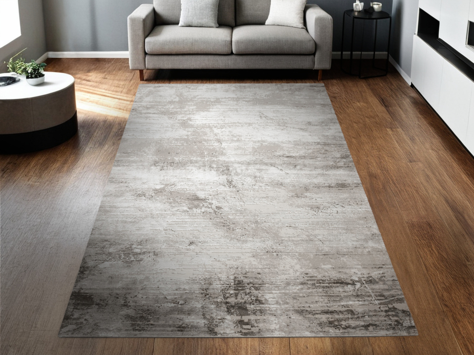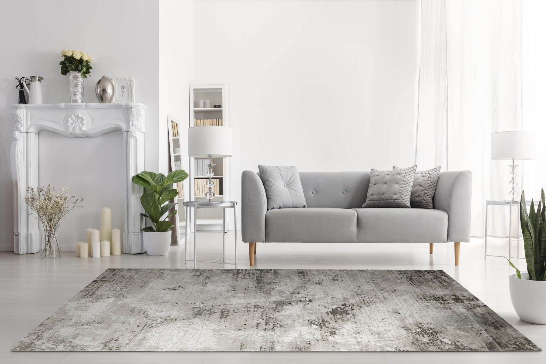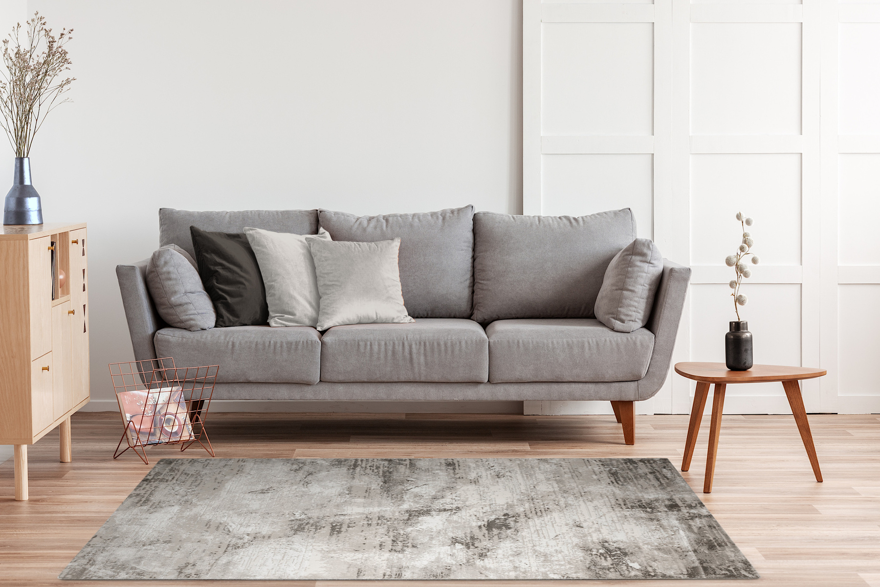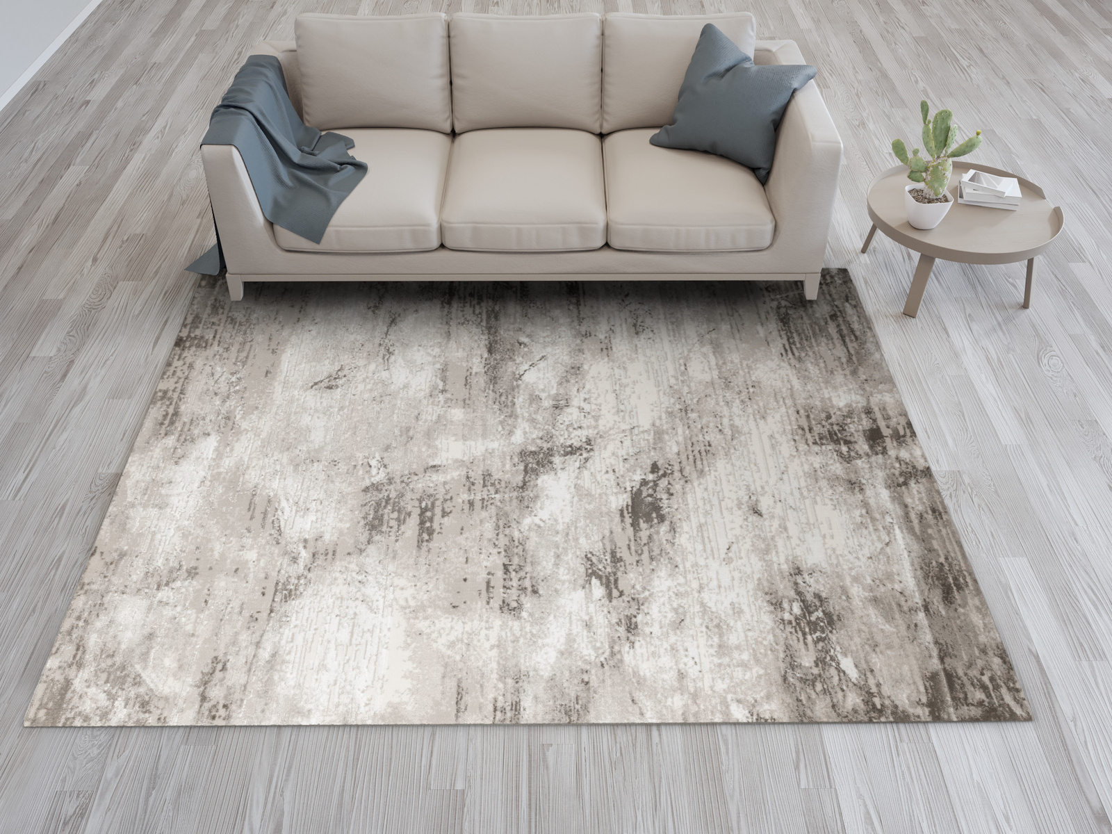 • Luksusowy dywan Nantes o mięciutkim, lekko lśniącym, dwupoziomowym runie z przecieranym wzorem imitującym taflę marmuru, w odcieniach szarości zmieszanej z beżem z akcentami kremu, ze spodem wykończonym bawełną.