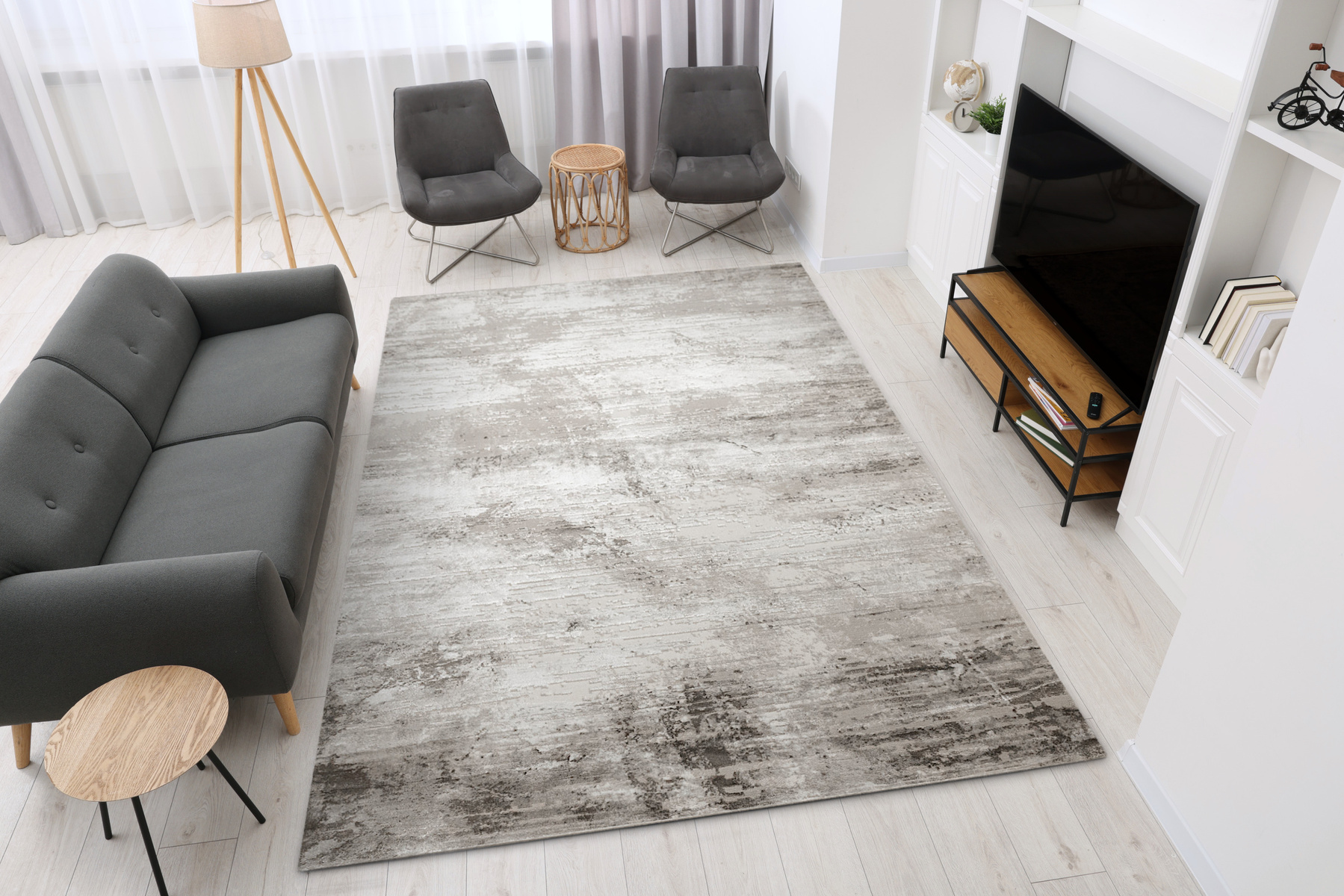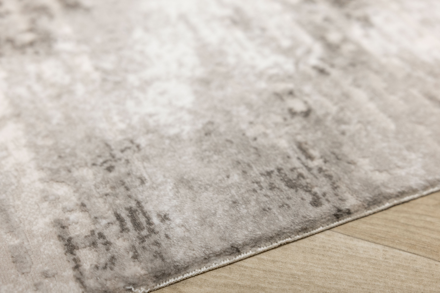 • Luksusowy dywan Nantes o mięciutkim, lekko lśniącym, dwupoziomowym runie z przecieranym wzorem imitującym taflę marmuru, w odcieniach szarości zmieszanej z beżem z akcentami kremu, ze spodem wykończonym bawełną.