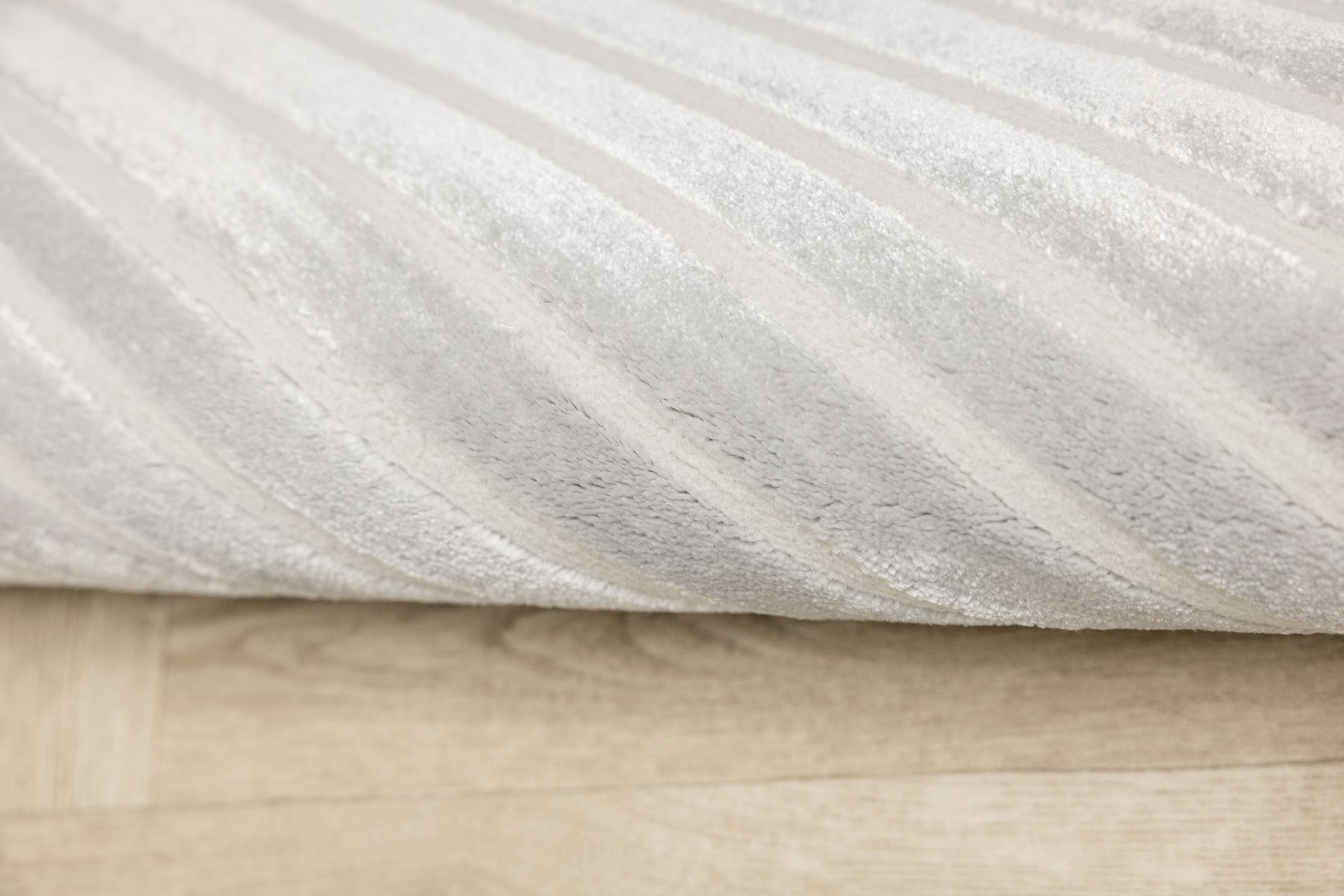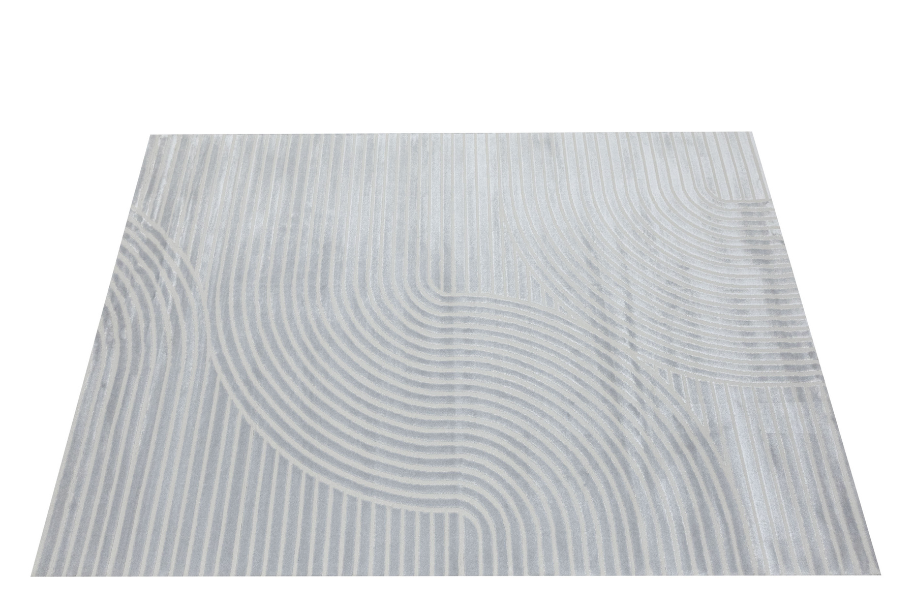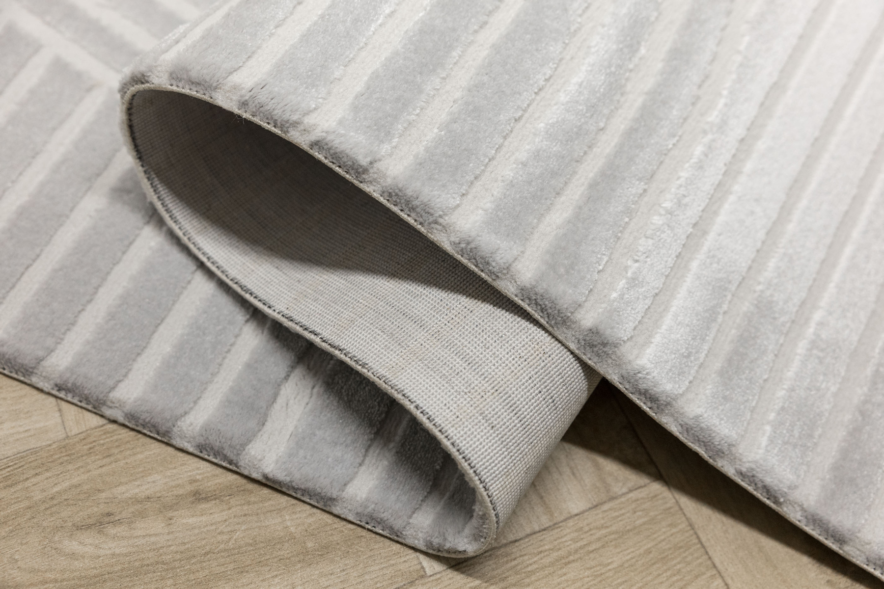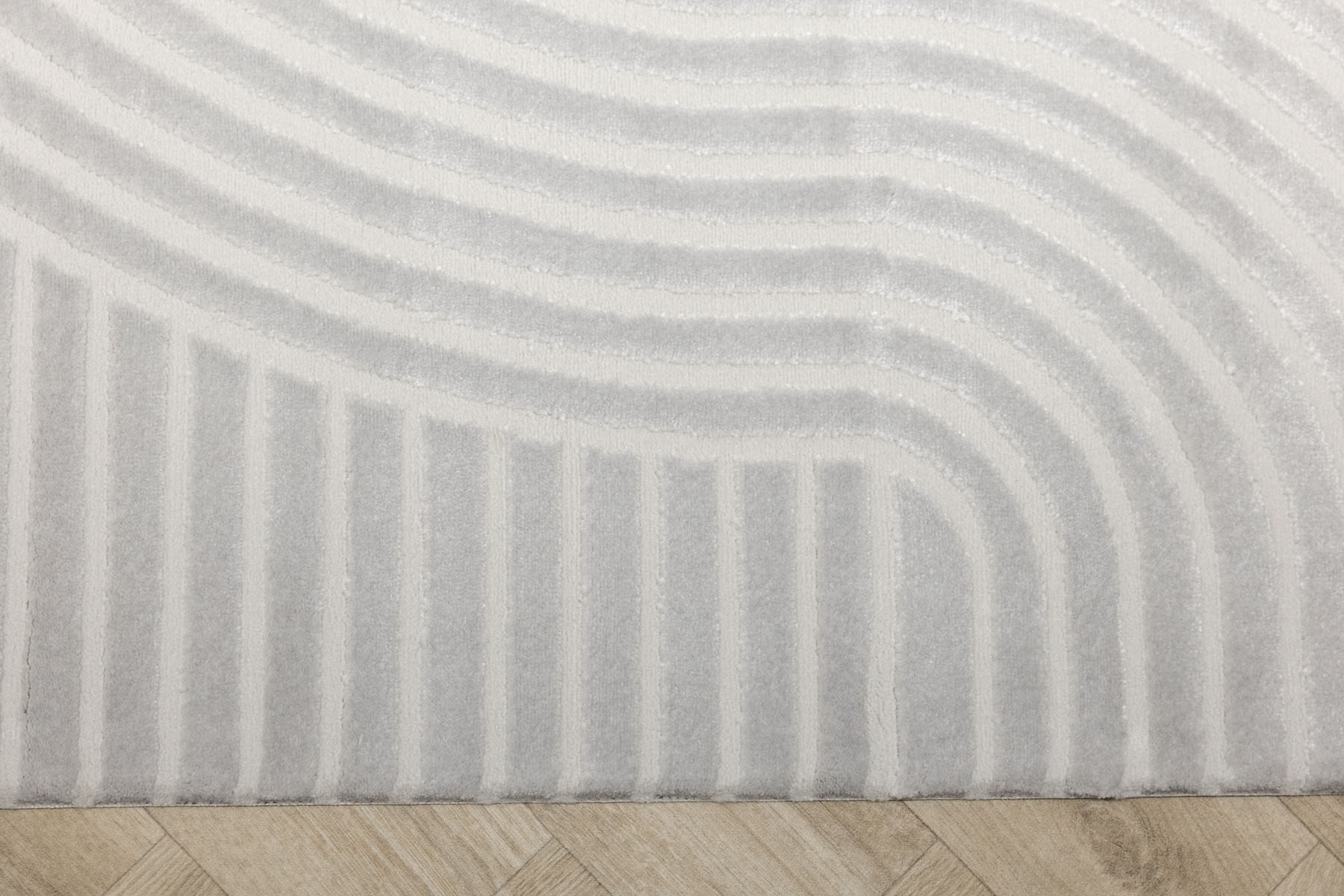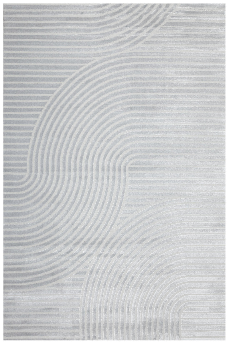 - Luksusowy dywan Nantes o mięciutkim, lekko lśniącym, dwupoziomowym runie z geometrycznym wzorem w linie fale w odcieniach szarości, ze spodem wykończonym bawełną.