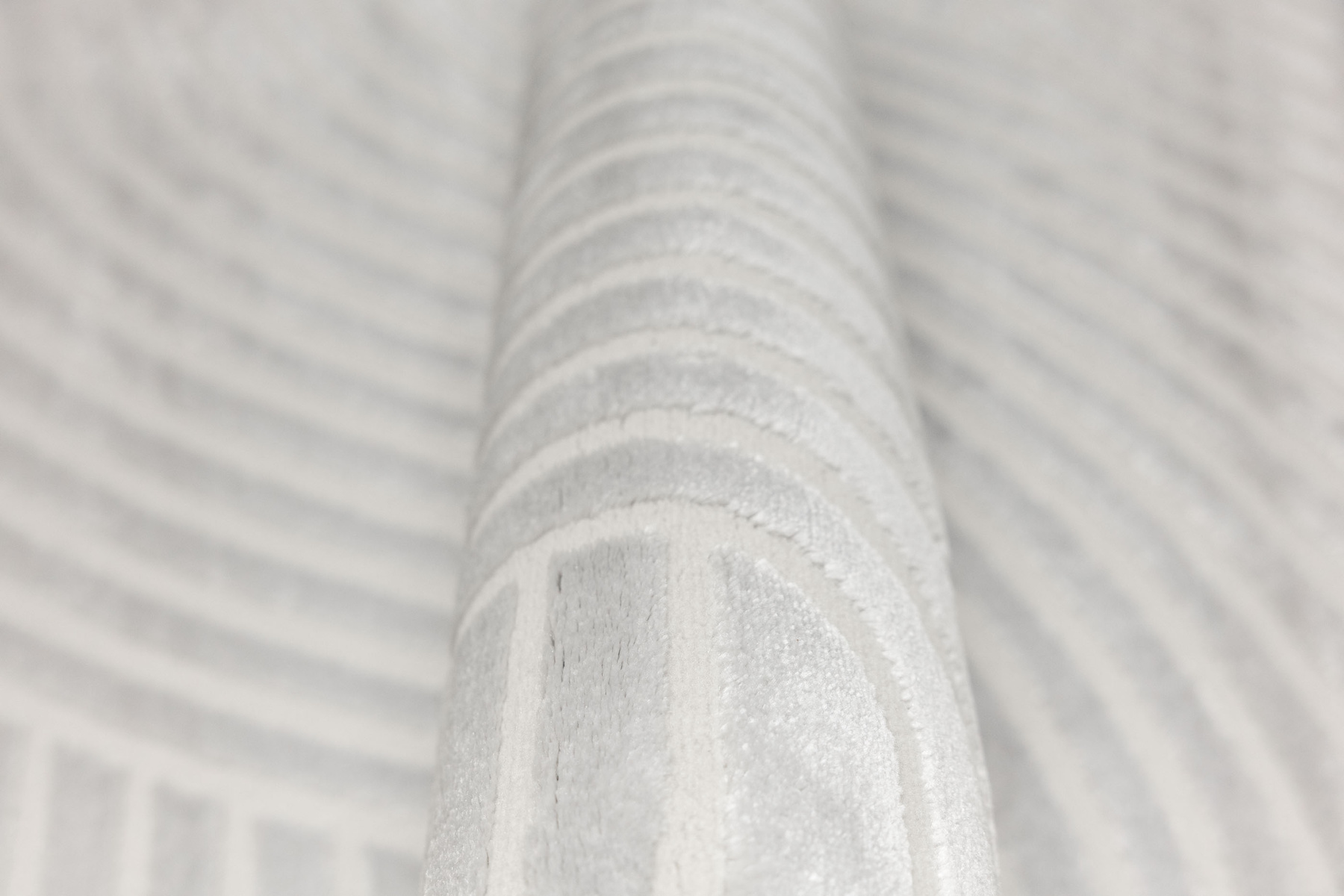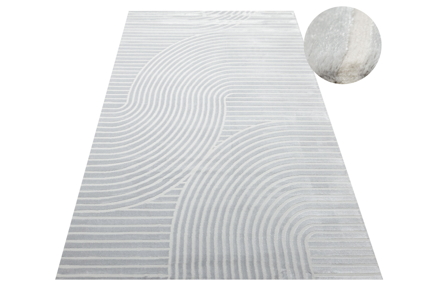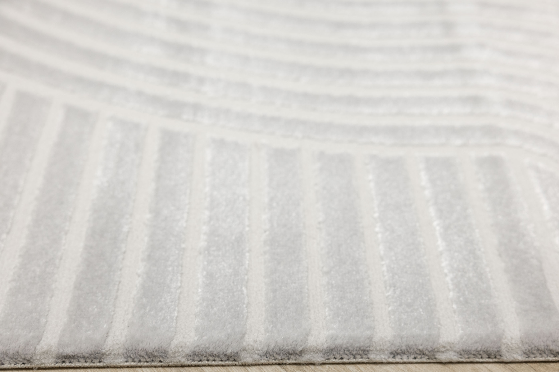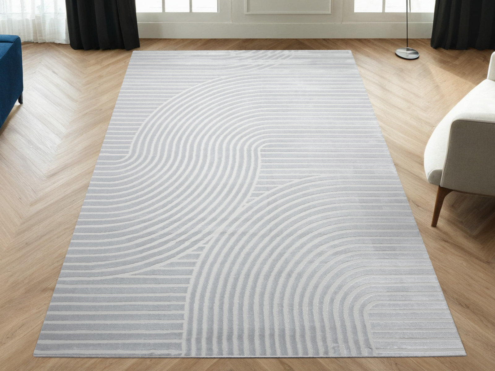 - Luksusowy dywan Nantes o mięciutkim, lekko lśniącym, dwupoziomowym runie z geometrycznym wzorem w linie fale w odcieniach szarości, ze spodem wykończonym bawełną.
