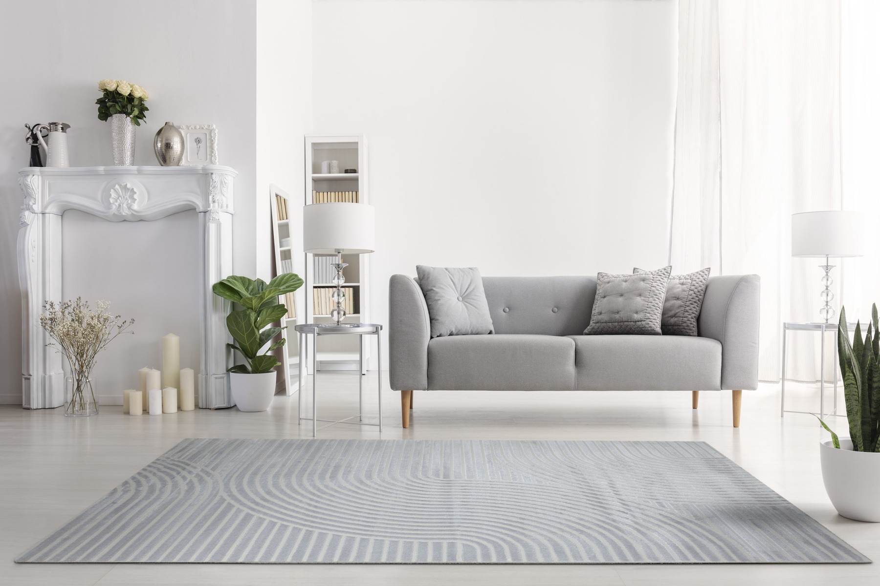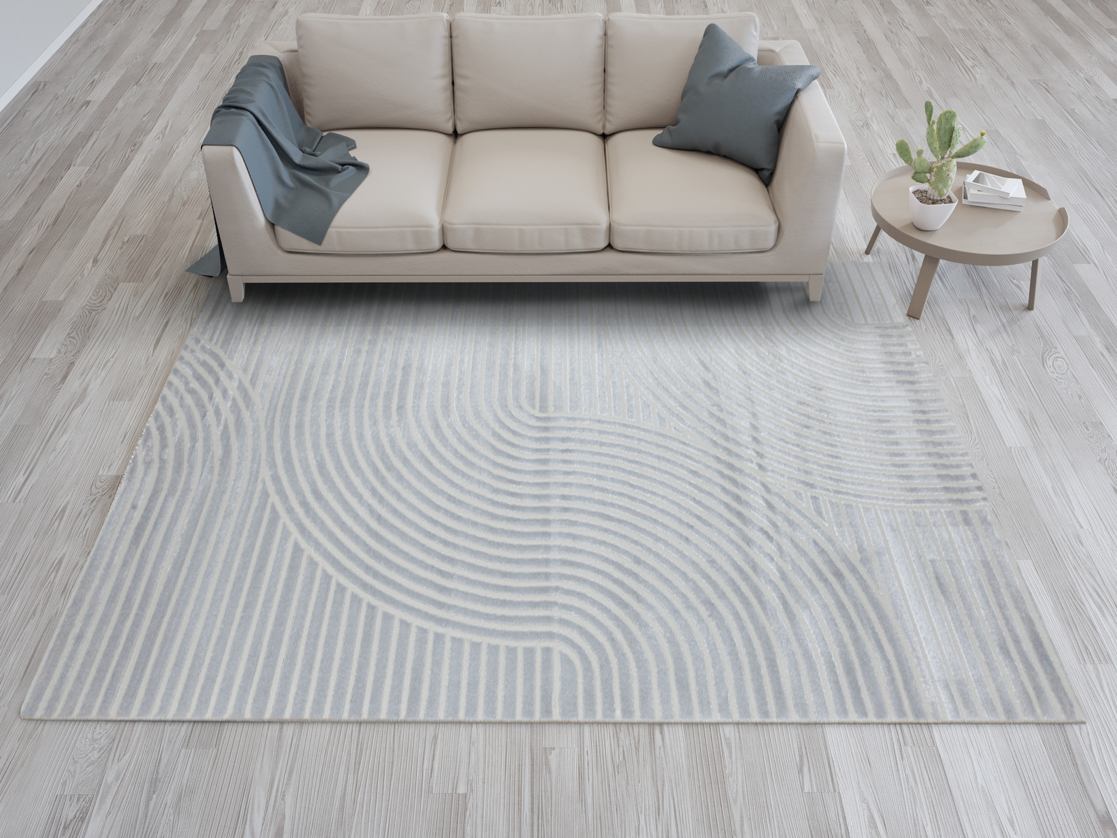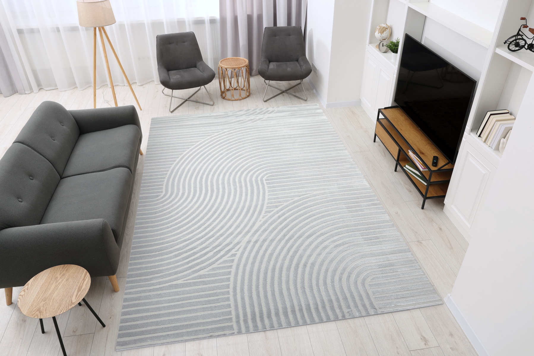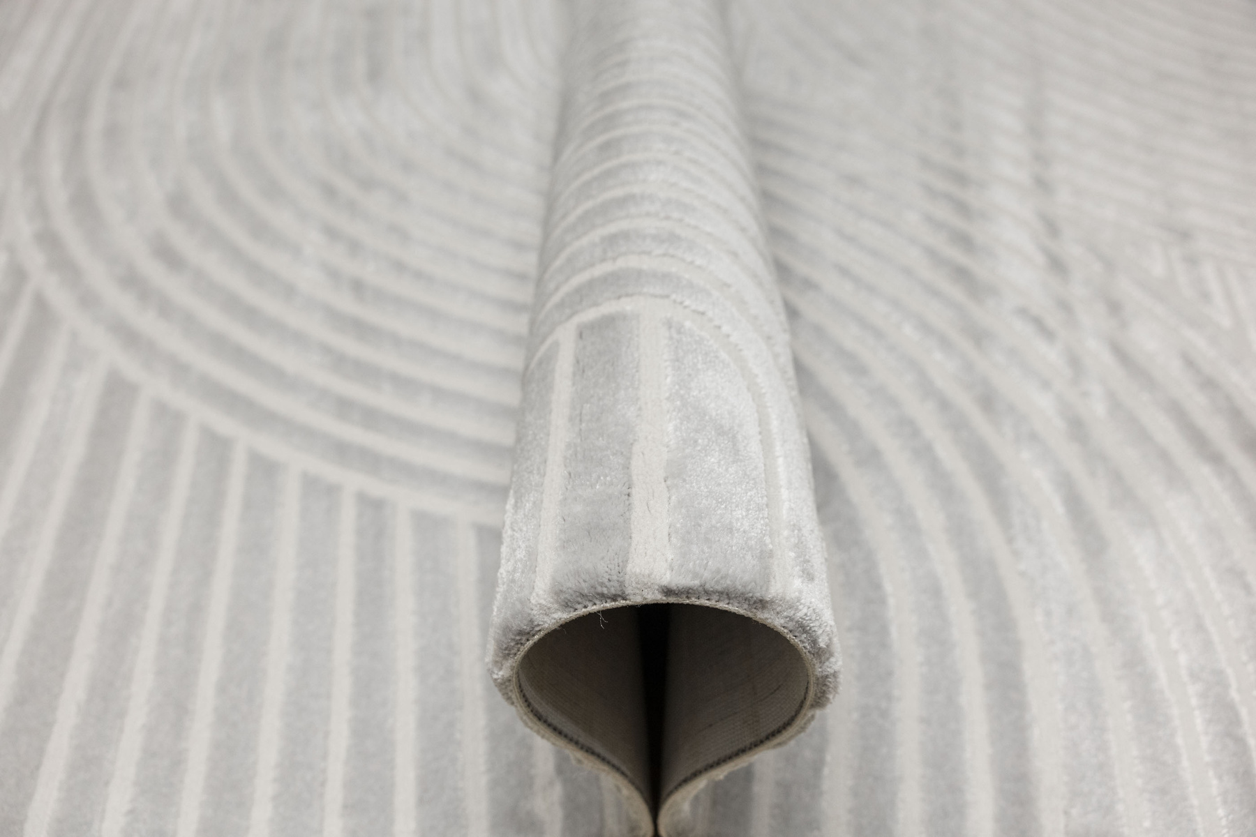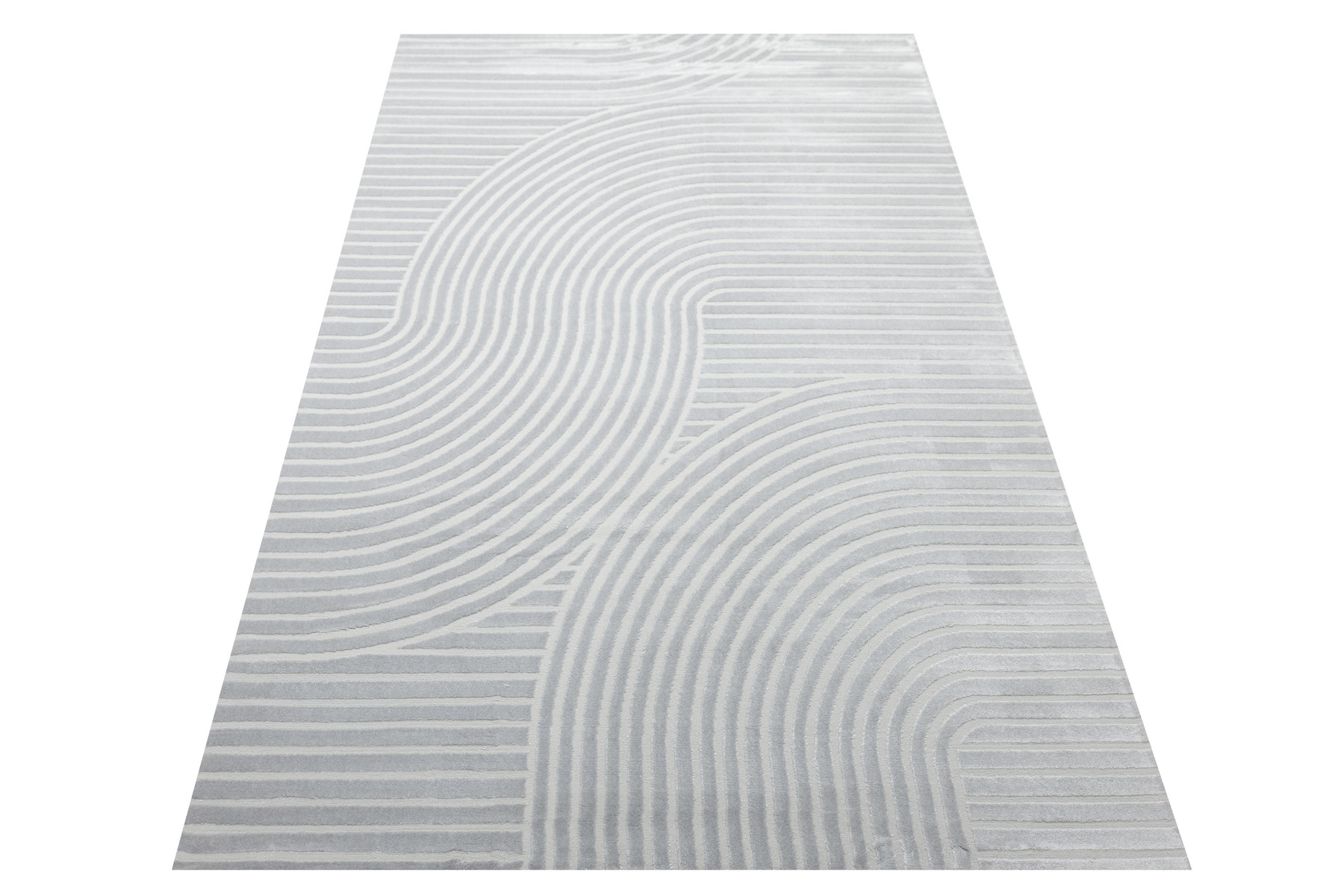 - Luksusowy dywan Nantes o mięciutkim, lekko lśniącym, dwupoziomowym runie z geometrycznym wzorem w linie fale w odcieniach szarości, ze spodem wykończonym bawełną.