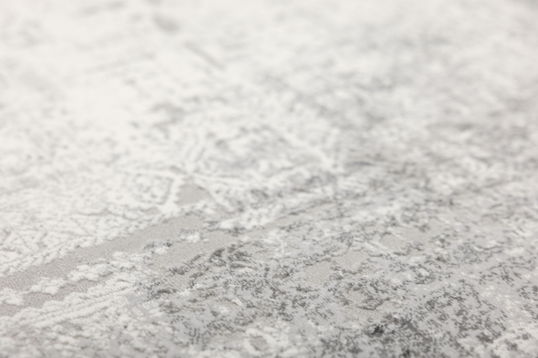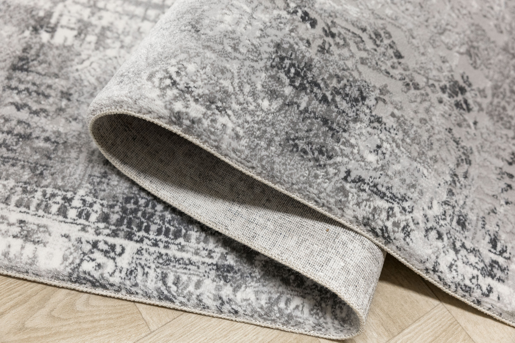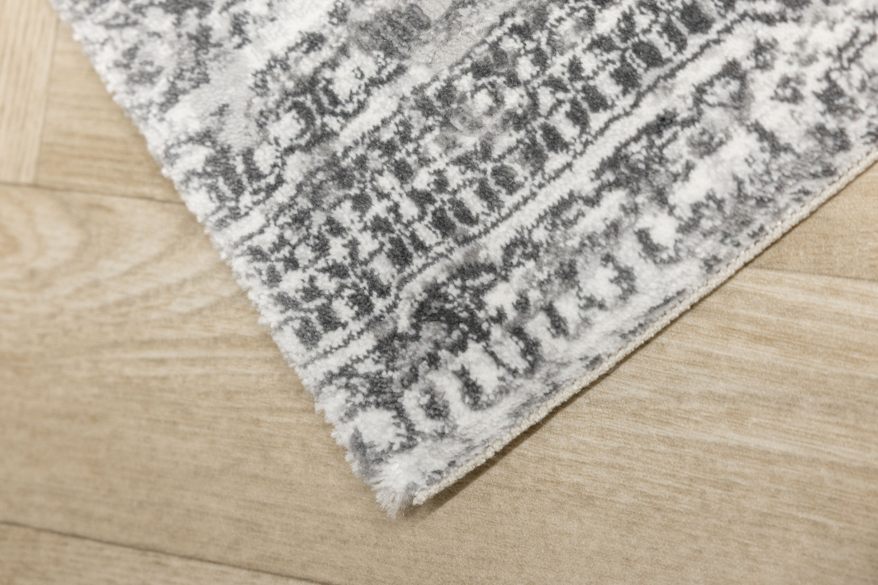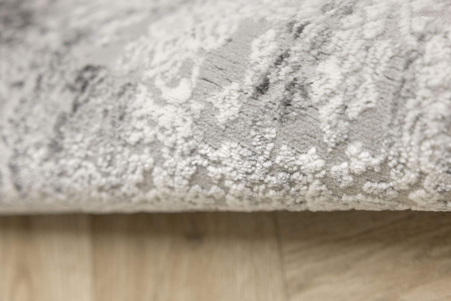 • Luksusowy dywan Nantes o mięciutkim, lekko lśniącym, dwupoziomowym runie ze złożonym wzorem ornamentowym, w odcieniach szarości z akcentami kremu, ze spodem wykończonym bawełną.