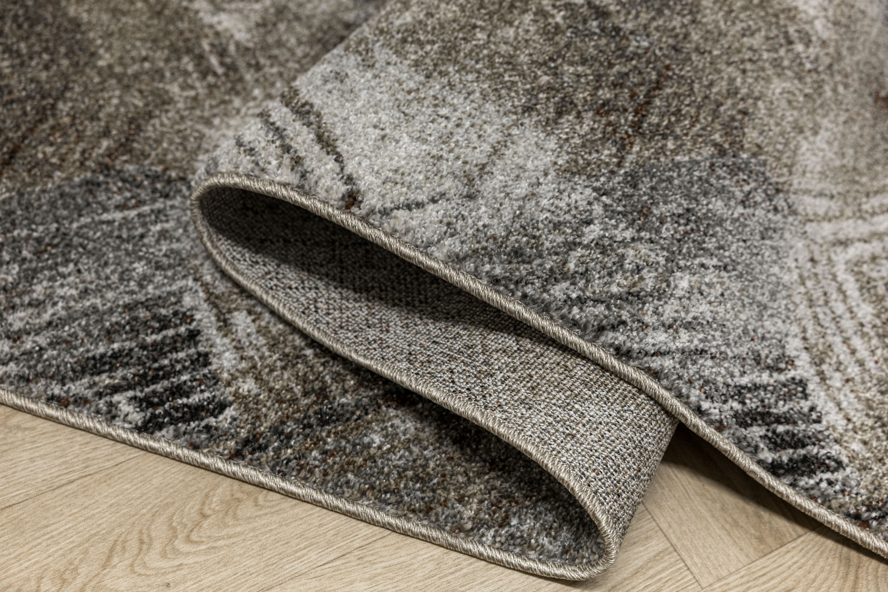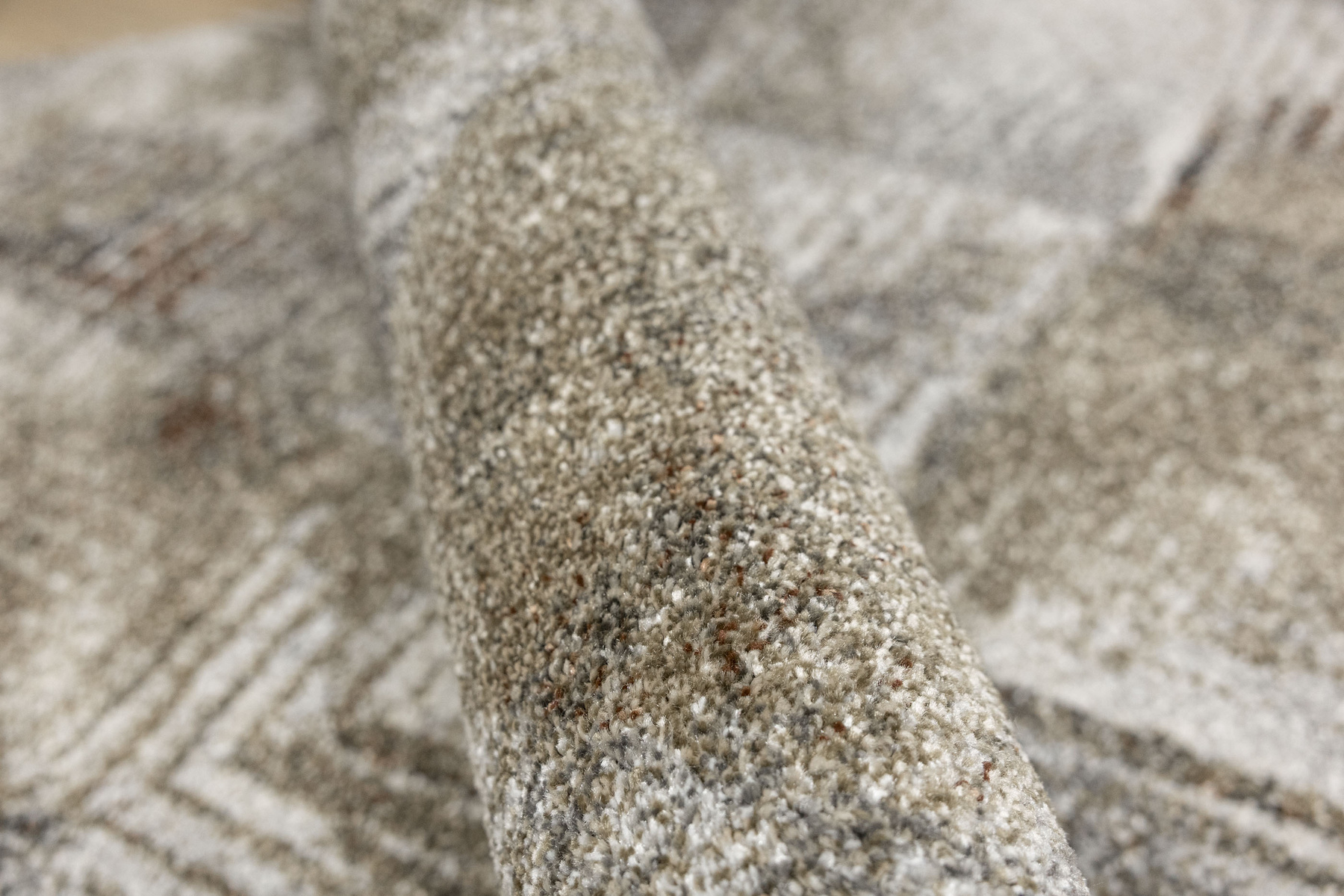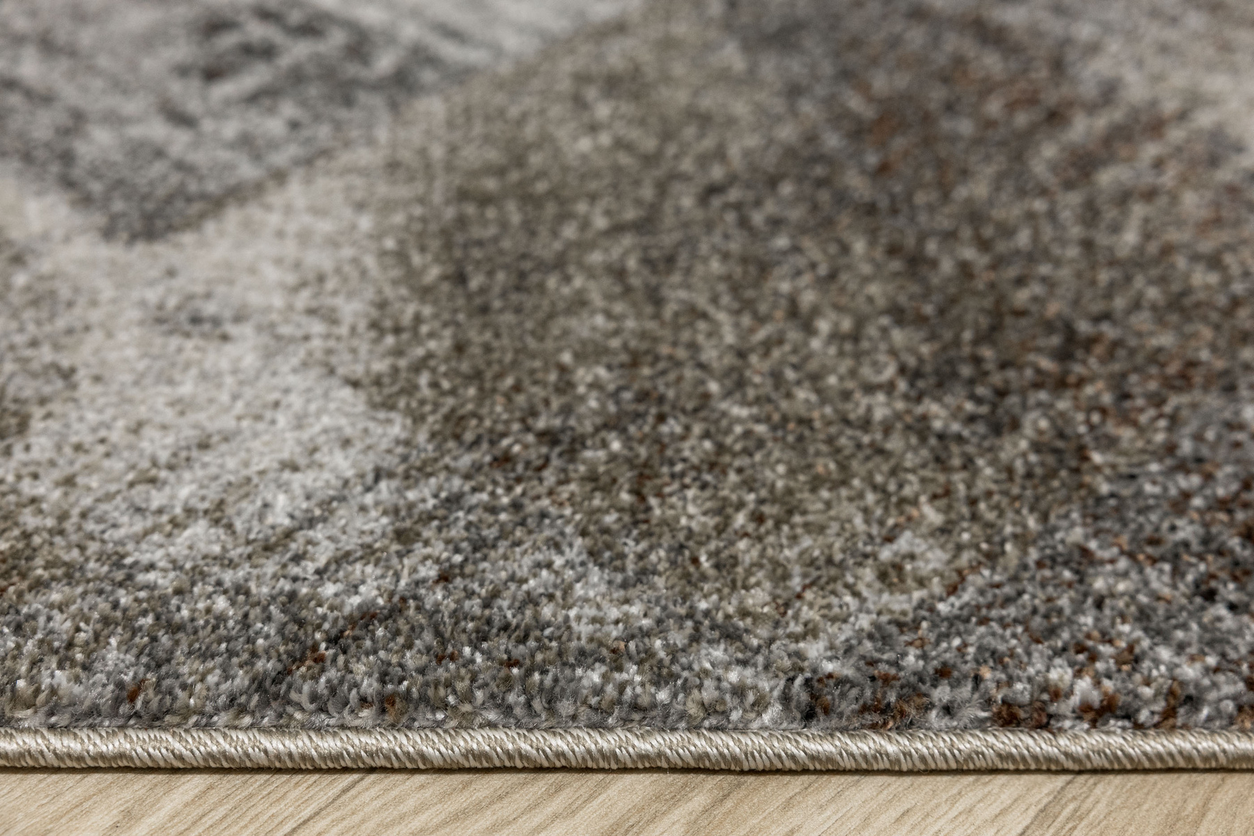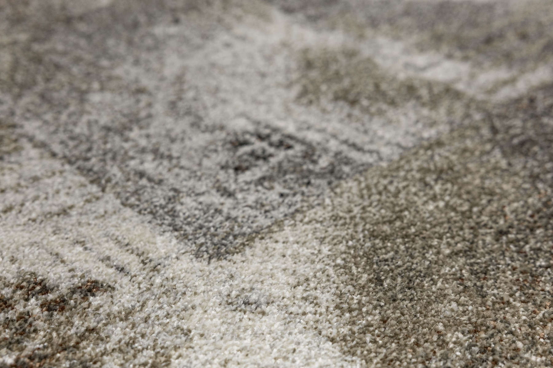 - Miękki i przyjemny w dotyku dywan Ponte o runie ozdobionym geometrycznym przecieranym wzorem w romby szarościach z akcentami kremu, srebrnego, beżu, brązu i czerni. Spód wykończony jutą.