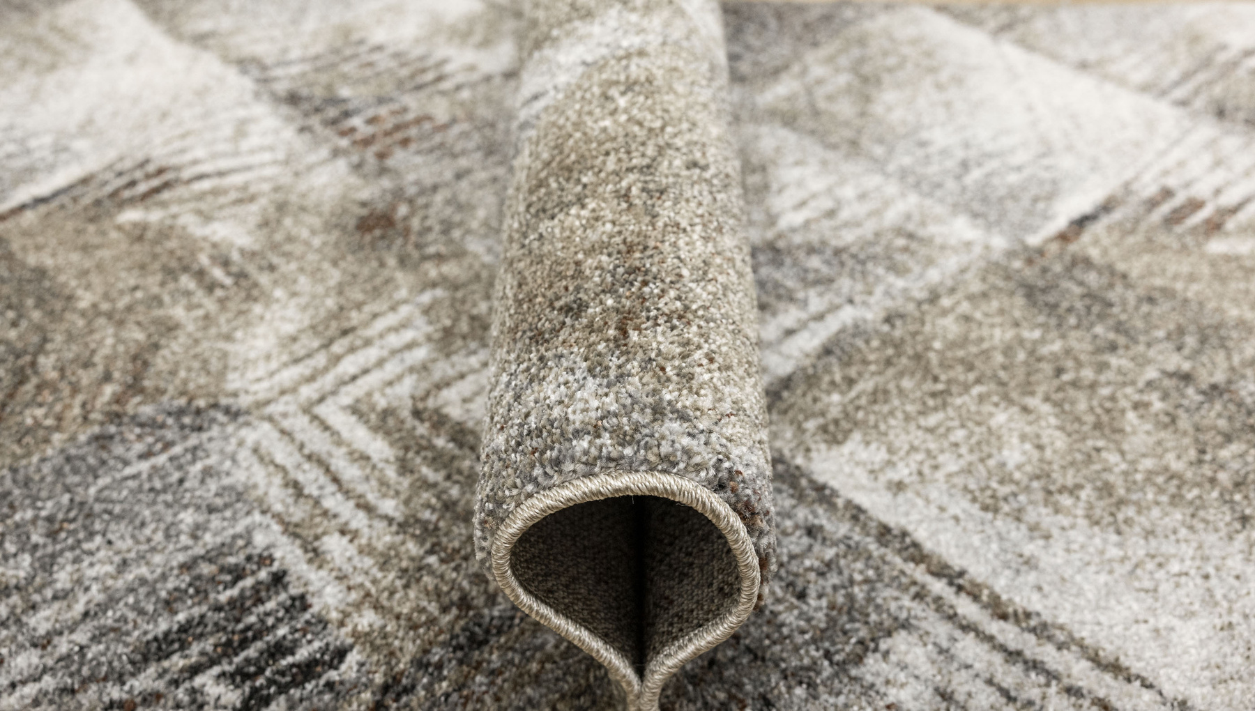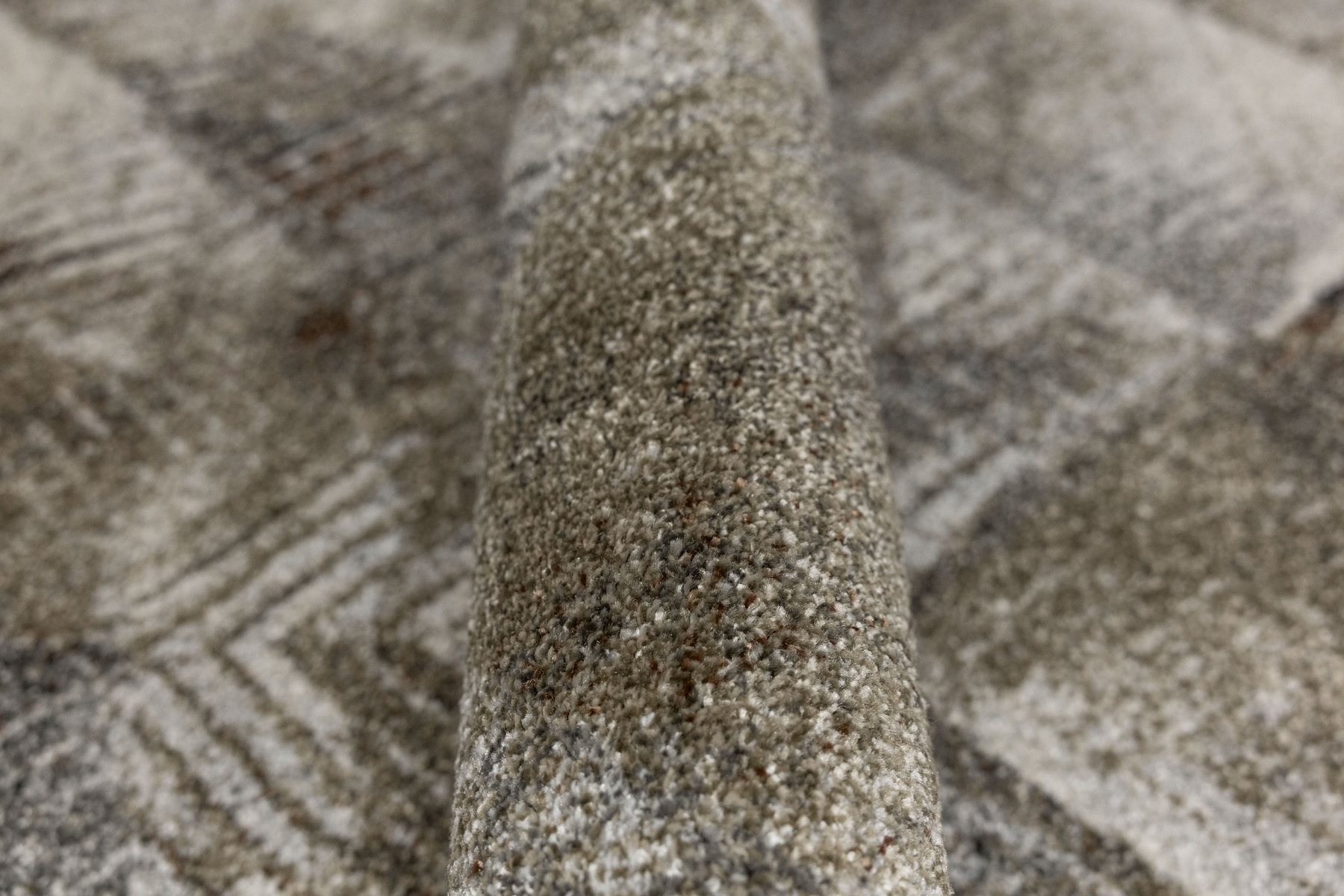 - Miękki i przyjemny w dotyku dywan Ponte o runie ozdobionym geometrycznym przecieranym wzorem w romby szarościach z akcentami kremu, srebrnego, beżu, brązu i czerni. Spód wykończony jutą.