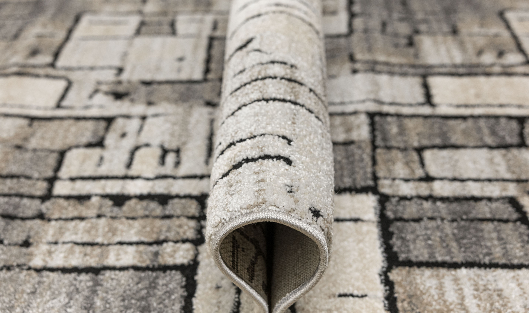 - Miękki i przyjemny w dotyku dywan Matara o dwupoziomowym runie ozdobionym naturalnym wzorem w szarościach, kremie, beżu z dodatkiem czerni. Spód wykończony jutą.