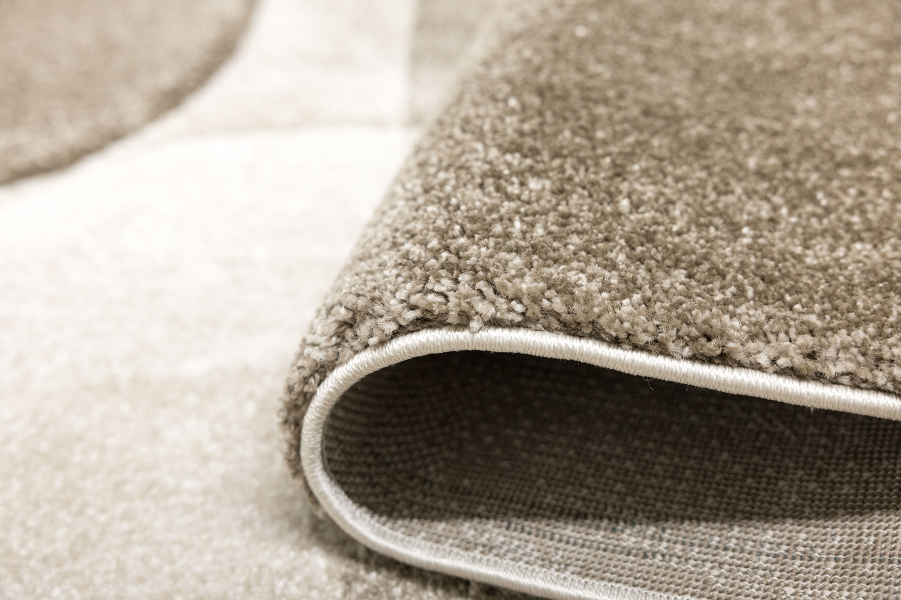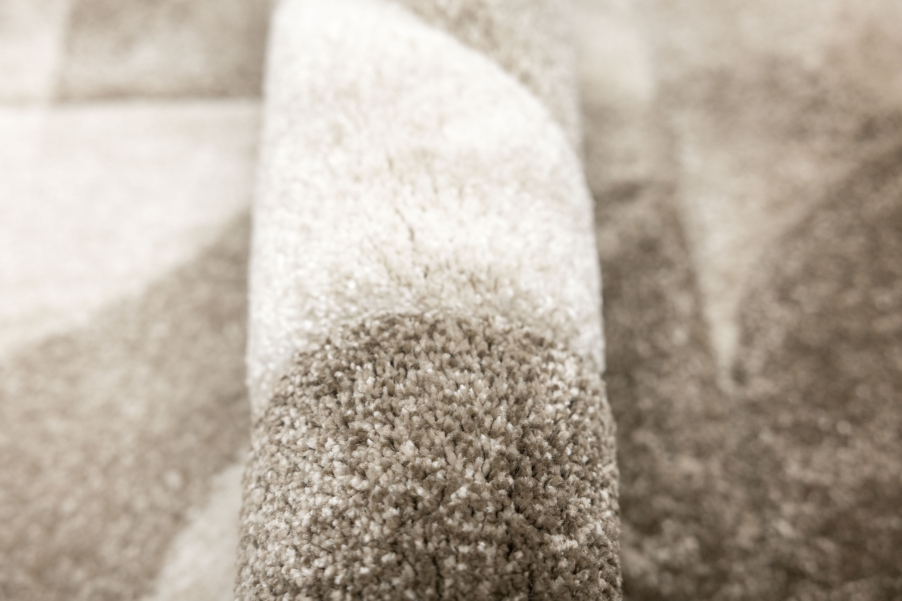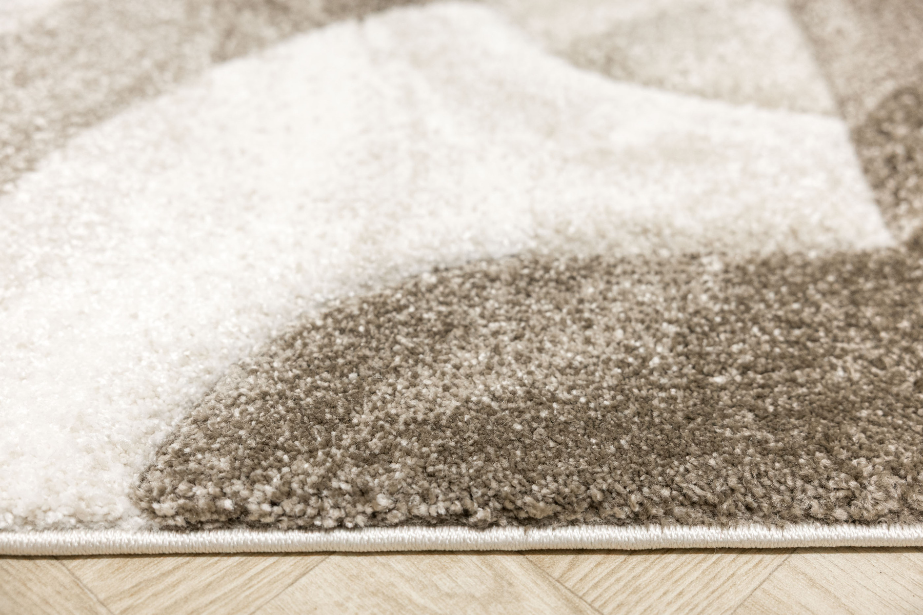 - Miękki i przyjemny w dotyku chodnik dywanowy Kandy o grubym, wycinanym runie ozdobionym nowoczesnym, abstrakcyjnym wzorem geometrycznym w odcieniach brązu, beżu i kremu oraz spodem wykończonym jutą.