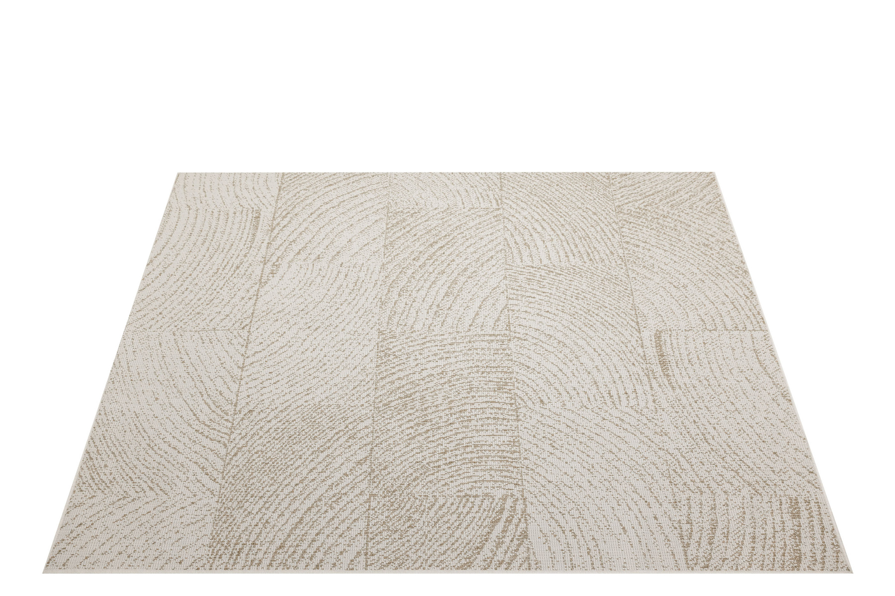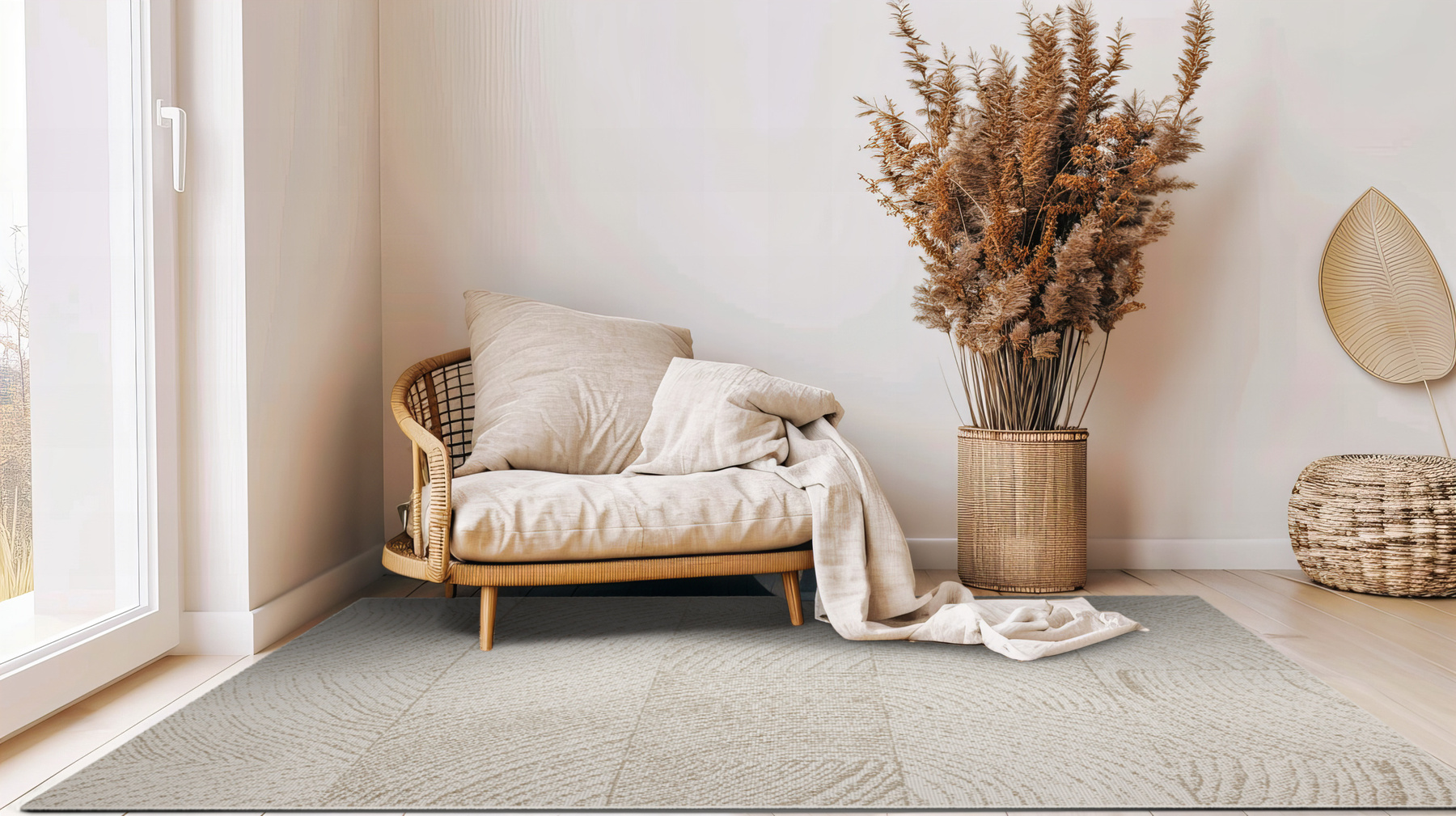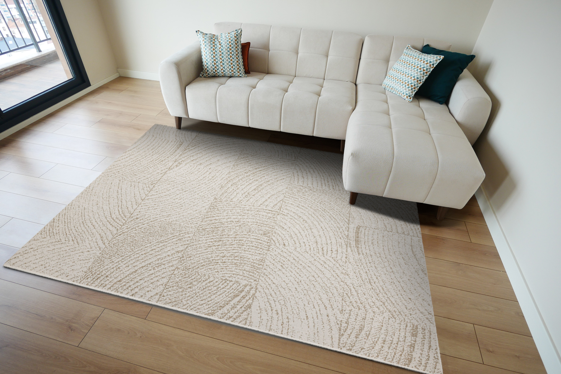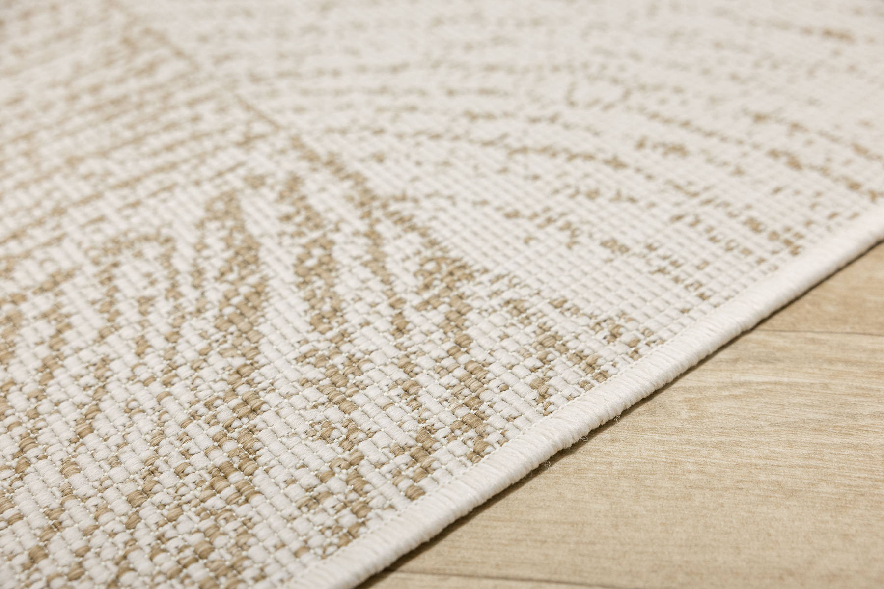 - Dwustronny, sznurkowy dywan Brussels belgijskiej produkcji z naturalnym wzorem z motywem drewna, w jasnych odcieniach kremu i beżu, który może być stosowany zarówno wewnątrz jak i na zewnątrz.