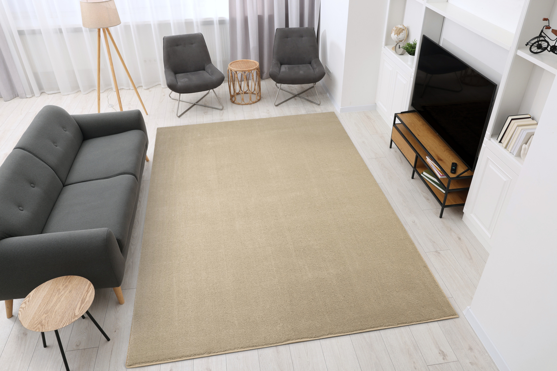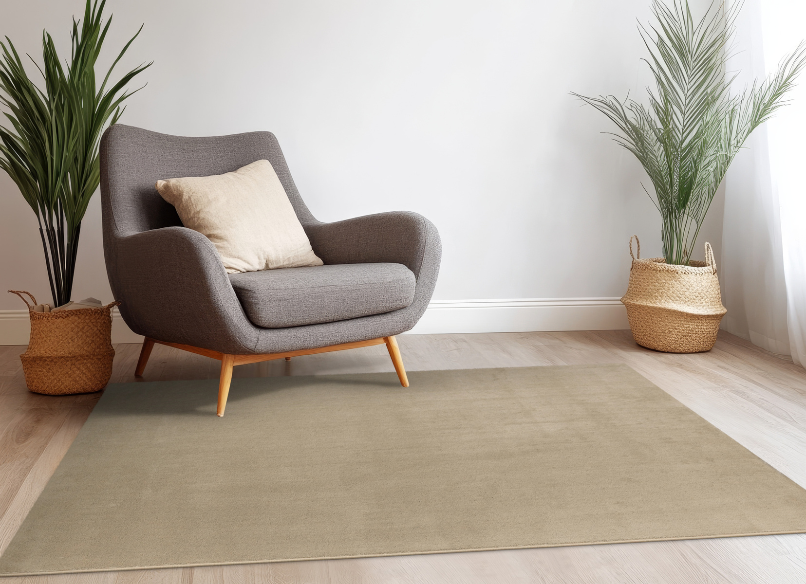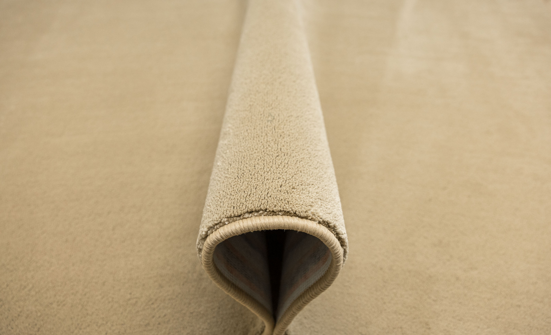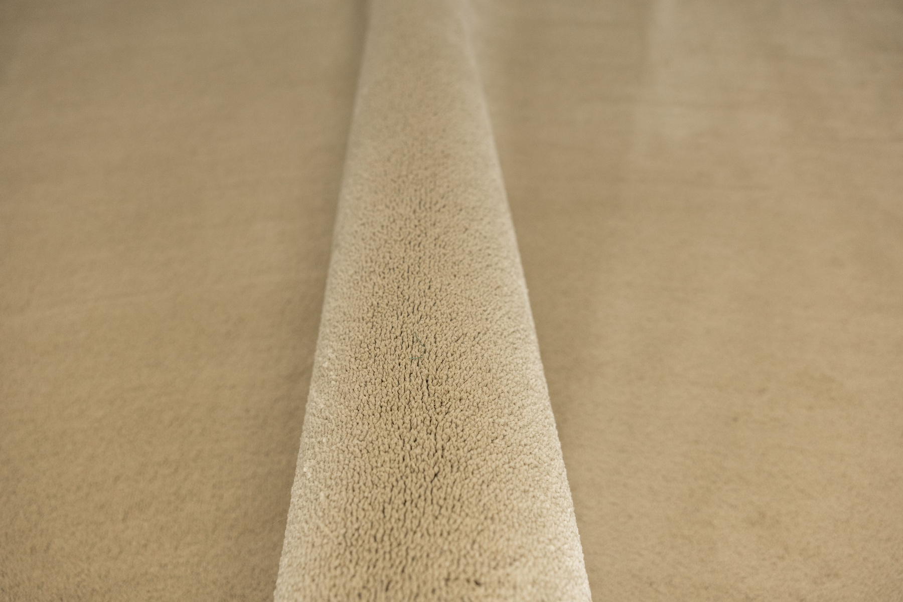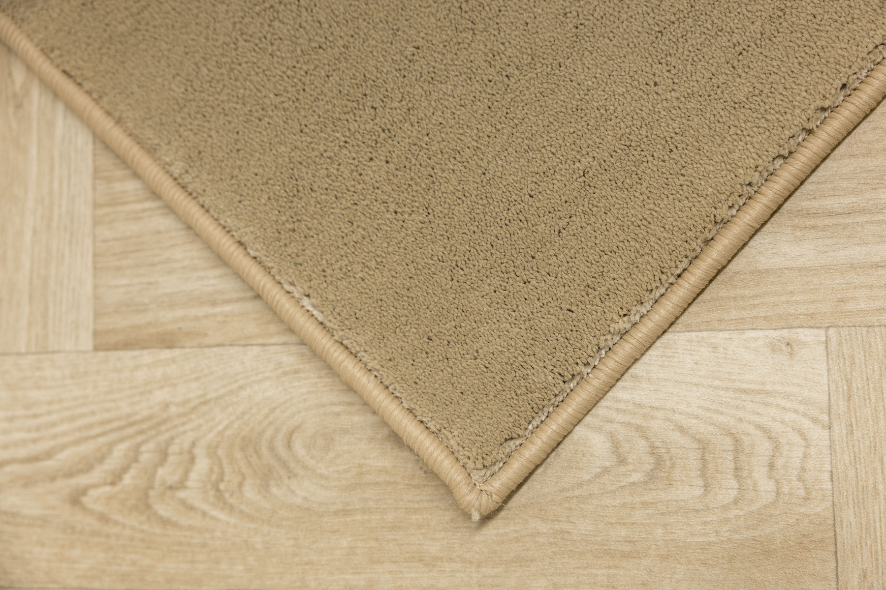 - Nowoczesny dywan z wykładziny Violin z grubym, gęstym runem ciętym typu saxon, w lśniącym odcieniu beżu oraz spodem wykończonym połączeniem filcu i juty o nazwie Fusionback.