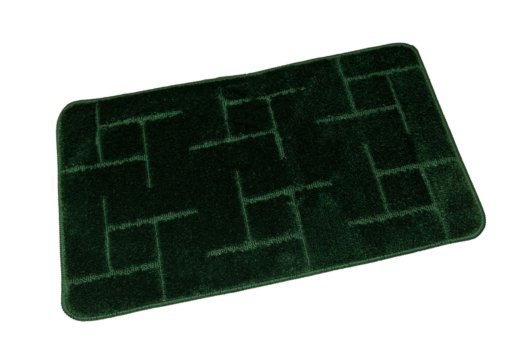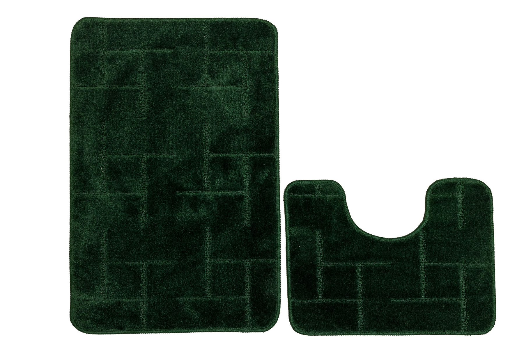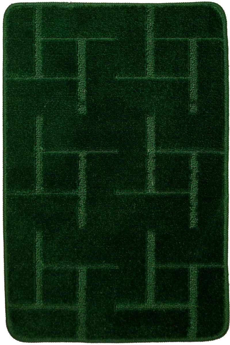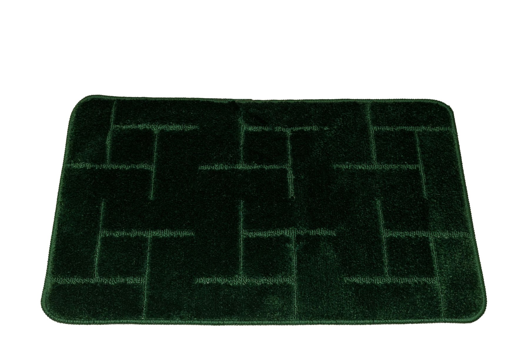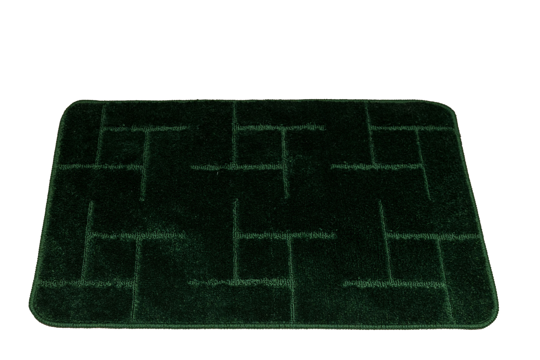- Miękki i przyjemny w dotyku zestaw łazienkowy i przyjemnym w dotyku, dwupoziomowym runie w odcieniu butelkowej zieleni, ze wzorem w kwadraty i antypoślizgowym spodem.