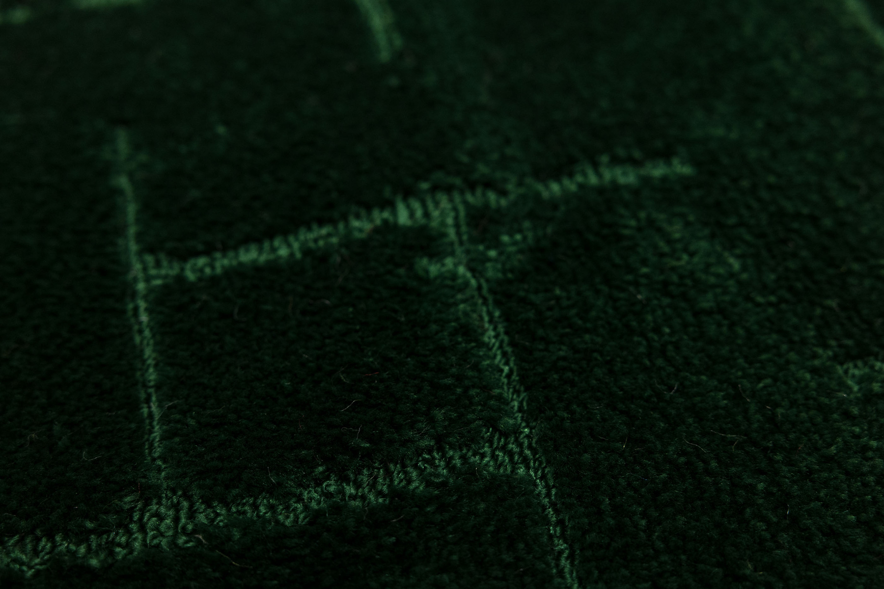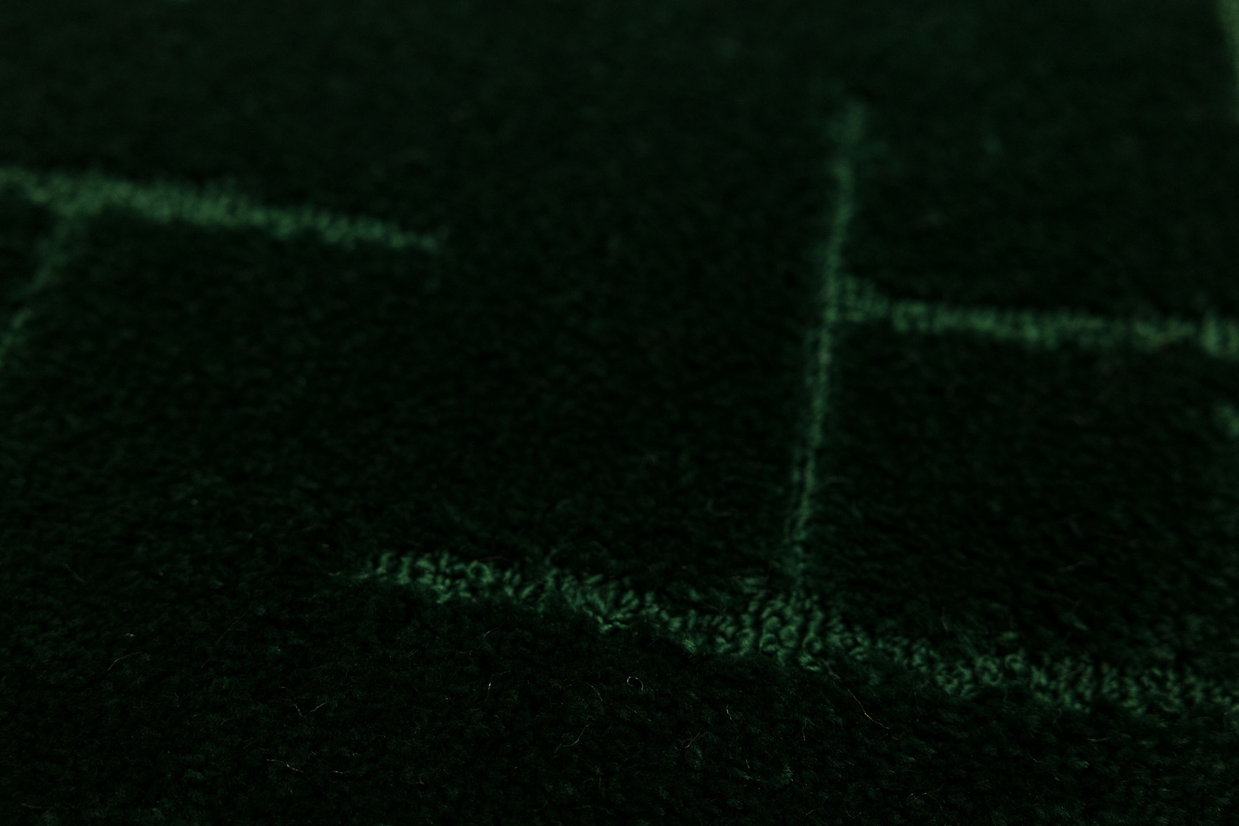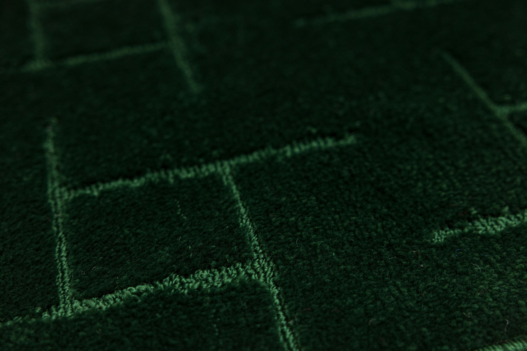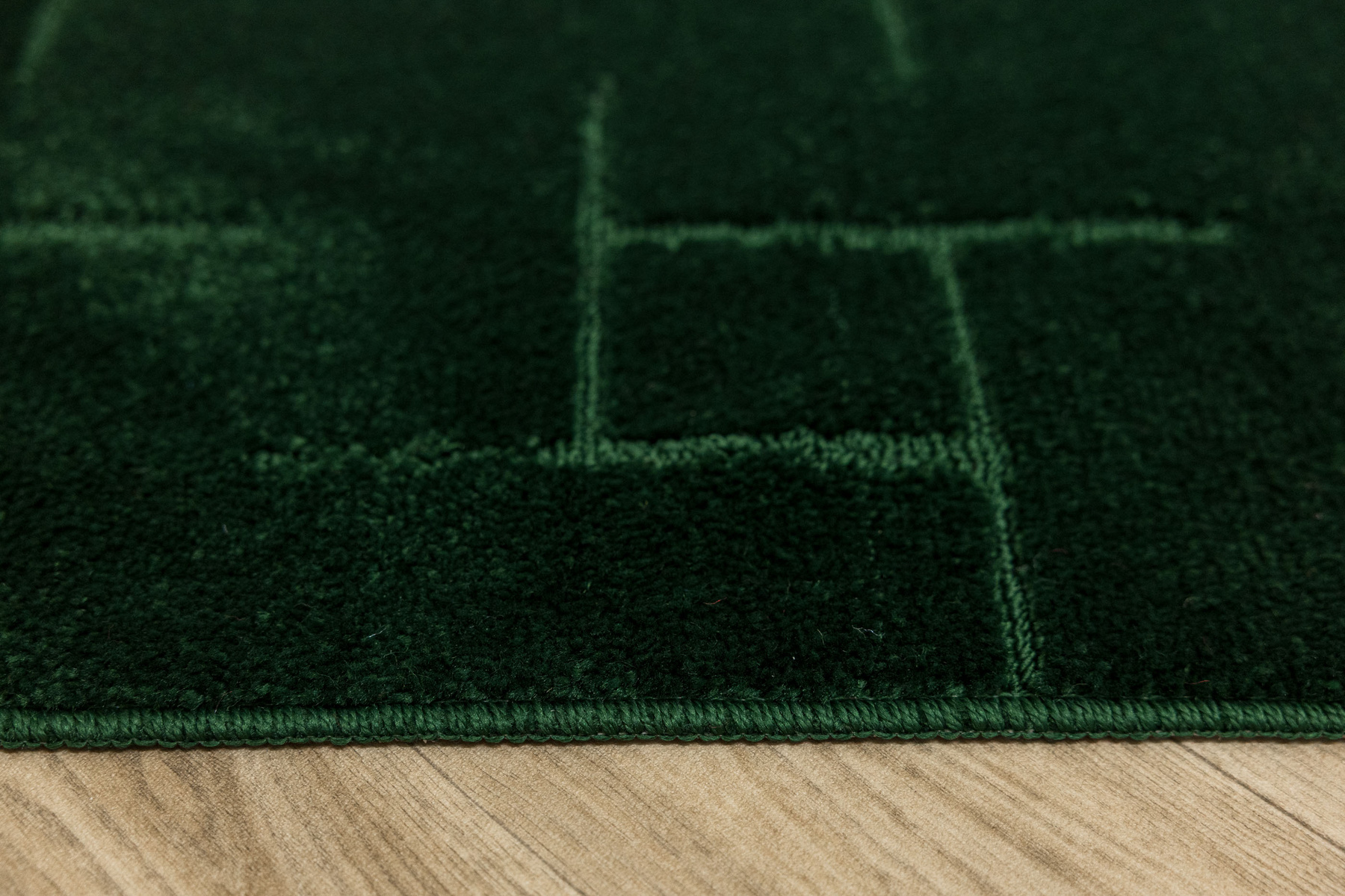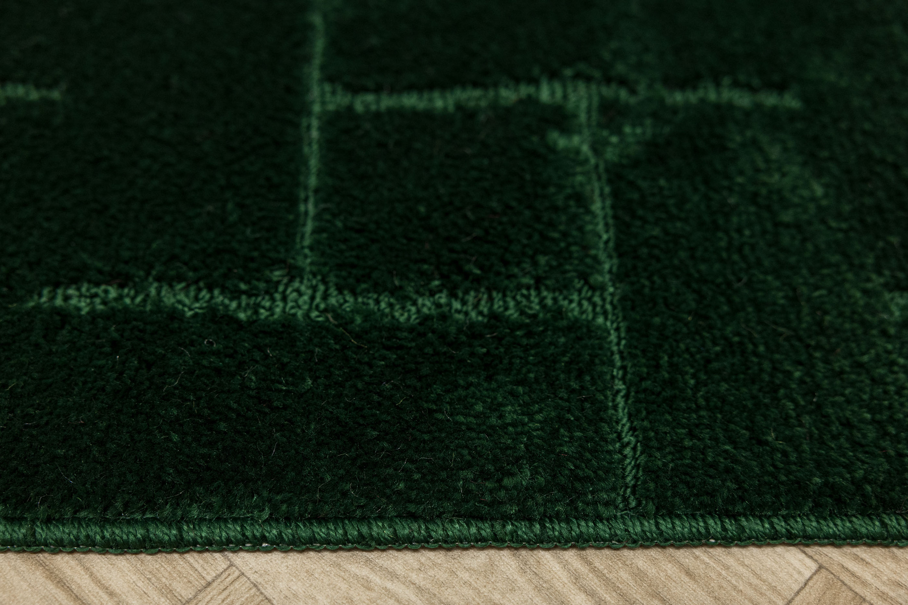 - Miękki i przyjemny w dotyku zestaw łazienkowy i przyjemnym w dotyku, dwupoziomowym runie w odcieniu butelkowej zieleni, ze wzorem w kwadraty i antypoślizgowym spodem.