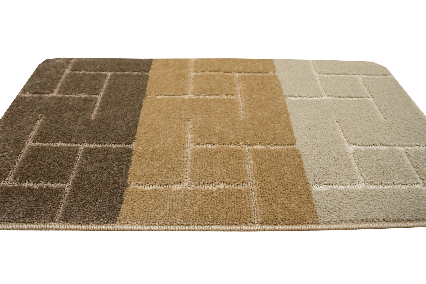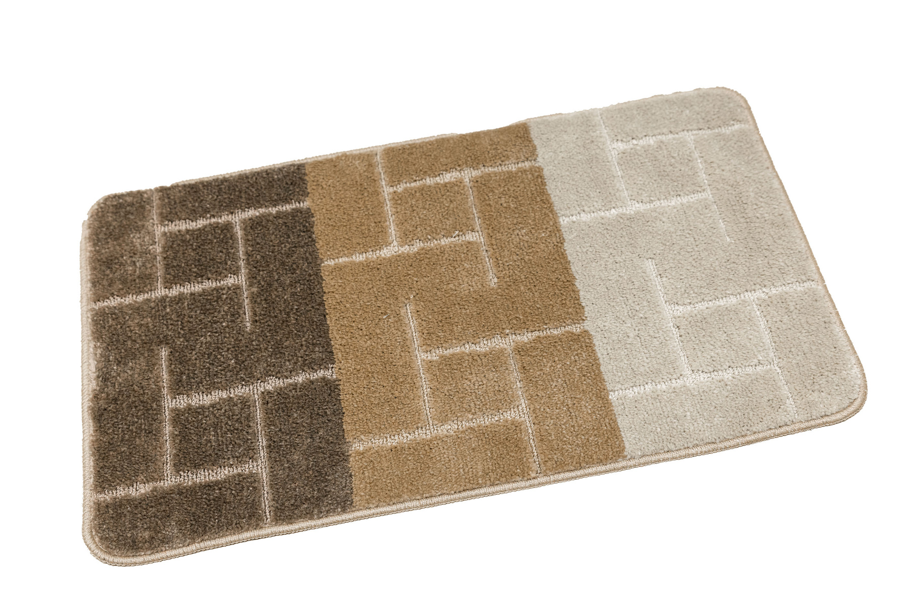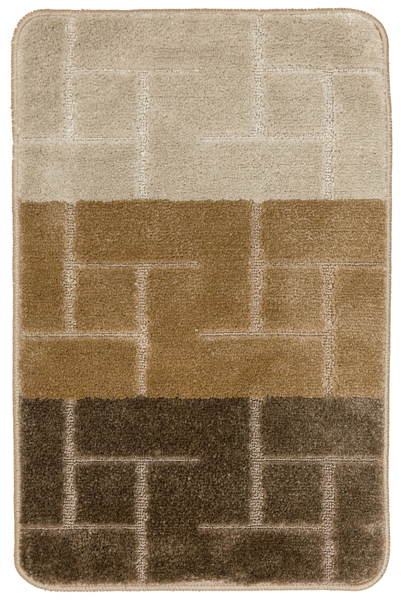 - Miękki i przyjemny w dotyku zestaw łazienkowy Teramo o dwupoziomowym runie w odcieniu beżu i brązu, ze wzorem w kwadraty i antypoślizgowym spodem.