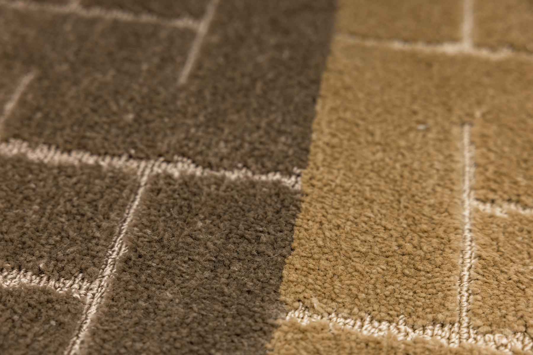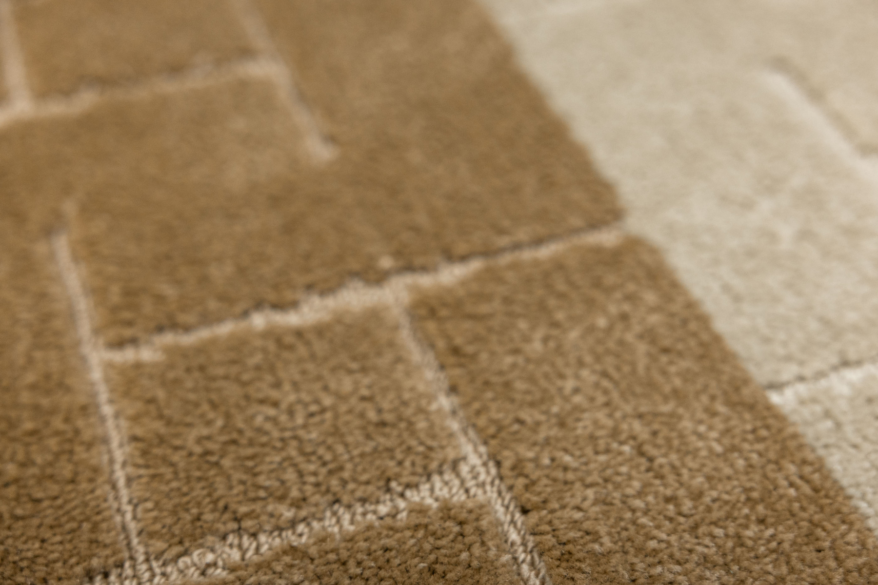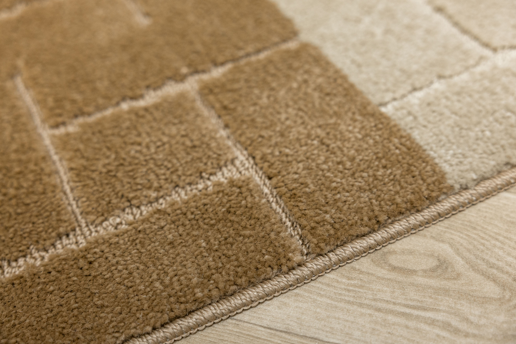 - Miękki i przyjemny w dotyku zestaw łazienkowy Teramo o dwupoziomowym runie w odcieniu beżu i brązu, ze wzorem w kwadraty i antypoślizgowym spodem.