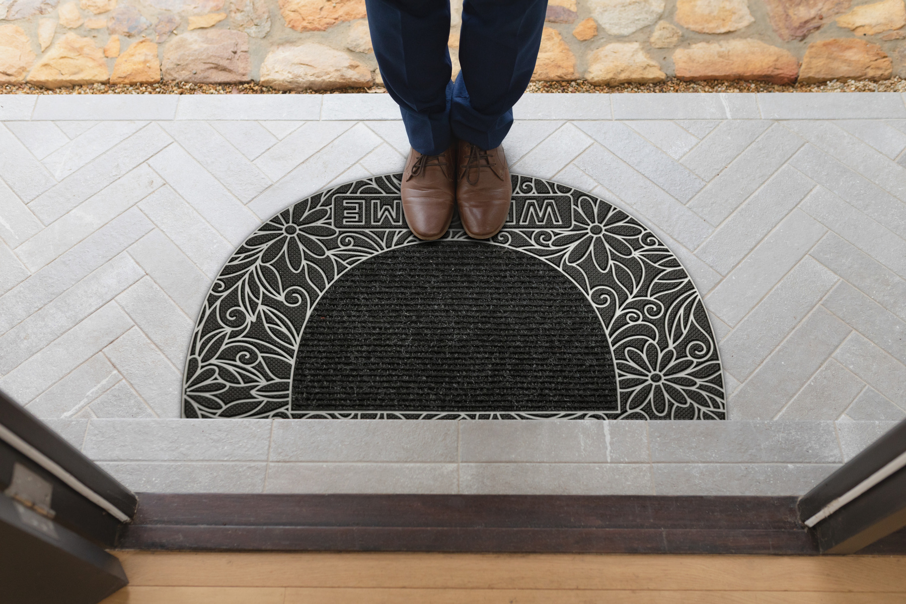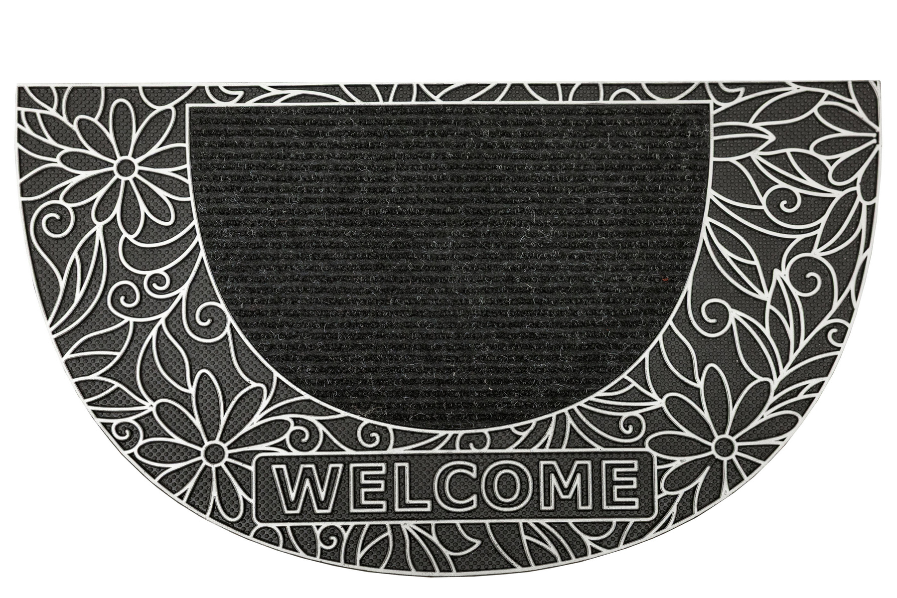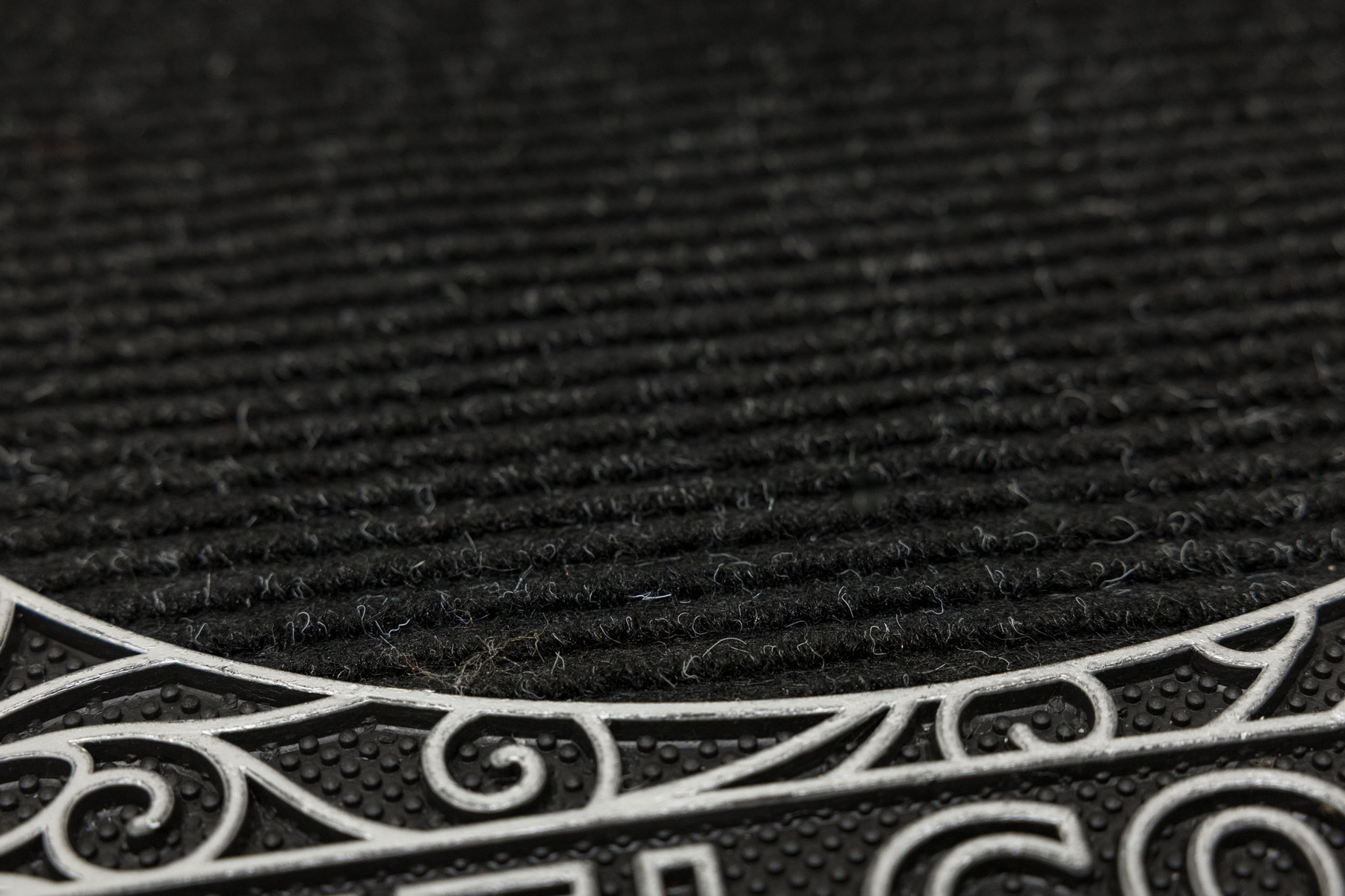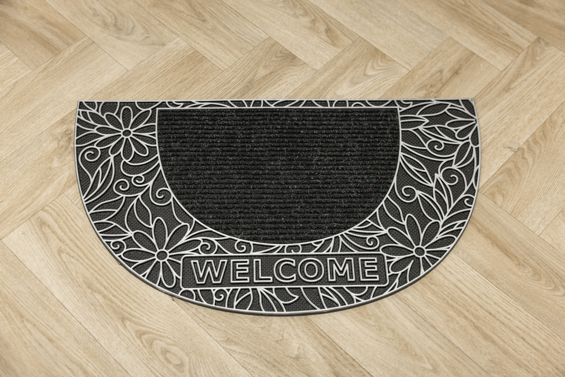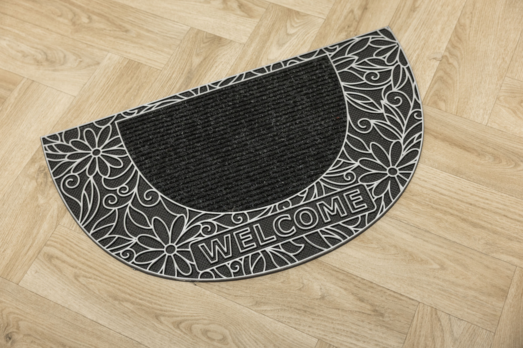 • Antypoślizgowa wycieraczka półokrągła Grey Welcome o uniwersalnym zastosowaniu z tekstylnym żebrowanym panelem w srebrze i czerni.