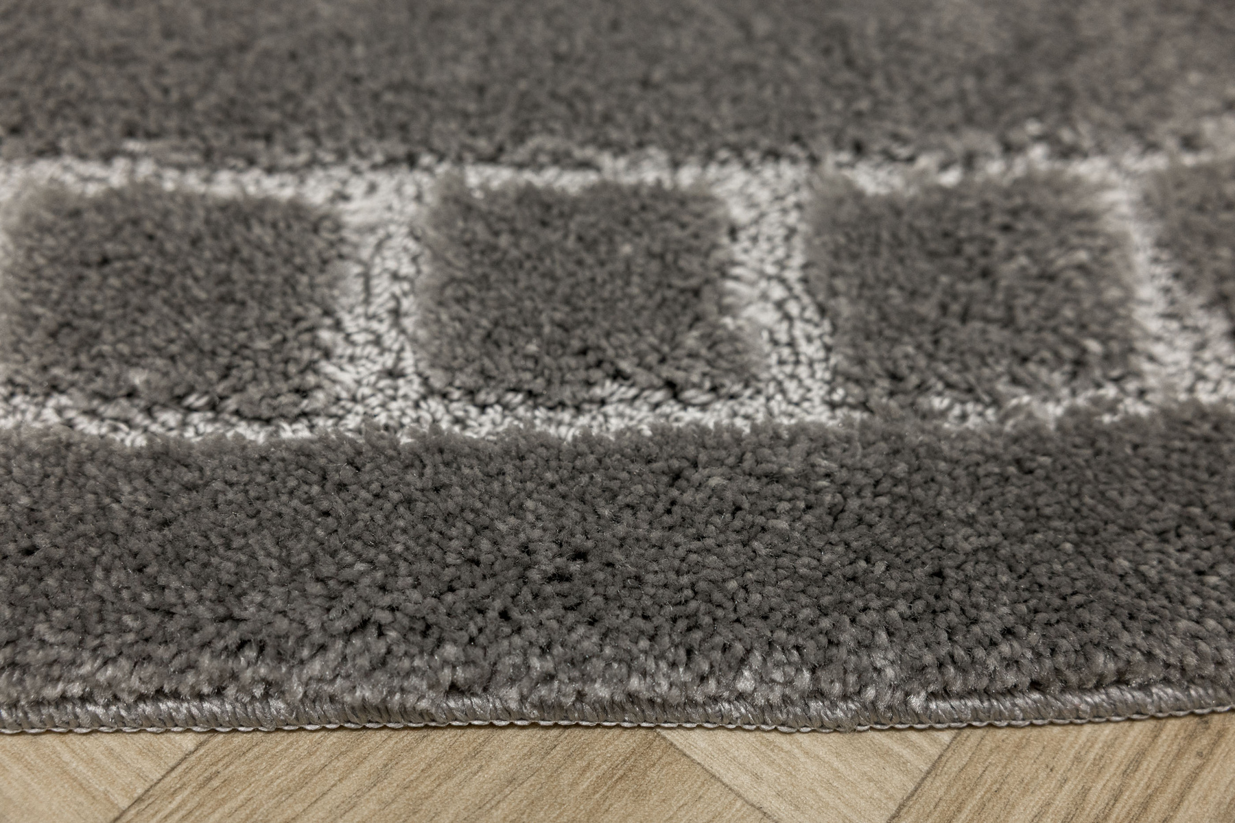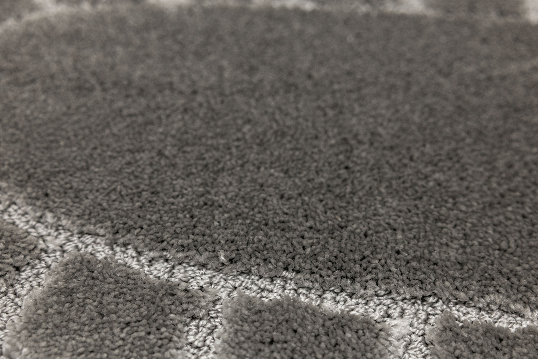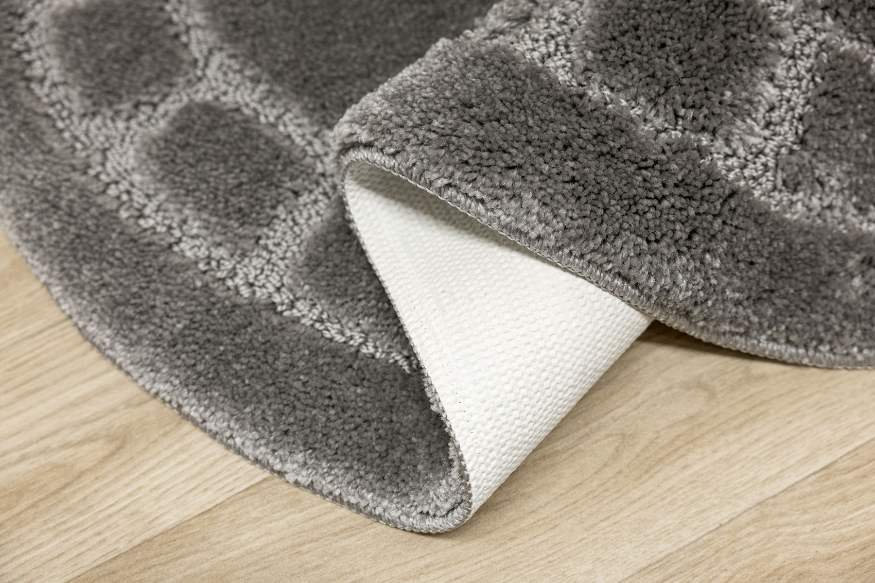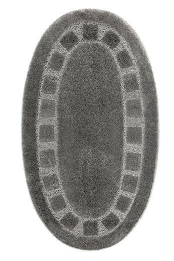 - Dywanik łazienkowy owalny Ocean o miękkim i przyjemnym w dotyku, dwupoziomowym runie w odcieniu szarości, ze wzorem w geometrycznym i antypoślizgowym spodem.