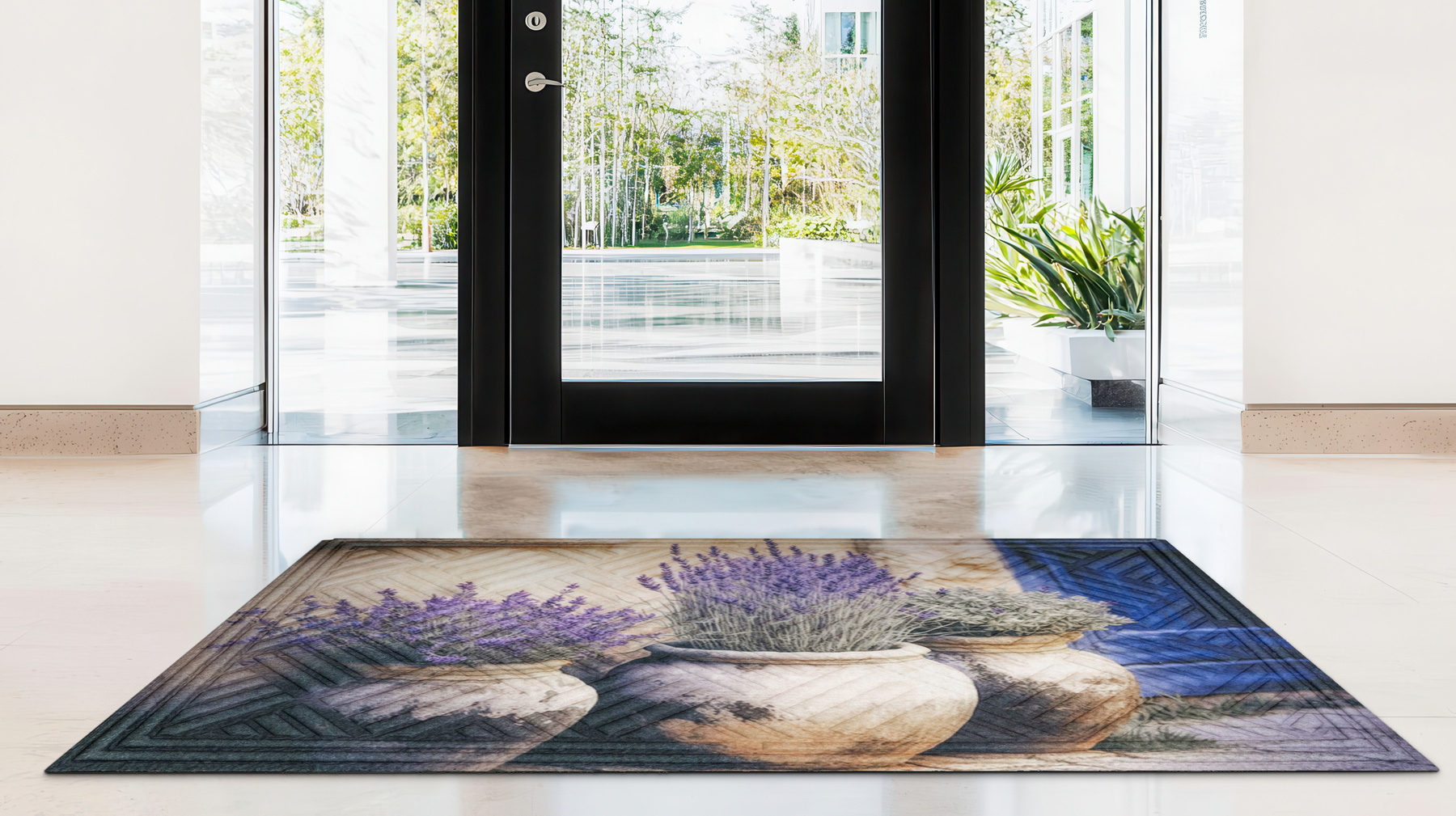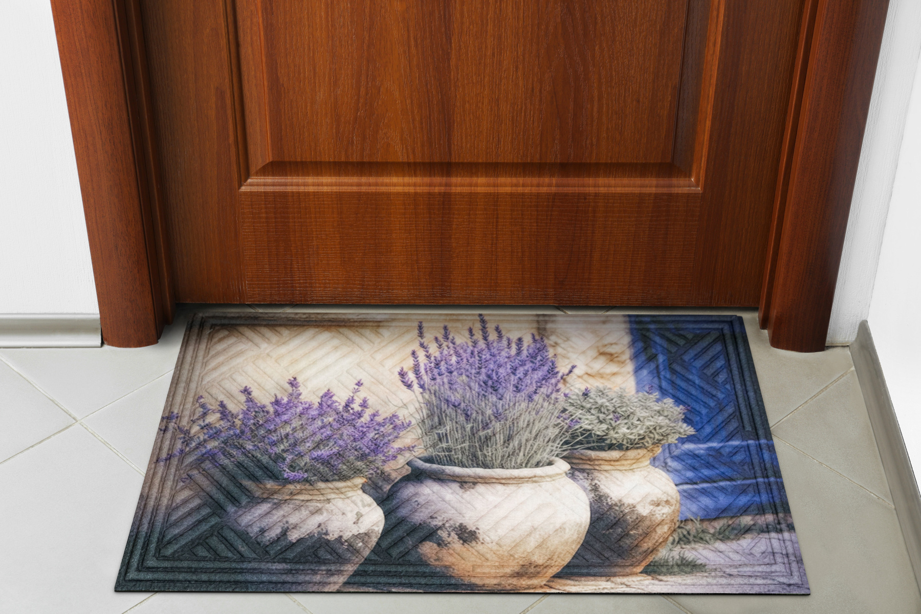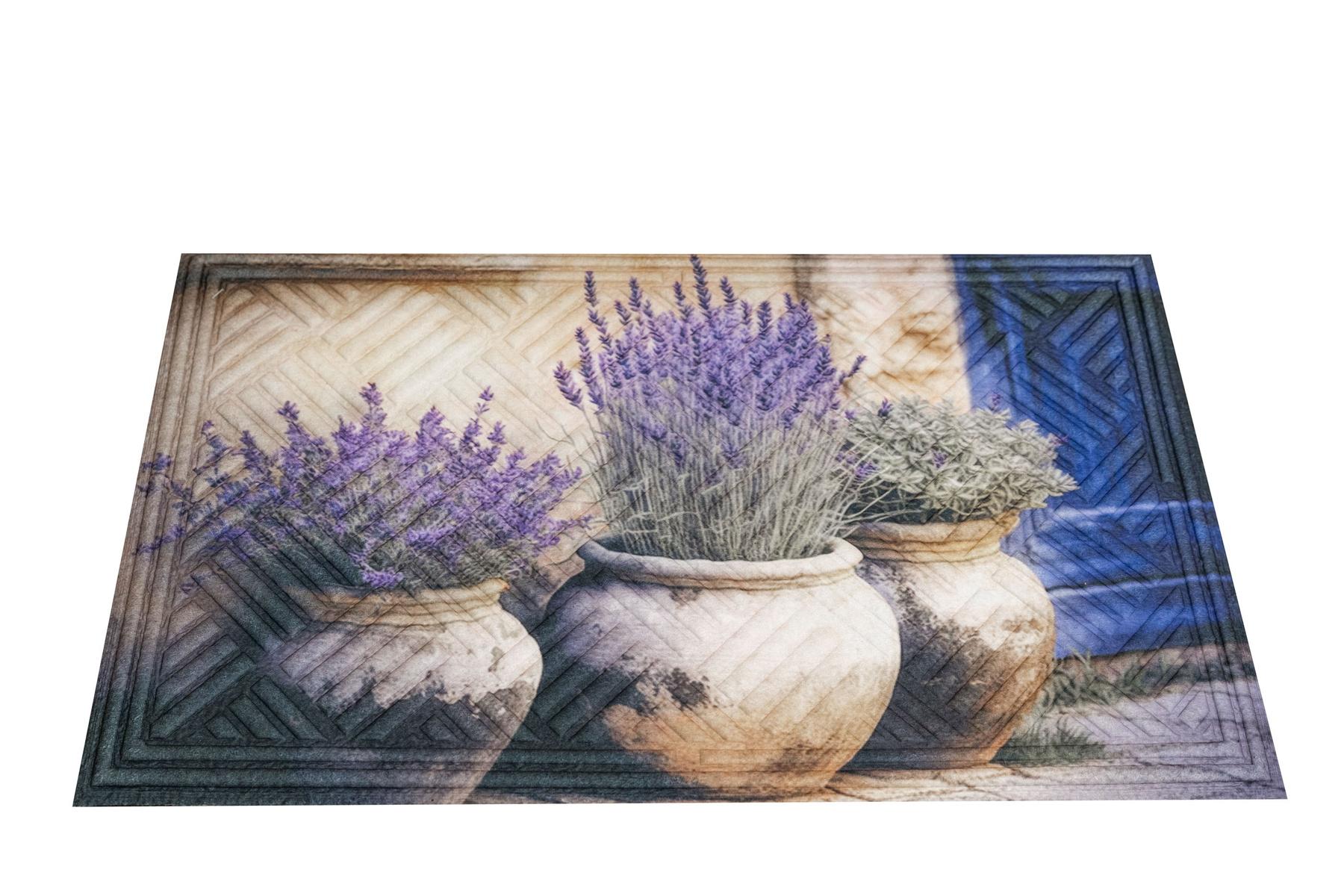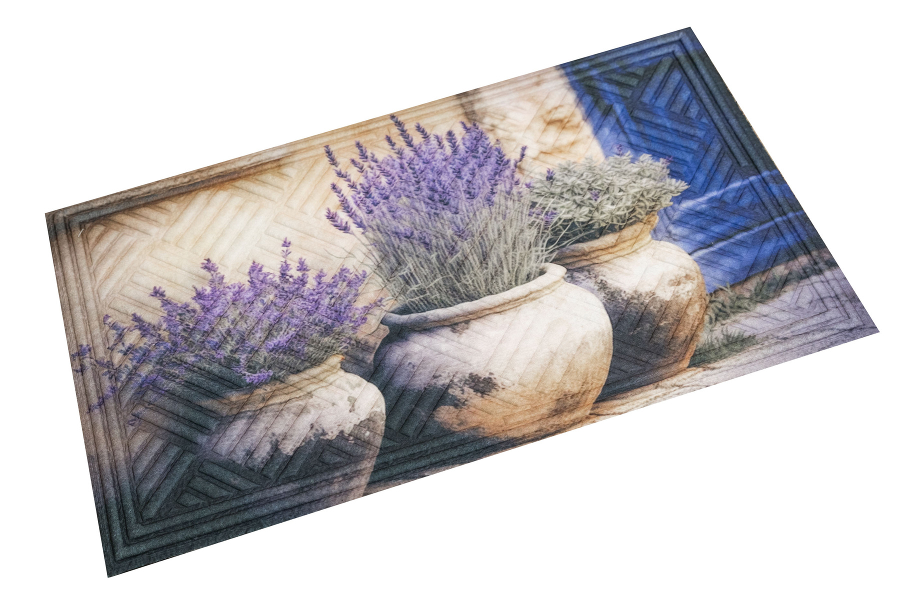 • Wycieraczka wejściowa antypoślizgowa, gruba, elastyczna, Kiri z karbowaną powierzchnią ozdobiona wzorem drukowanym przedstawiającym lawendę.