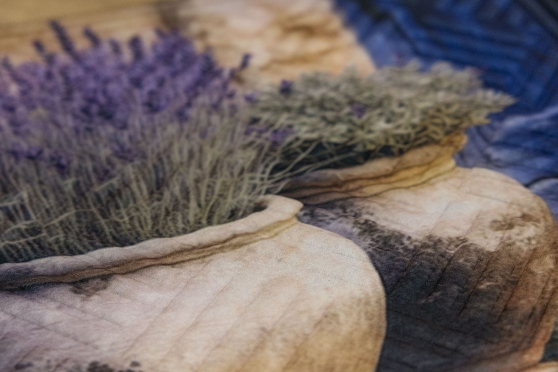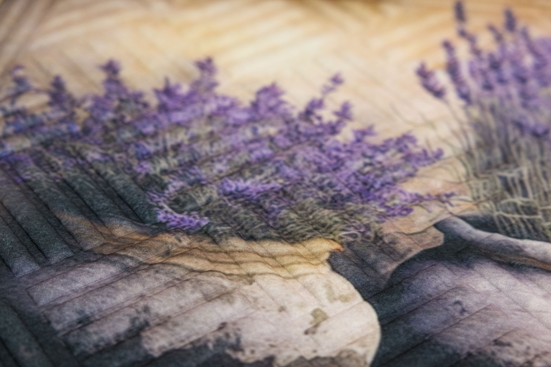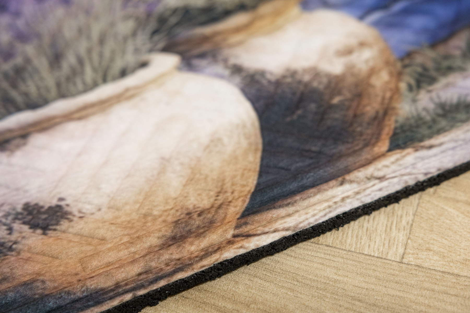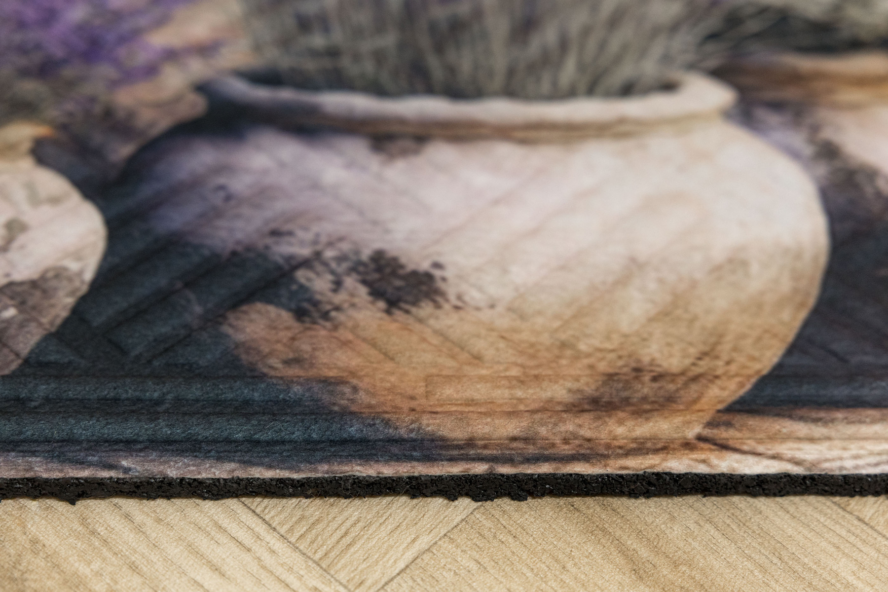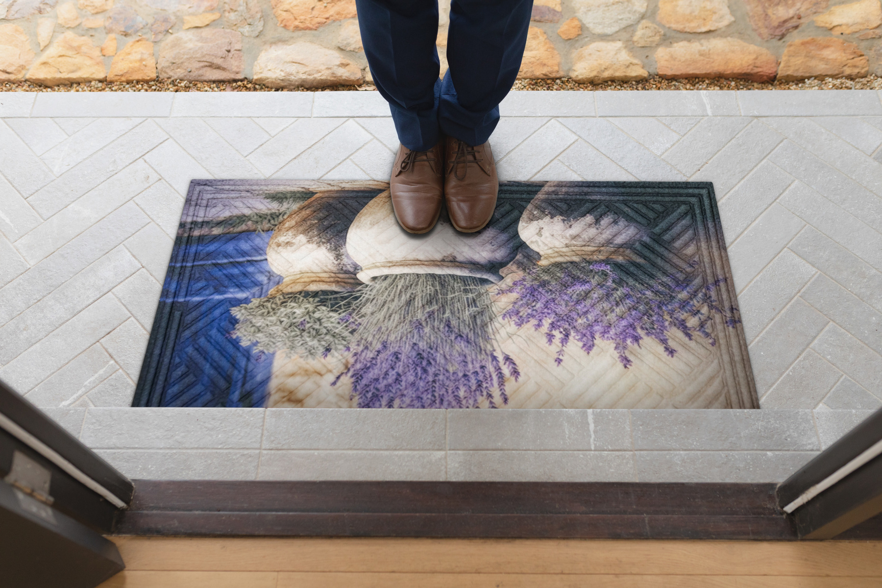• Wycieraczka wejściowa antypoślizgowa, gruba, elastyczna, Kiri z karbowaną powierzchnią ozdobiona wzorem drukowanym przedstawiającym lawendę.