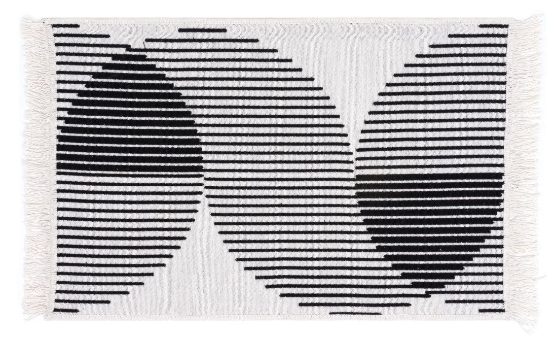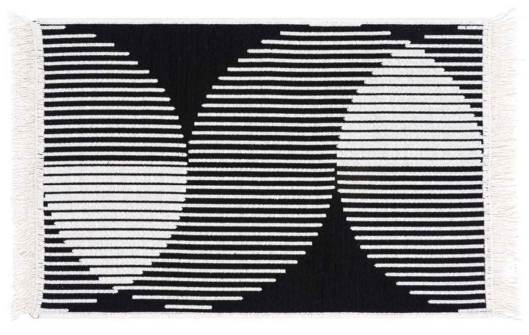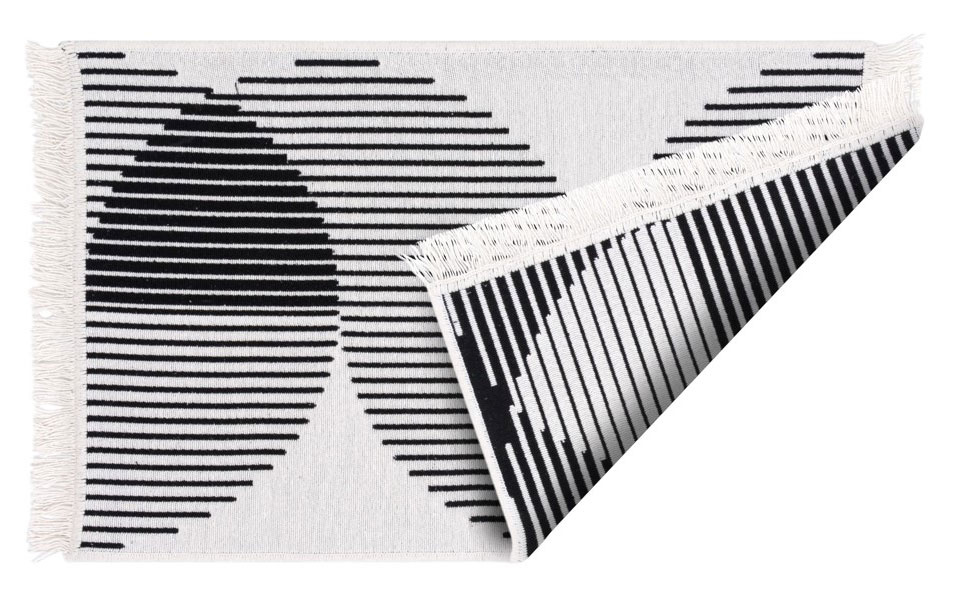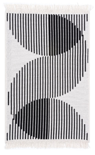 - Dwustronny, mięciutki dywanik - chodniczek Orient z geometrycznym wzorem w półkola i paski w czerni kontrastującej z kremem oraz delikatnymi frędzelkami.