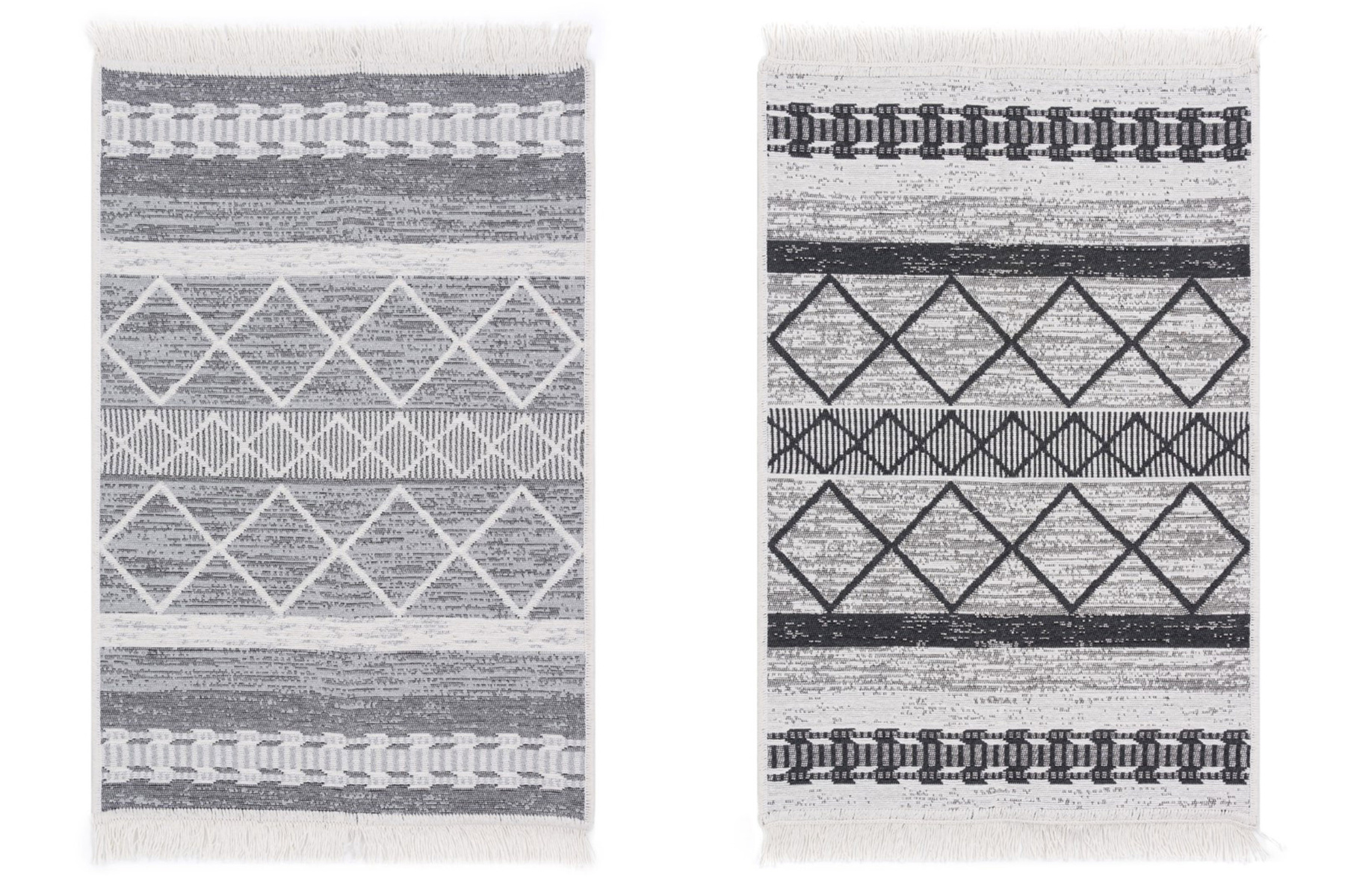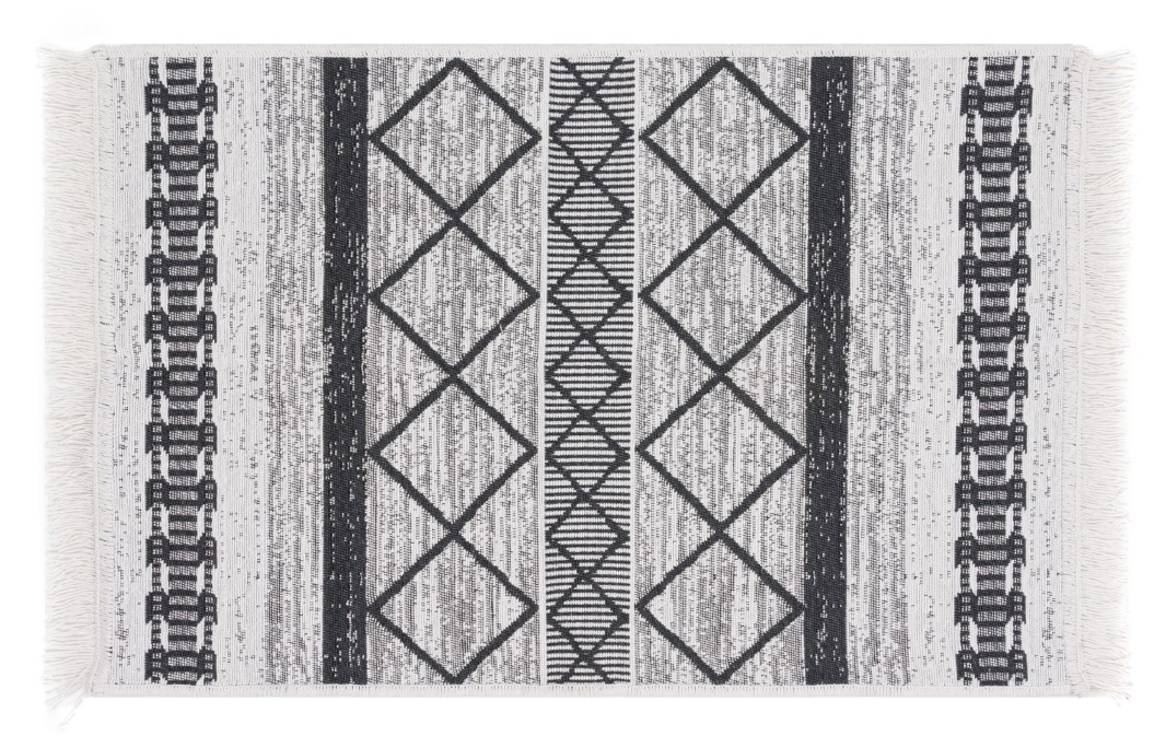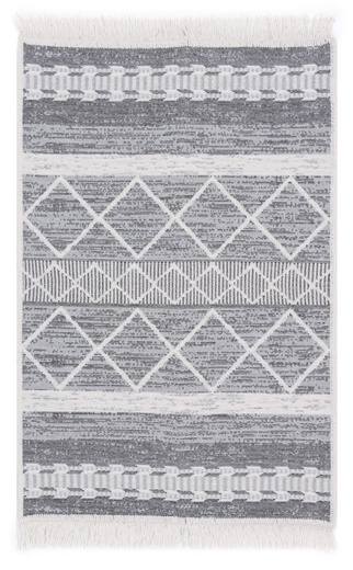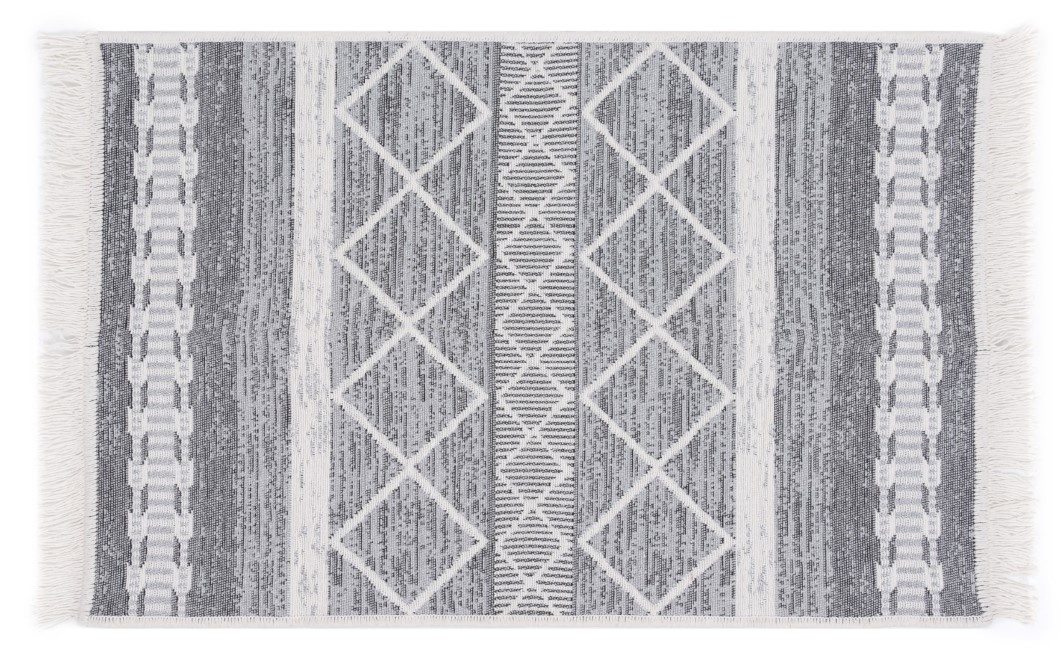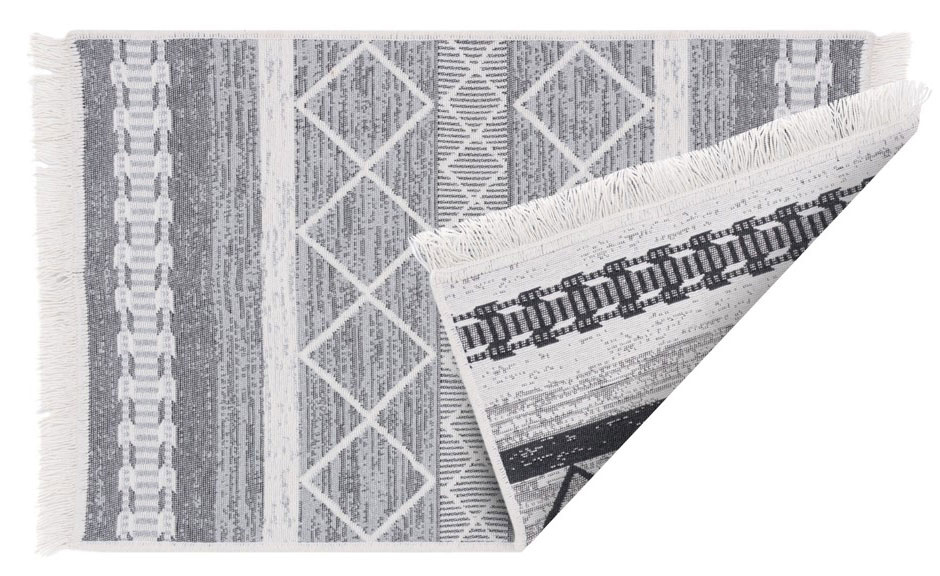 • Dwustronny, mięciutki dywanik - chodniczek Orient z geometrycznym wzorem w stylu etnicznym w romby, zygzaki i paski w szarościach kontrastujących z kremem oraz delikatnymi frędzelkami.